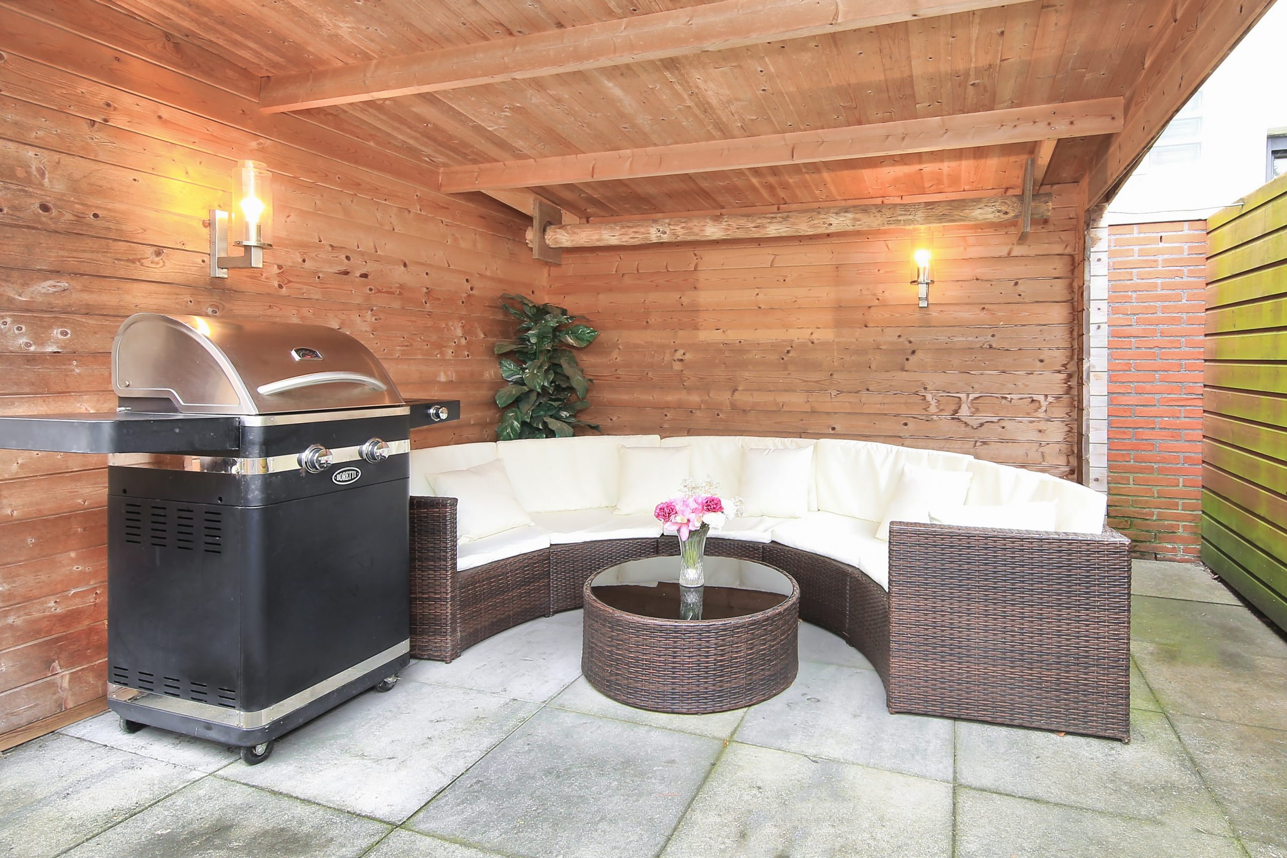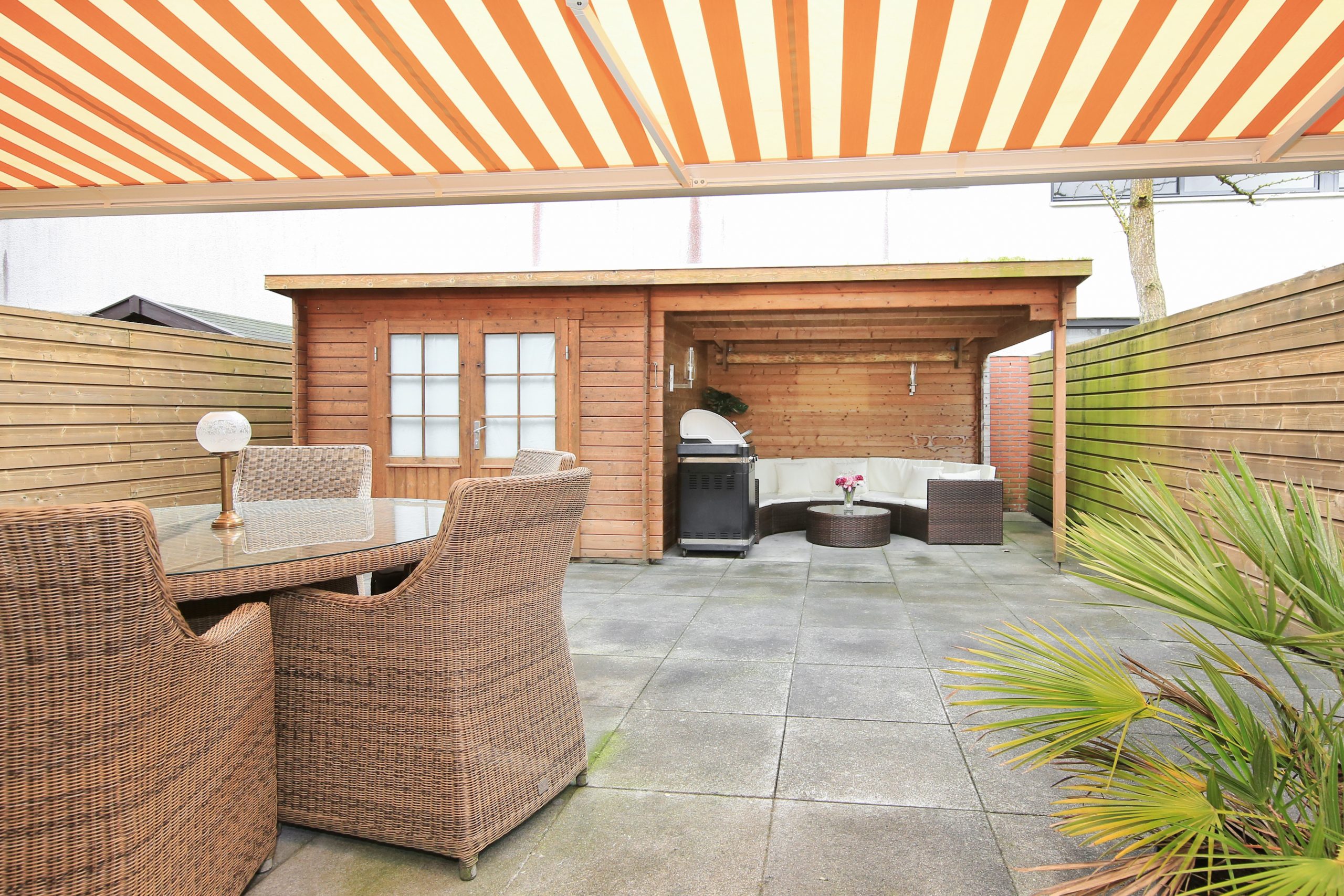 The south facing rear garden is approximately 8.3 metres deep and 7 metres wide. The garden is fully tiled and includes a wooden storage shed of approximately 8 m² with a wooden canopy of approximately 9 m². A full-width electric sun awning is installed on the rear façade.
