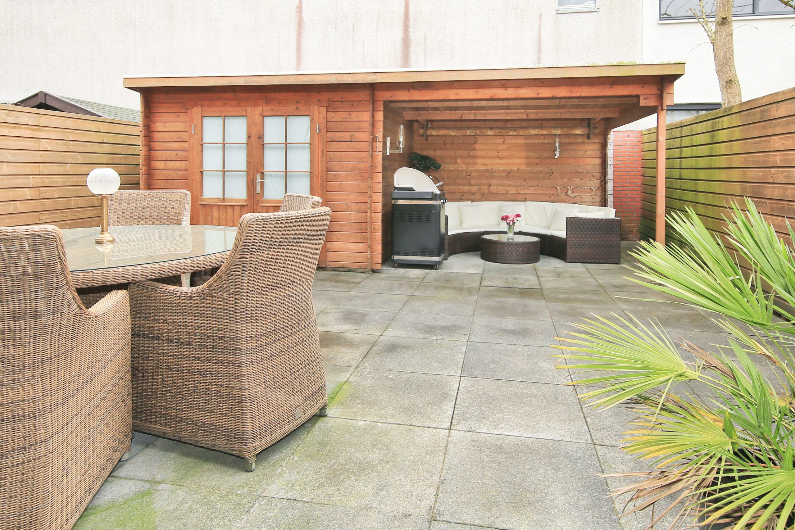De op het zuiden gelegen achtertuin is circa 8,3 meter diep en circa 7 meter breed. Deze tuin is volledig betegeld en voorzien van een houten berging van circa 8 m² met houten overkapping van circa 9 m².