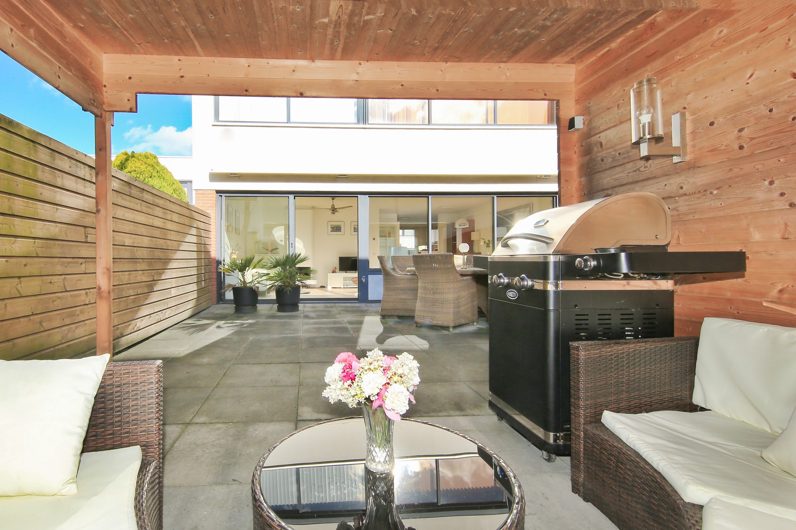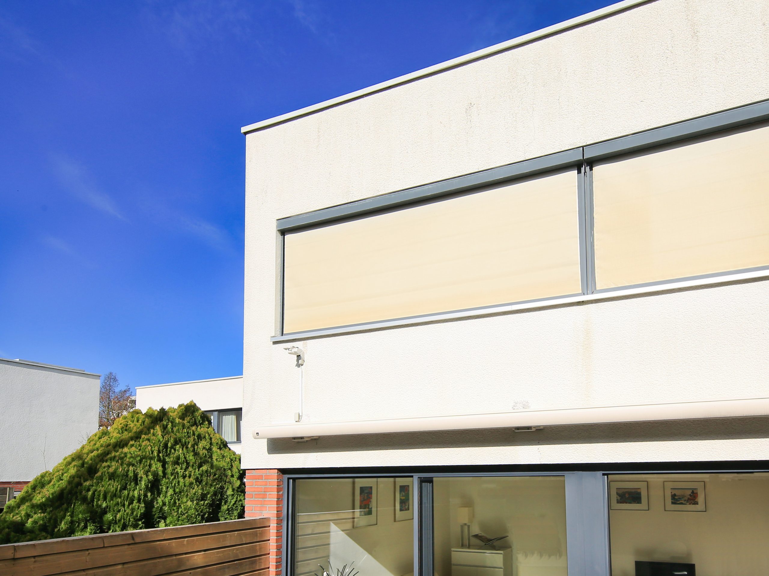Aan de achtergevel van de woning is een gevelbreed elektrisch zonnescherm aanwezig.