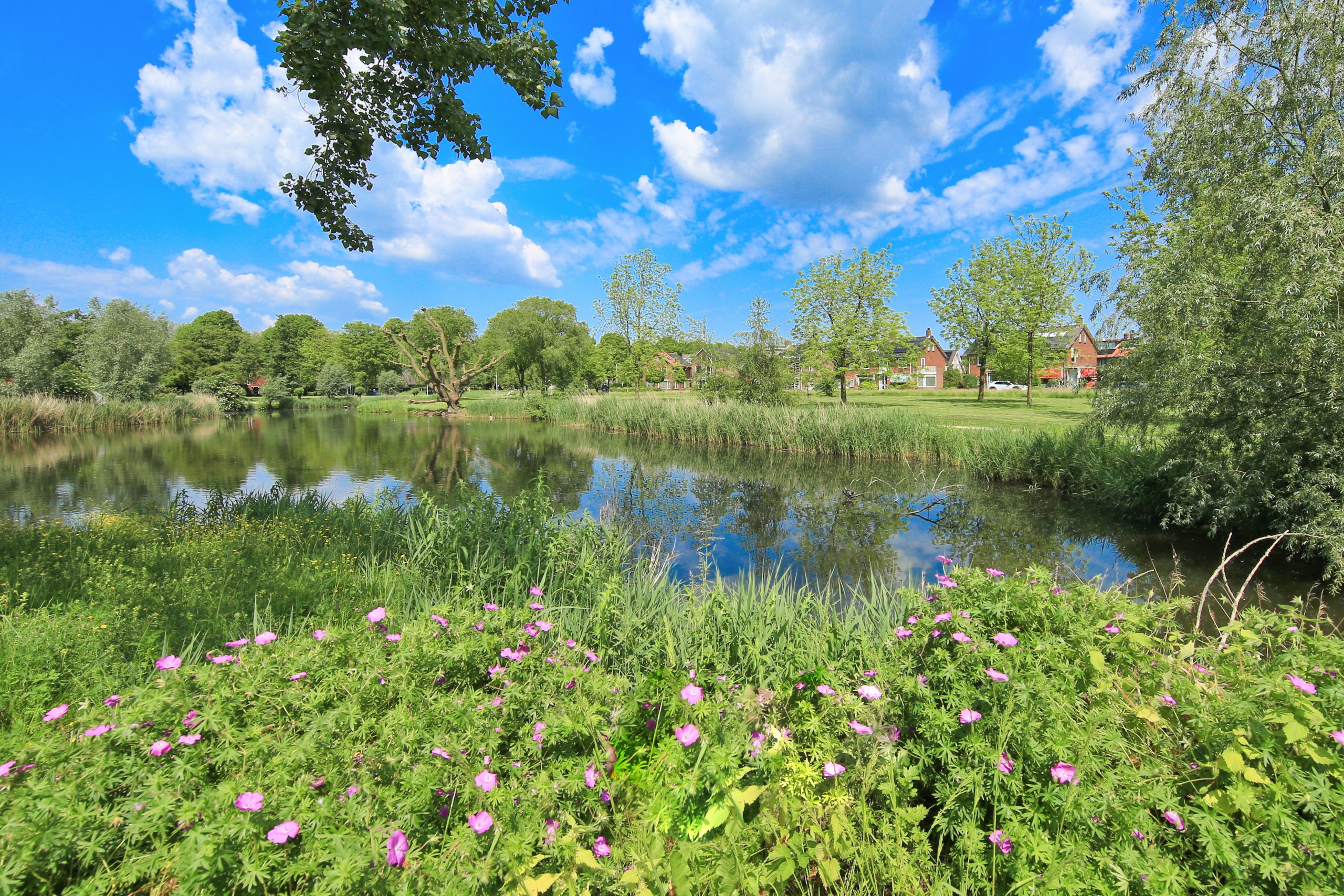 Zomers kijk je met lentekriebels vrij weg richting het groen rondom de vijver, ’s winters speelt zich een lieflijk tafereel af op hetzelfde ijs