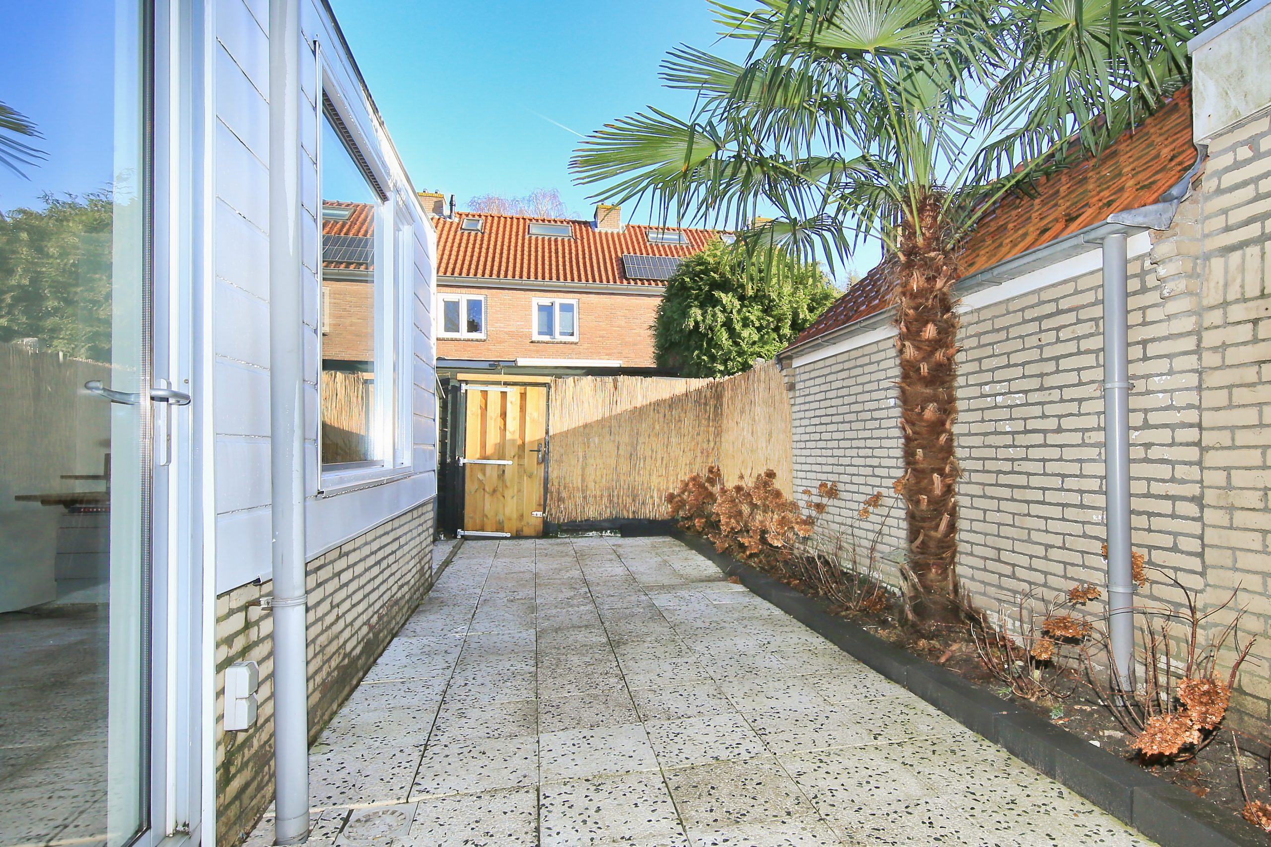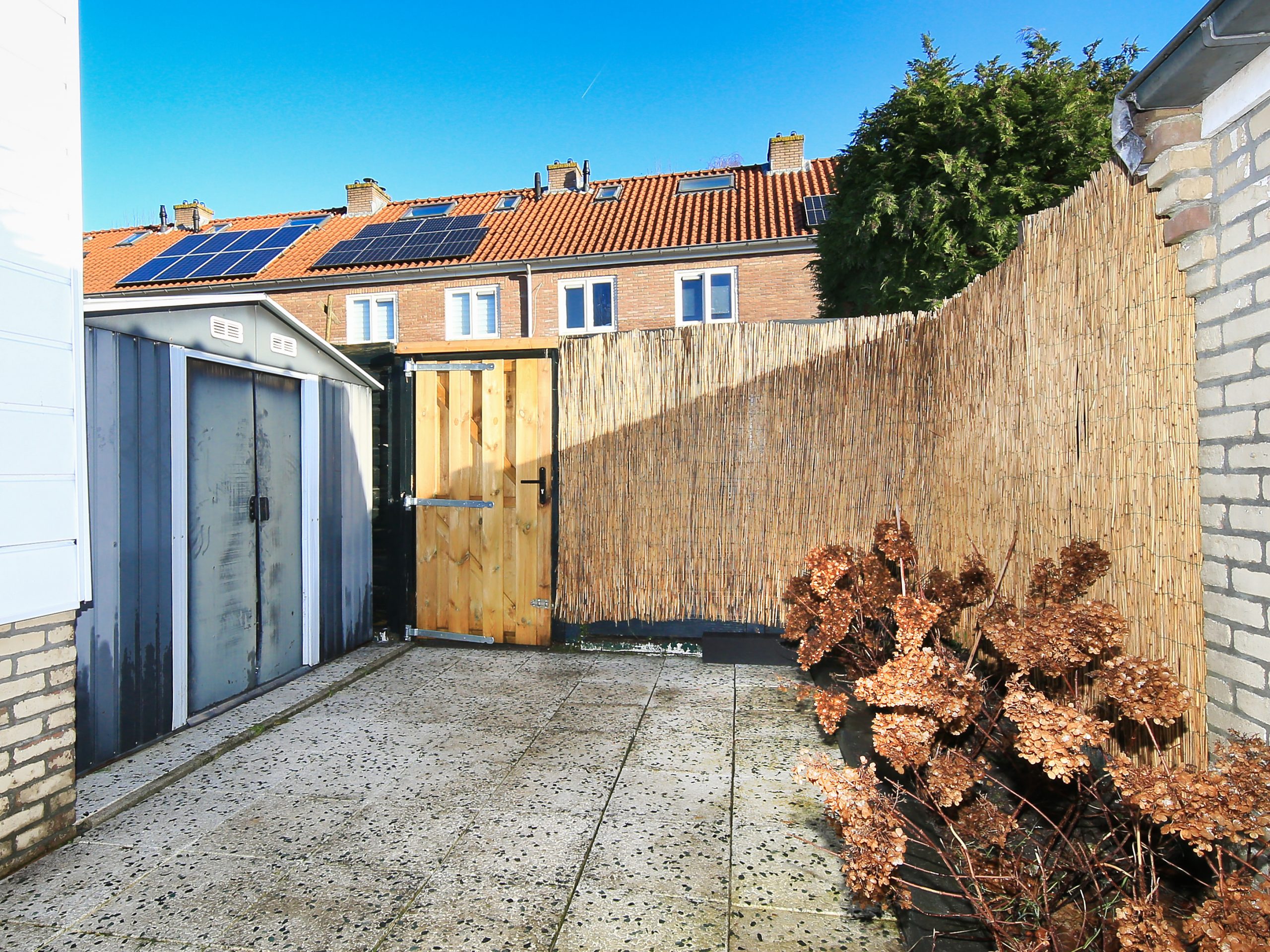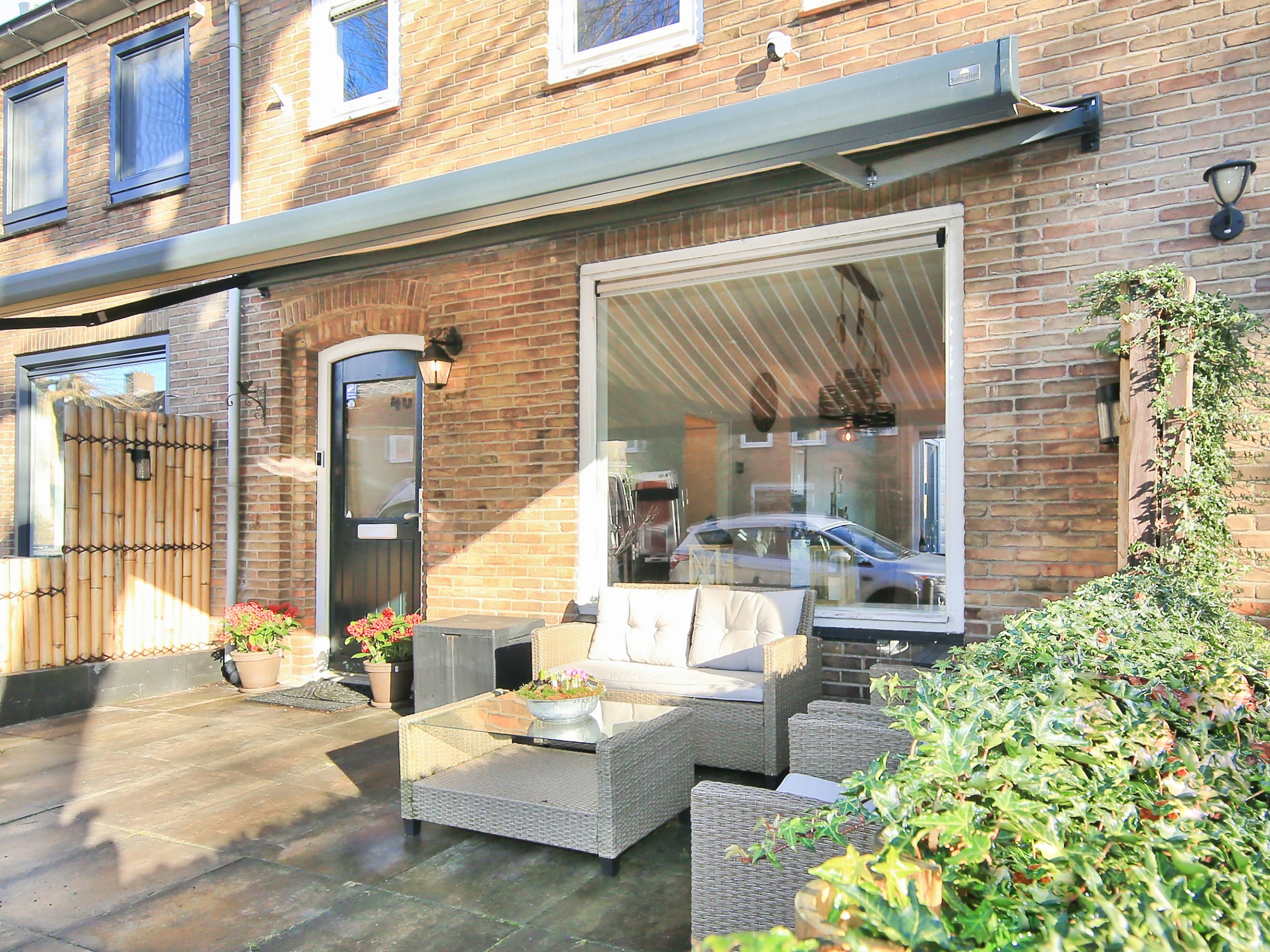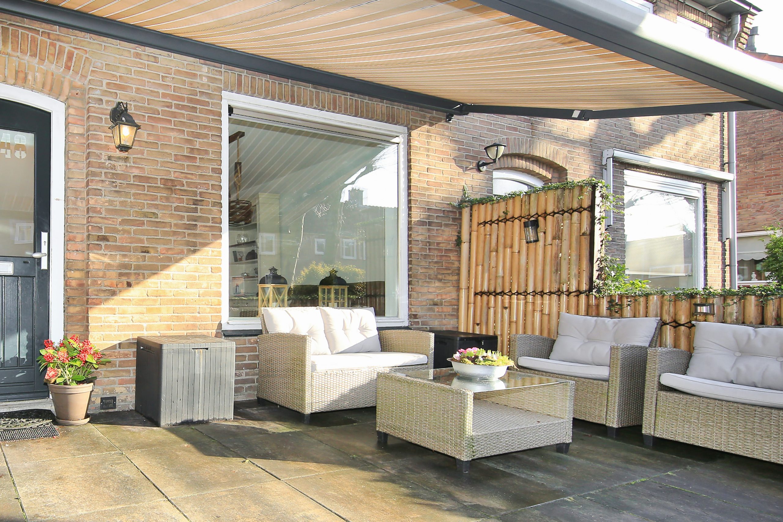 The front garden faces northwest, is approximately 4.6 meters deep and about 5.5 meters wide, and is fully paved. A wonderful spot to enjoy the evening sun. For optional shade, the front façade is fitted with a façade-wide awning.
