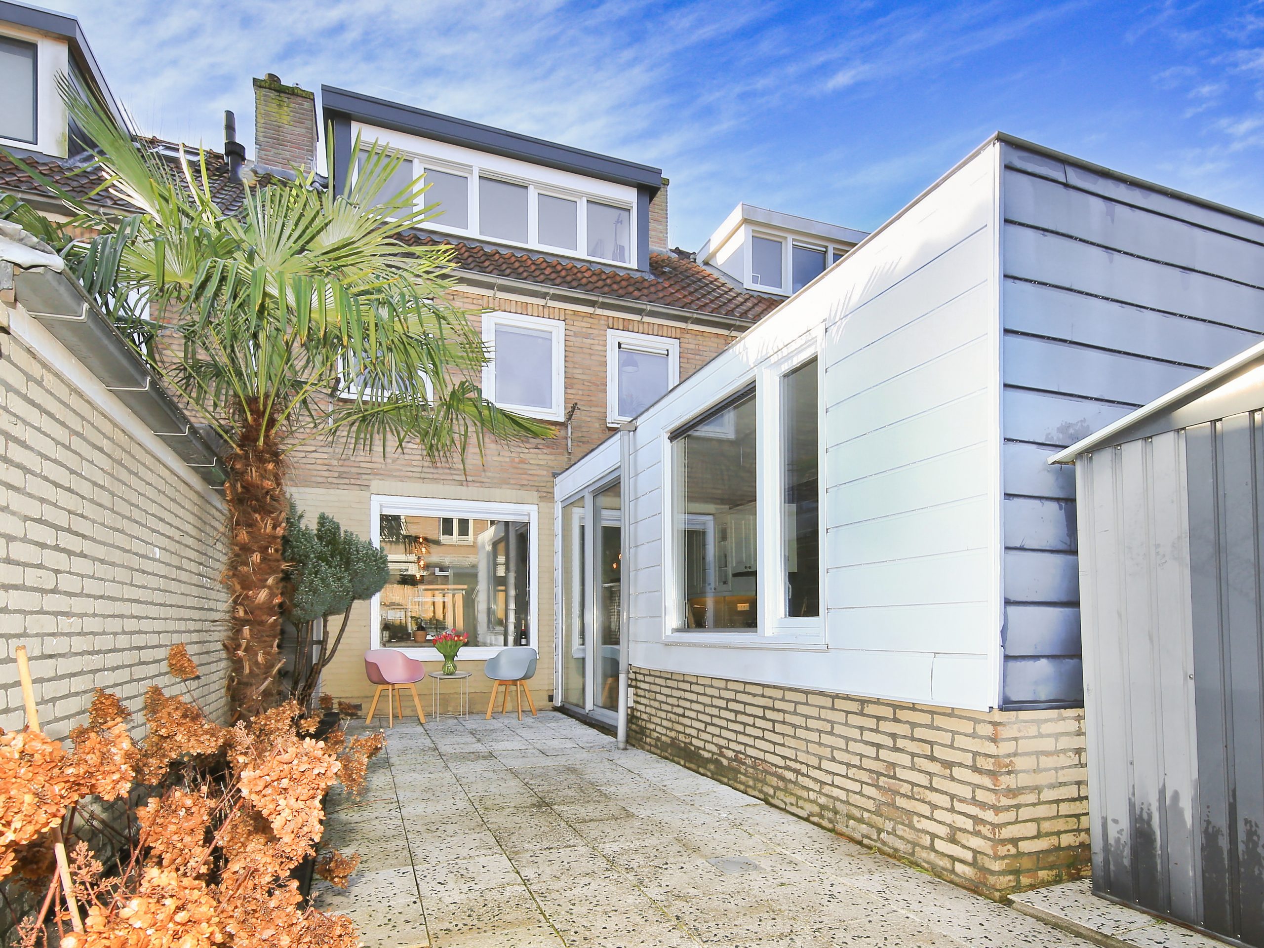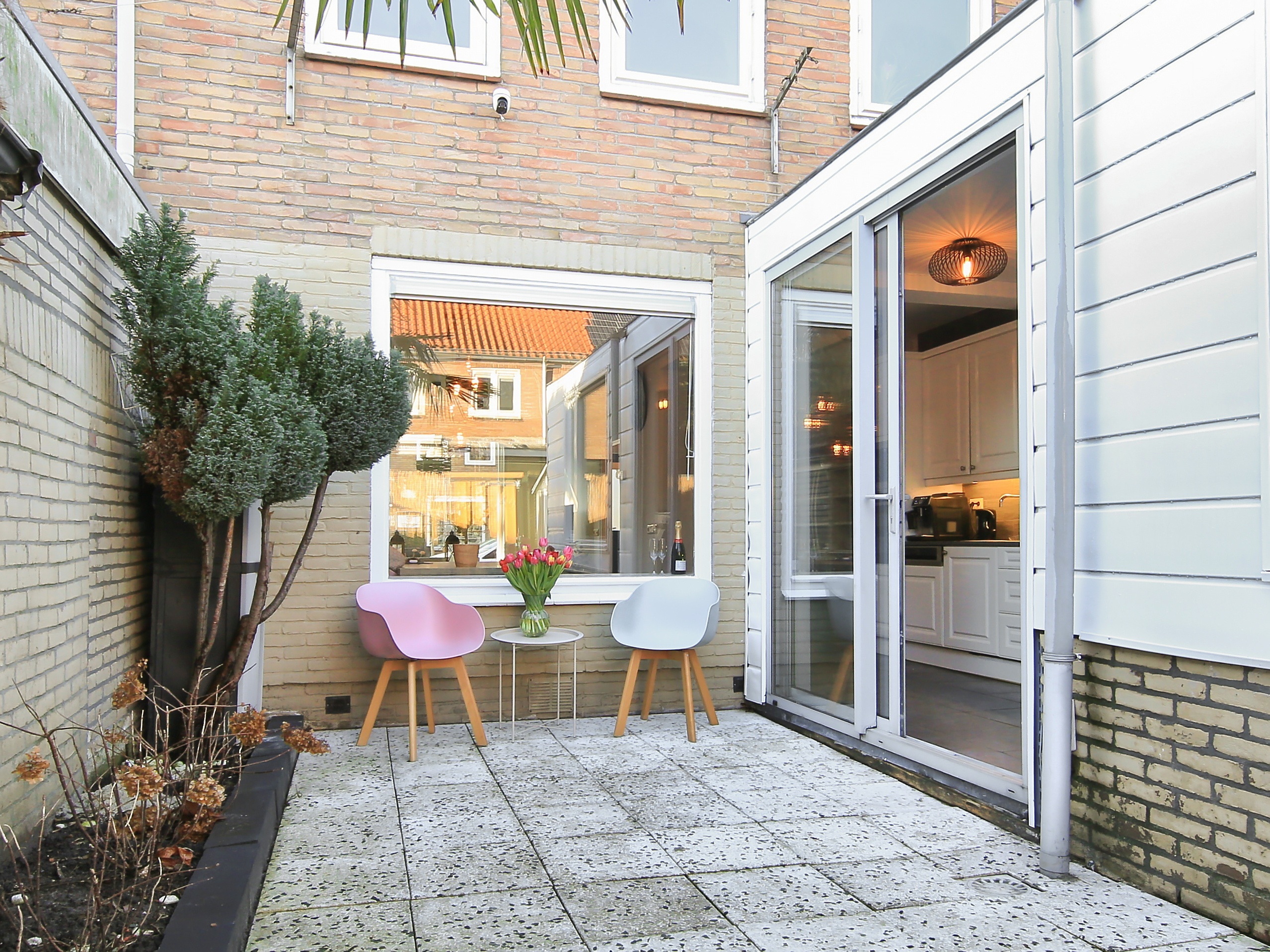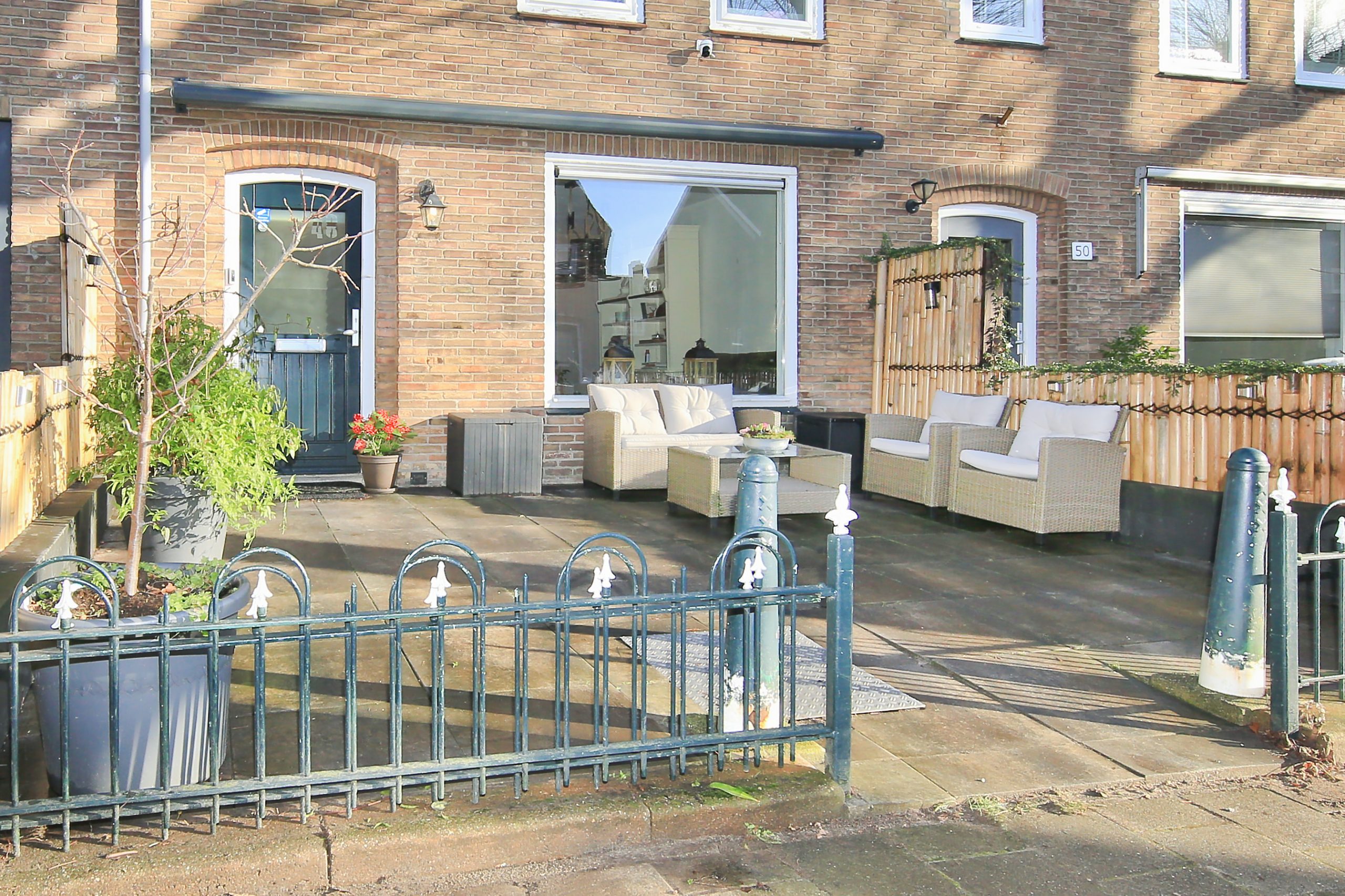 The front garden faces northwest, is approximately 4.6 meters deep and about 5.5 meters wide, and is fully paved. A wonderful spot to enjoy the evening sun. For optional shade, the front façade is fitted with a façade-wide awning.