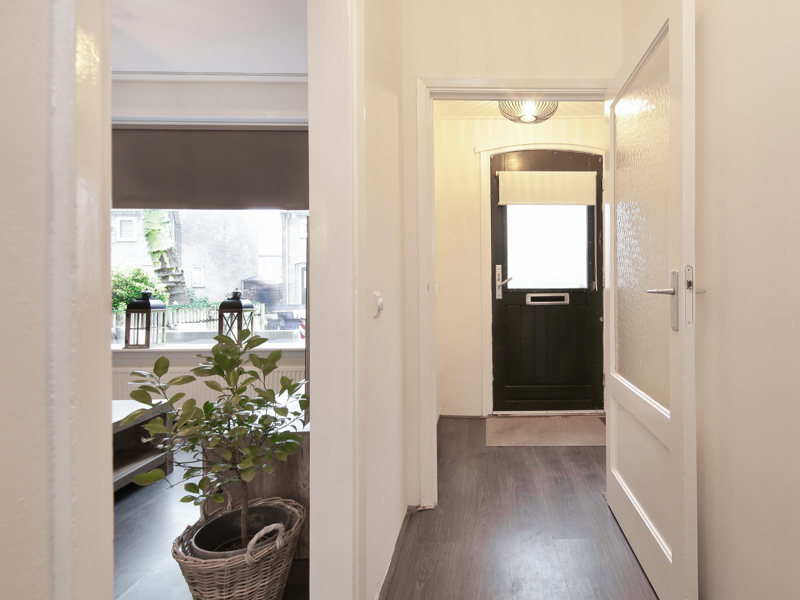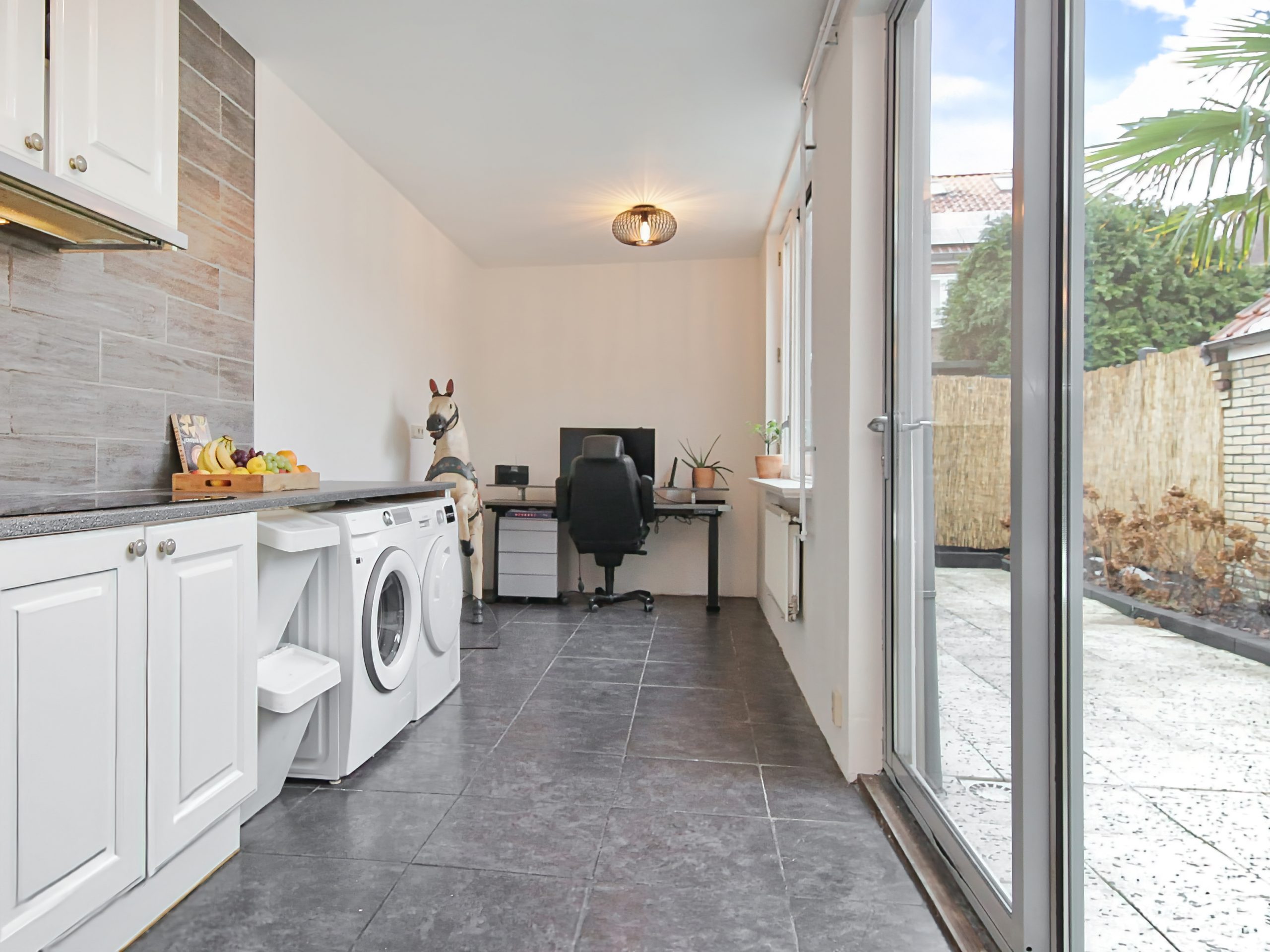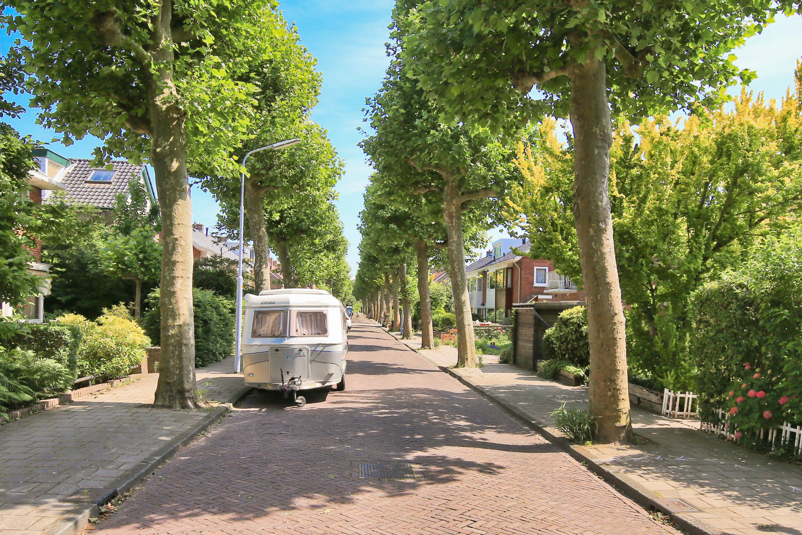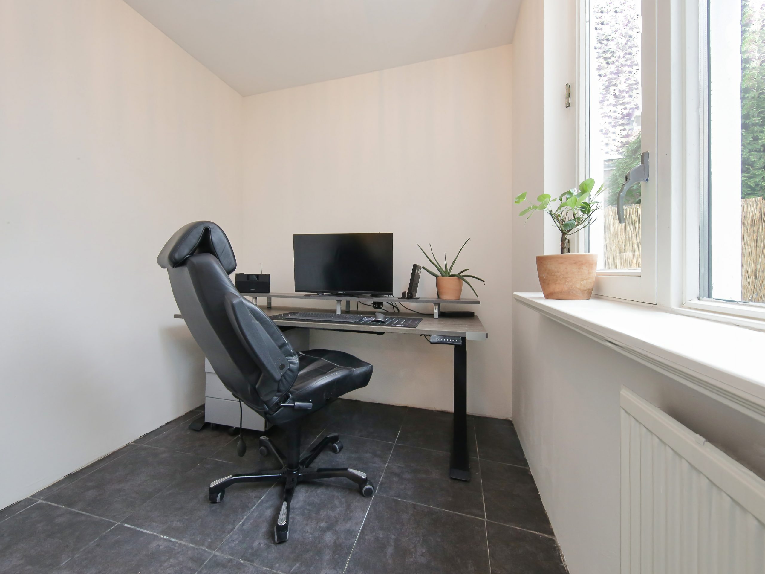 The front garden faces northwest, is approximately 4.6 meters deep and about 5.5 meters wide, and is fully paved. A wonderful spot to enjoy the evening sun. For optional shade, the front façade is fitted with a façade-wide awning.