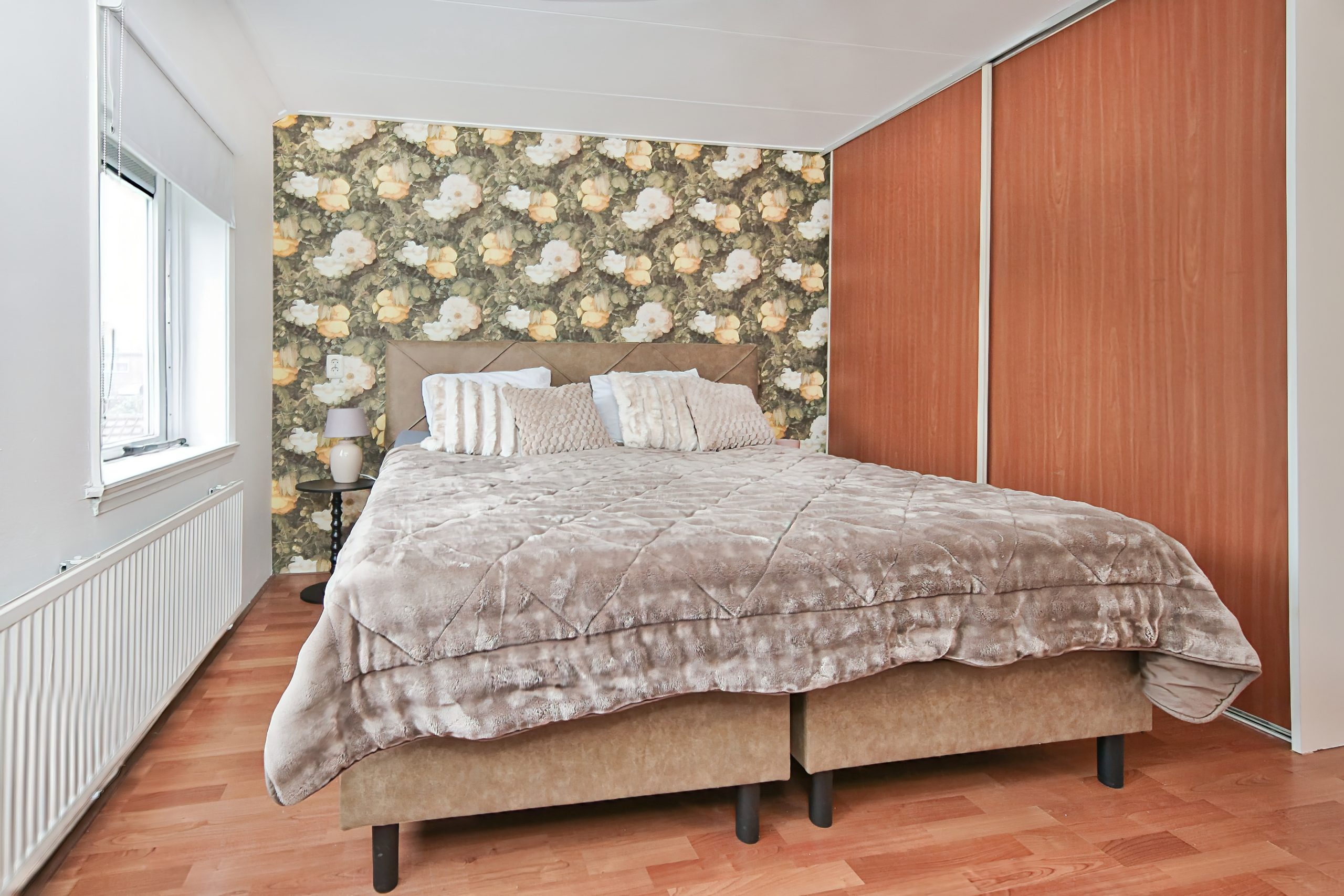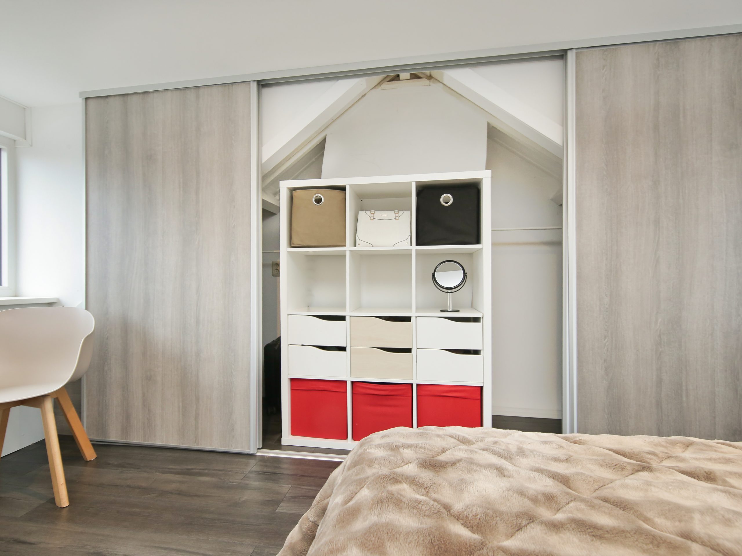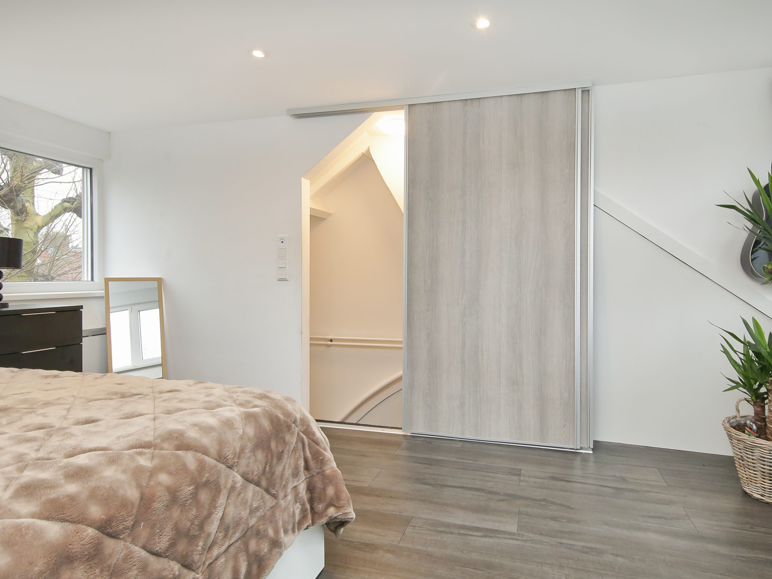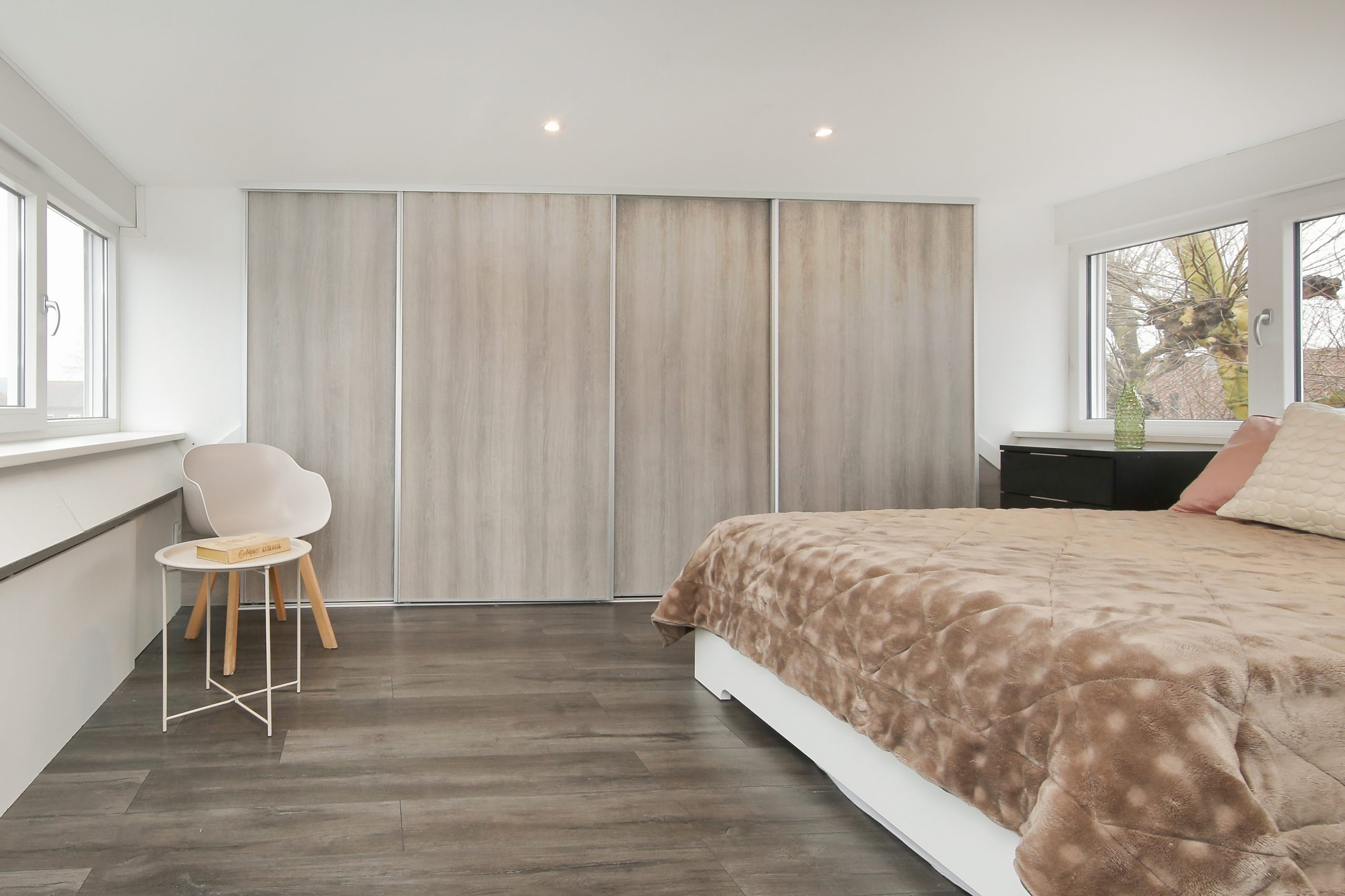 Via de overloop is er via een schuifdeur toegang tot de vierde slaapkamer van ruim 15 m² met aan de voor- en achterzijde brede dakkapellen met elektrische rolluiken en onder de knieschotten veel bergruimte. Tevens is deze kamer voorzien van een grote kast met schuifdeuren en een kast met de cv-opstelling.