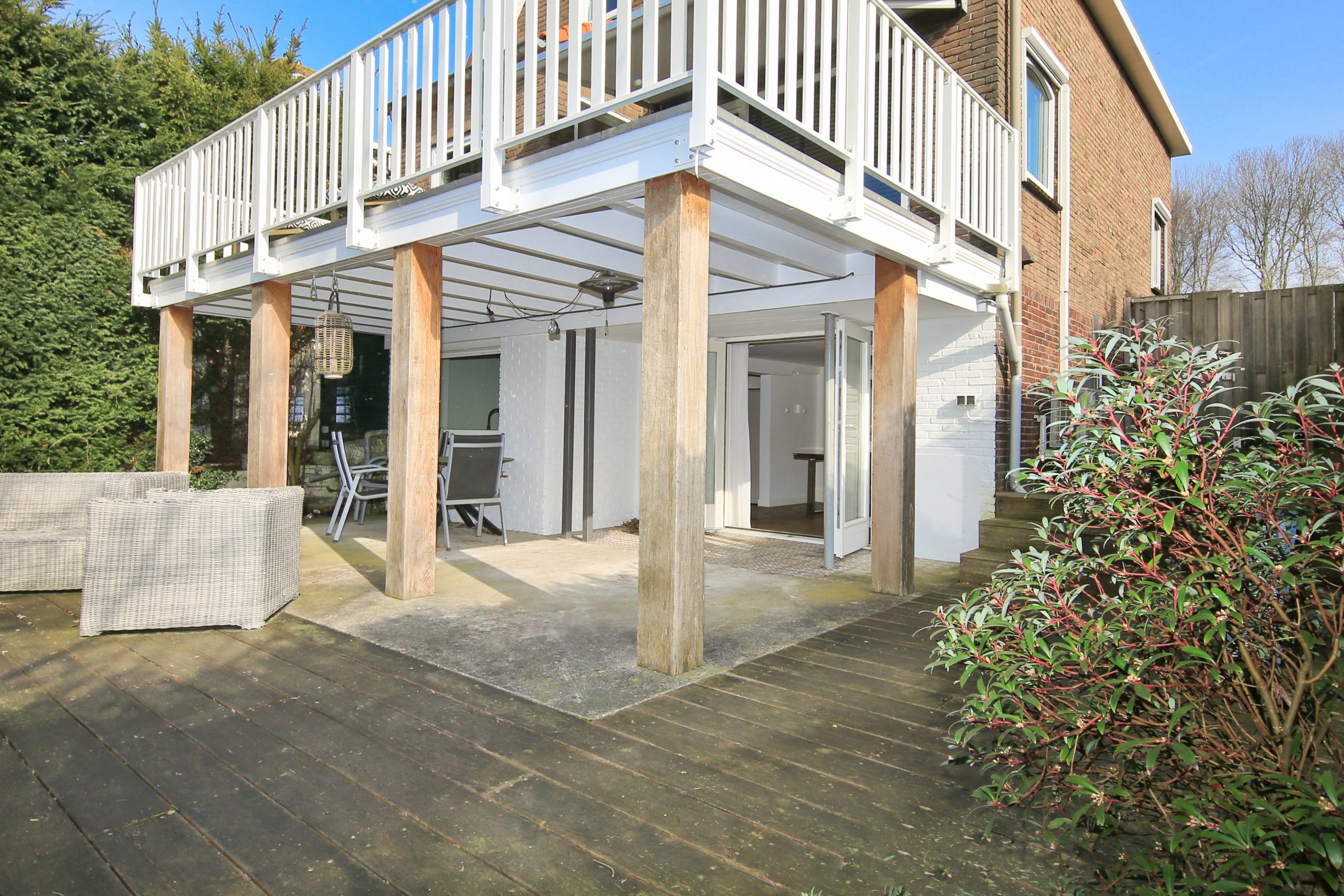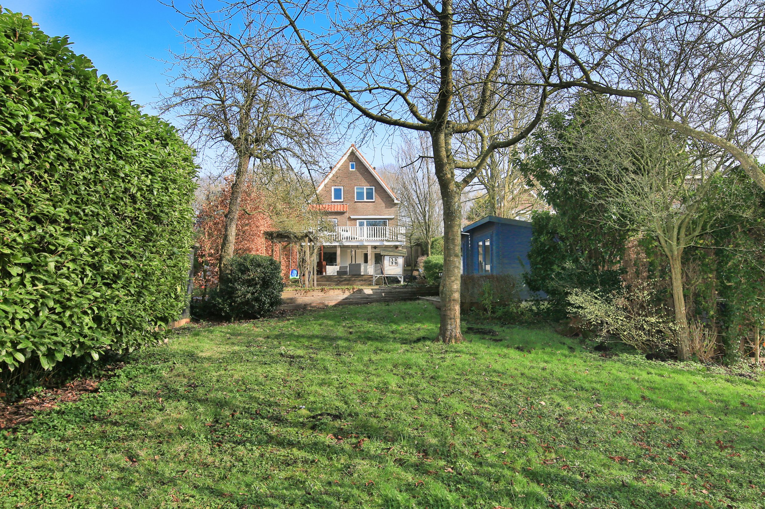 De riante achtertuin is gelegen op het westen, circa 42 meter diep en circa 11 meter breed en heeft drie niveaus. Het eerst niveau is deels met een betonnen vloer (veranda gedeelte) en deels een hardhouten terras. Het iets lager gelegen tweede niveau is voorzien van een terras met klinkers. En het nog iets lager gelegen derde niveau is voorzien van gras, twee vrijstaande houten bergingen met openslaande deuren, diverse fruitbomen en vaste planten. Tevens is er een achterom aanwezig.