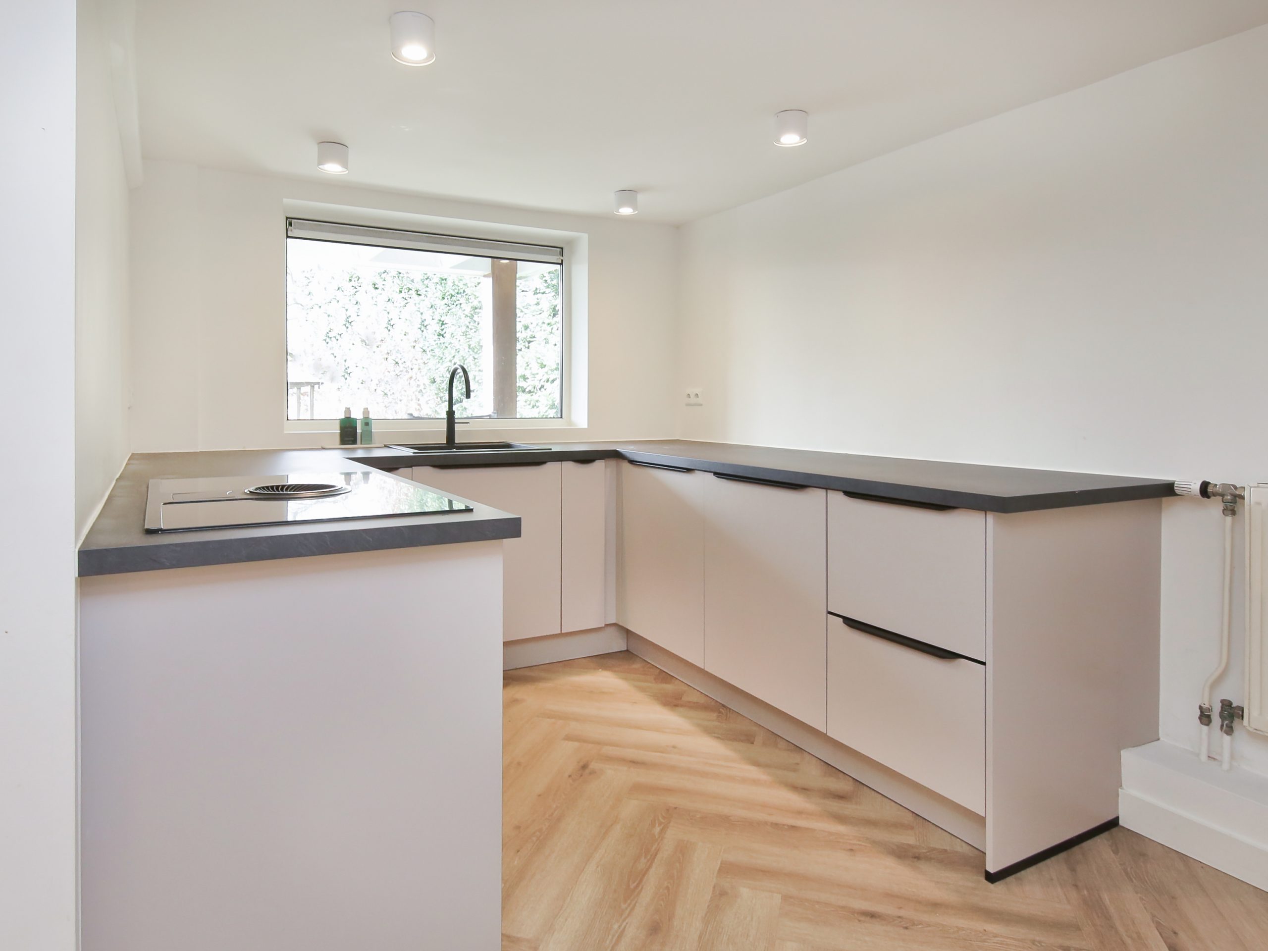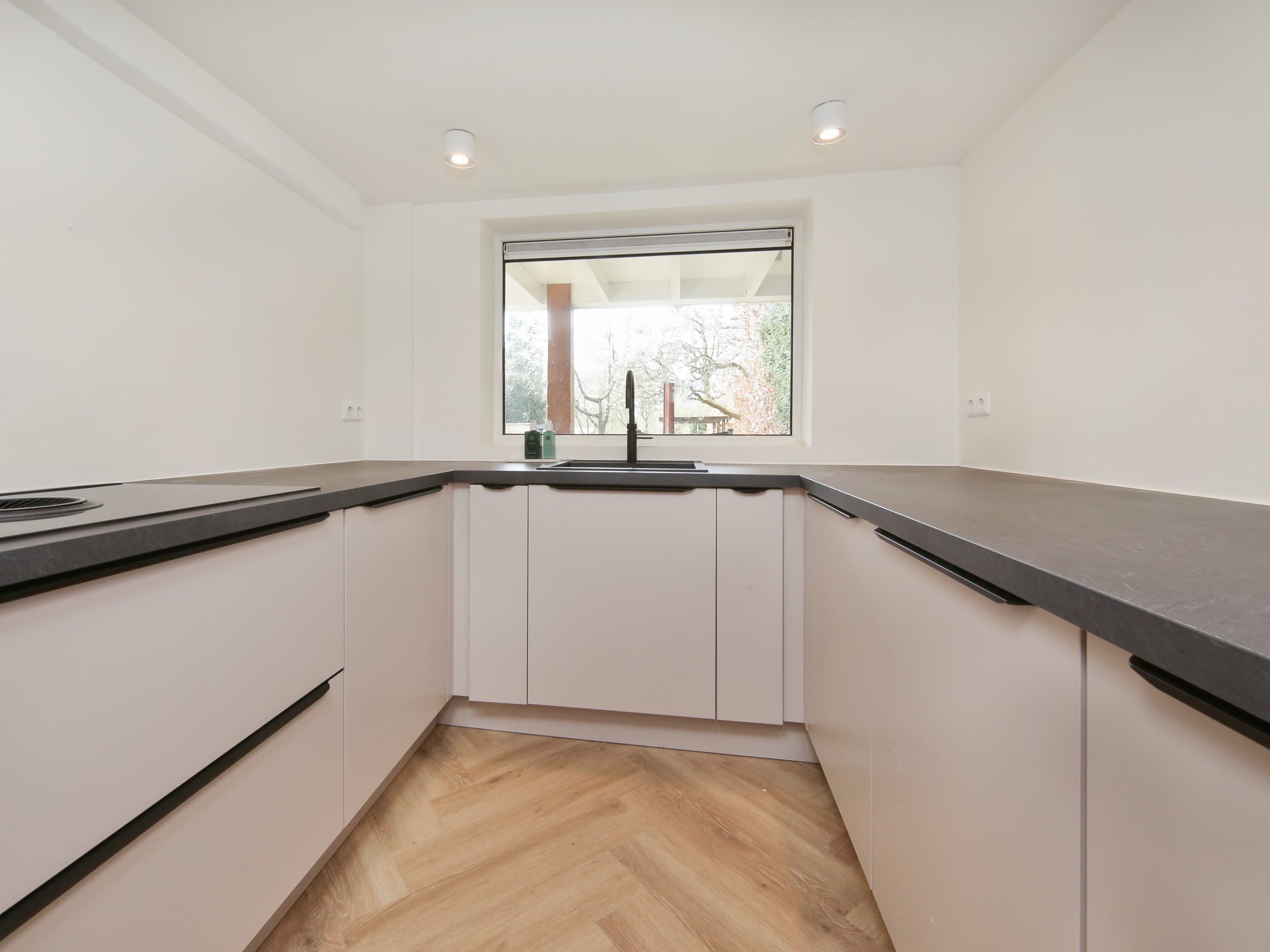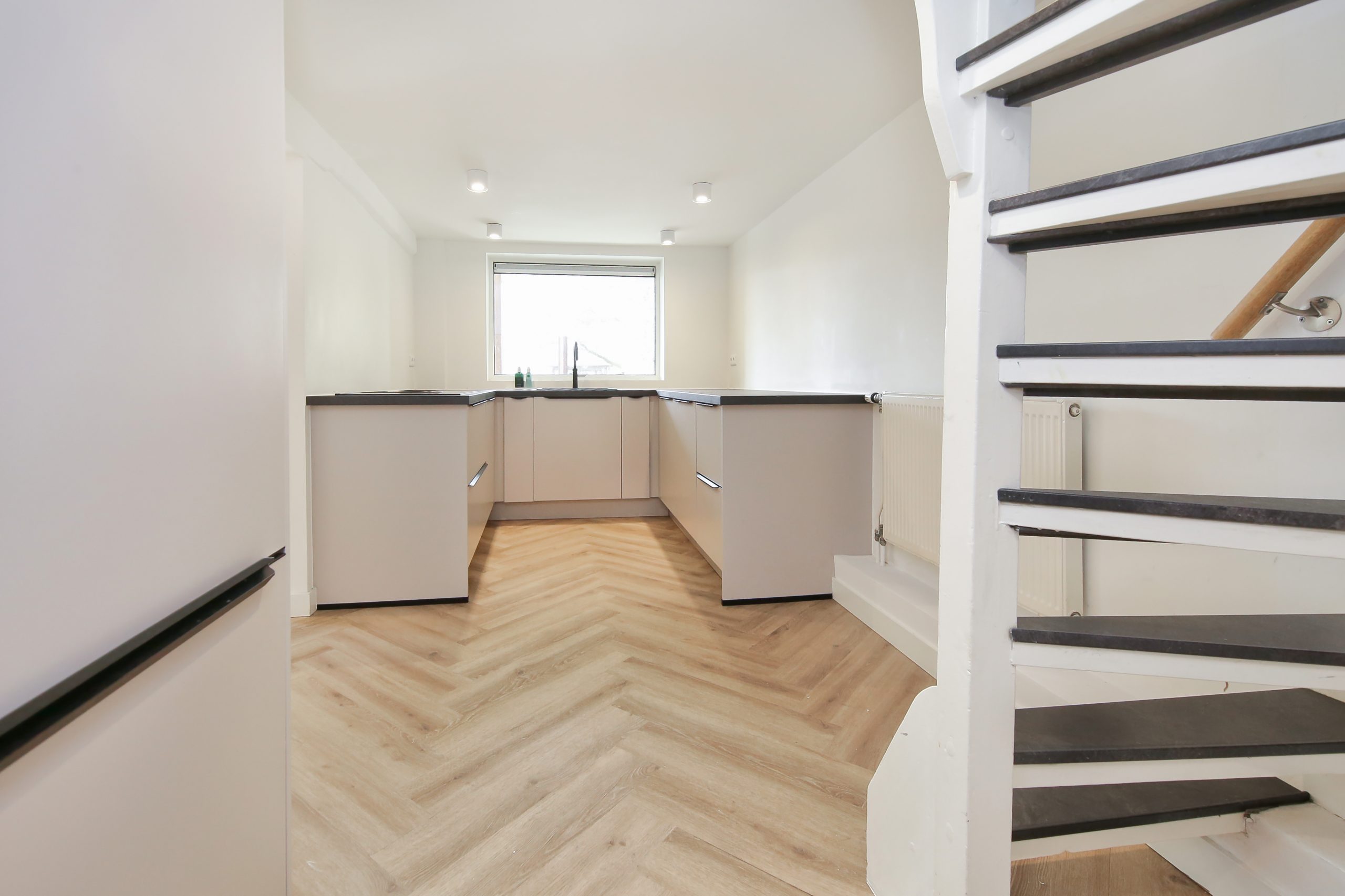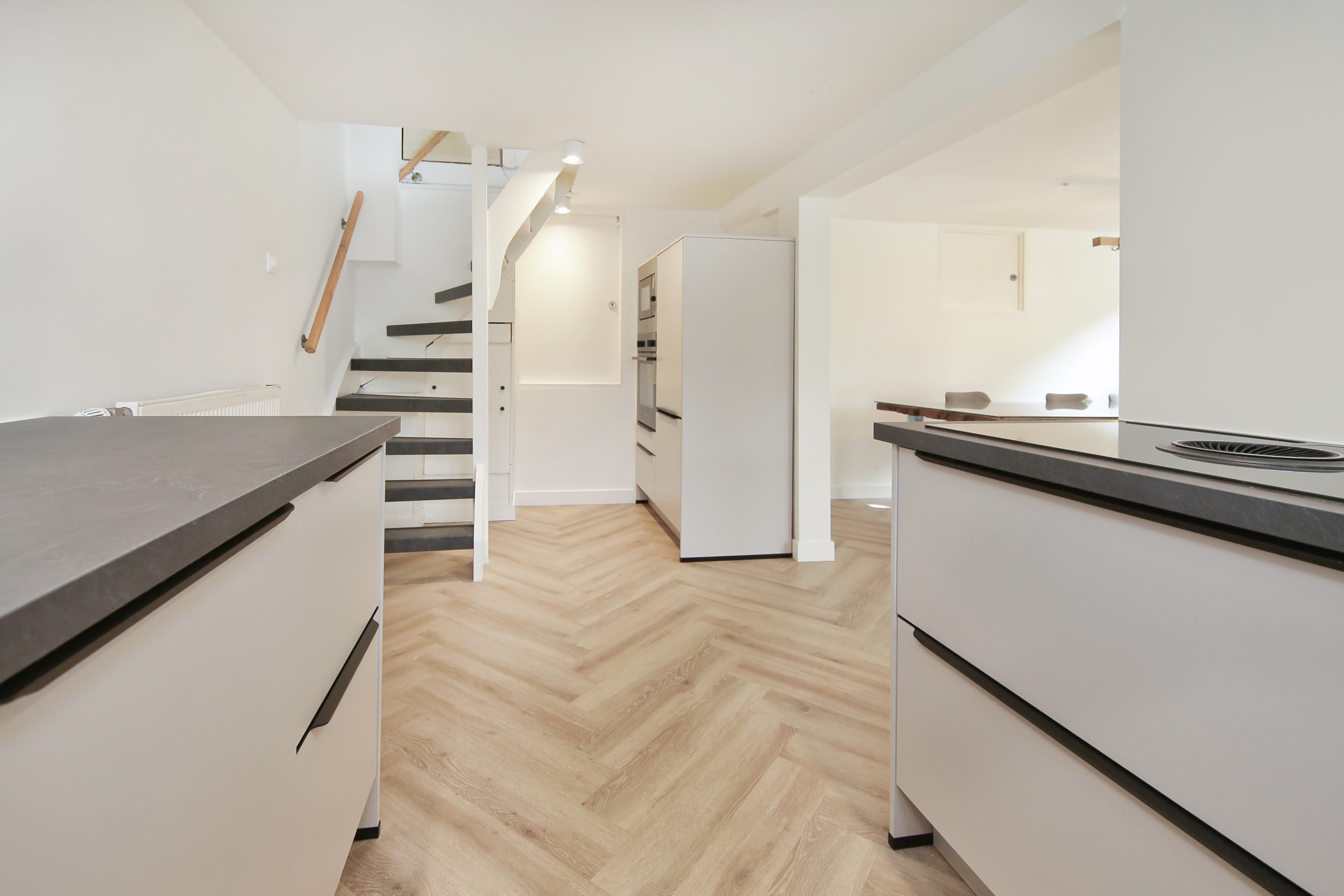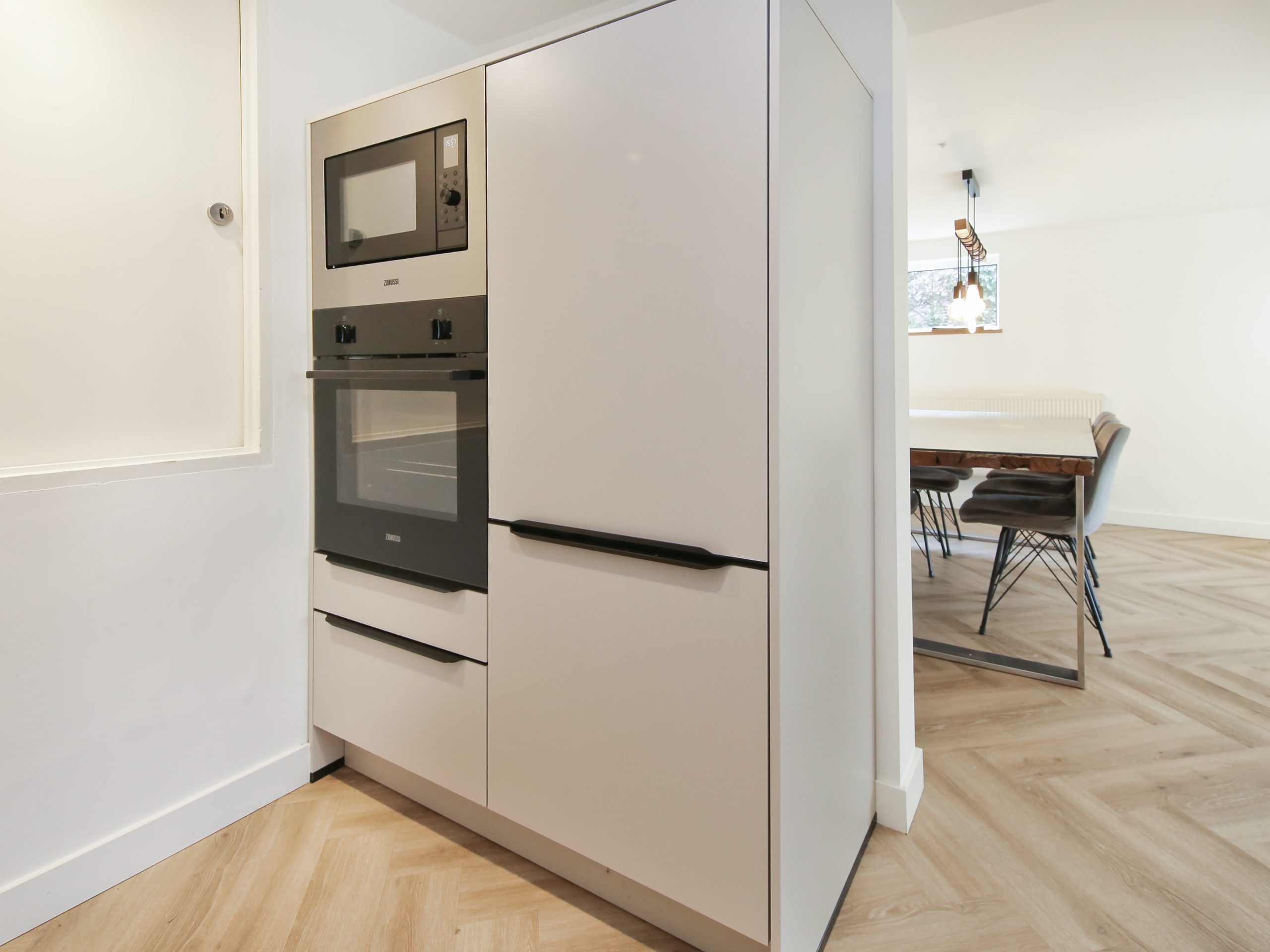 Open woonkeuken van circa 12 m² met keukenblok in U-opstelling met diverse inbouwapparatuur, vernieuwd in 2023, en een eet/tuinkamer van circa 15 m² met openslaande deuren naar de achtertuin met een veranda met daarop aangesloten een hardhouten terras. De cv-opstelling is geplaatst in een kast onder de trap.