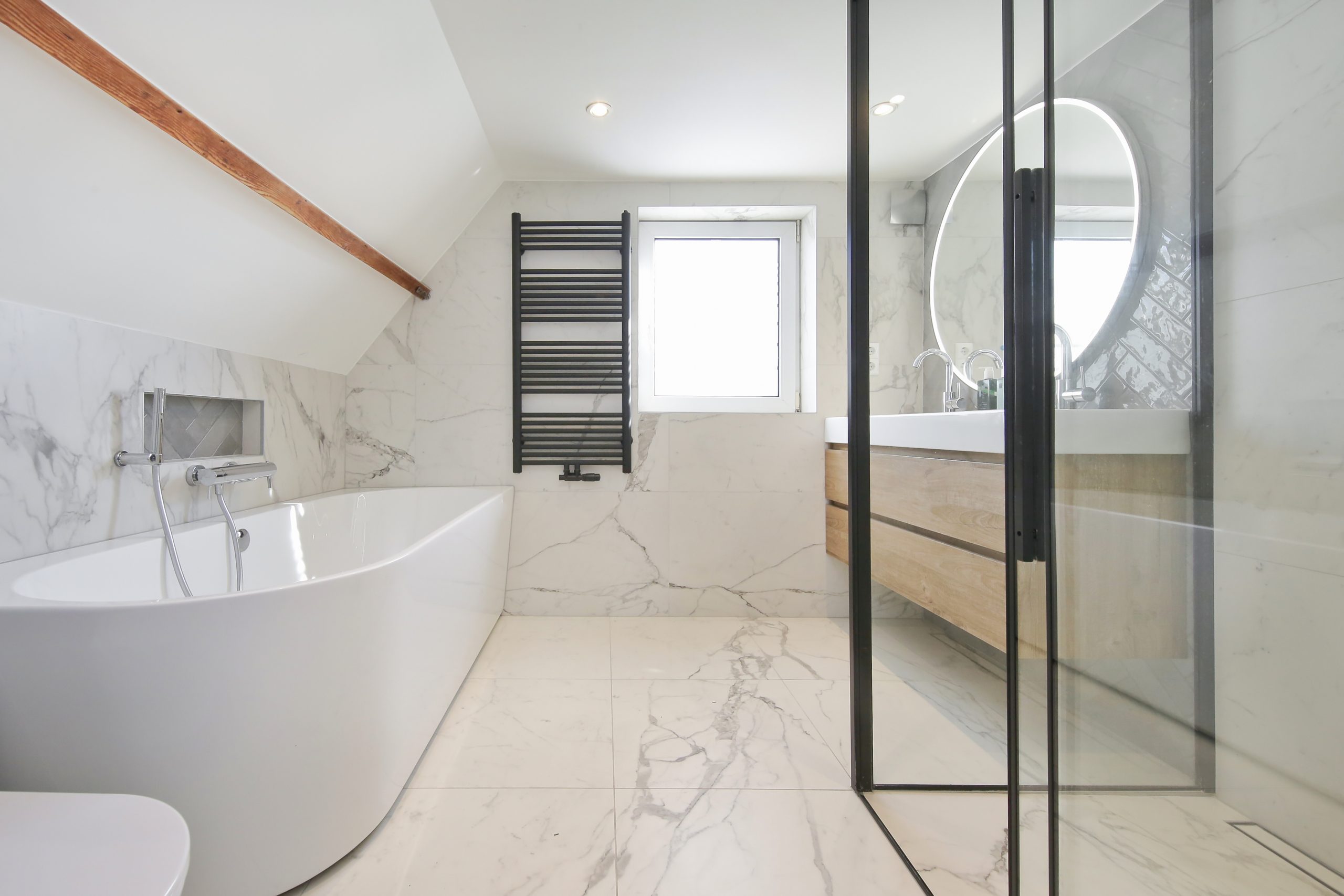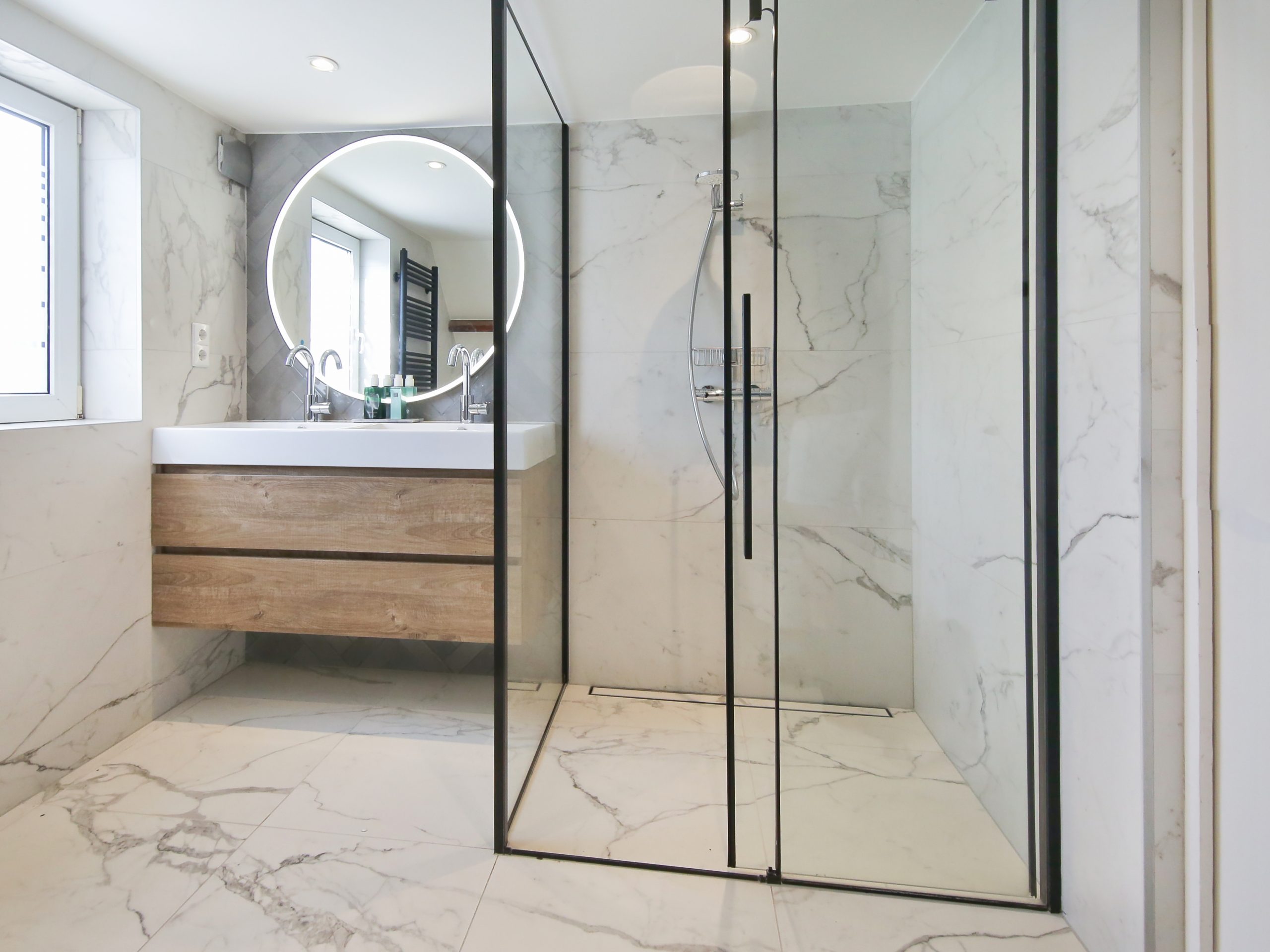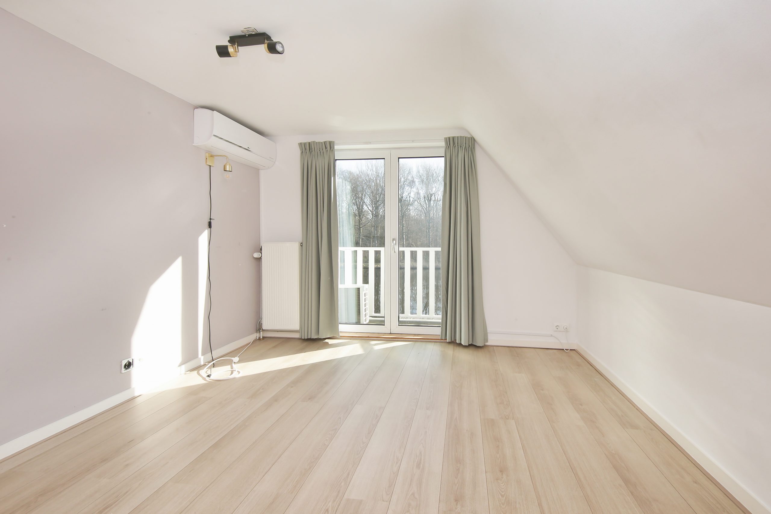 Op de eerste etage is aan de voorkant een slaapkamer van 13 m² met balkon en zicht op het water en het bos. Ook de luxe badkamer uit de periode 2024 met ligbad, inloopdouche, toilet en een groot wastafelmeubel zit voor. De twee andere slaapkamers van 12 en 5 m² hebben zicht op de oneindige boomrijke tuin.
