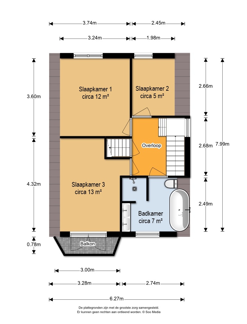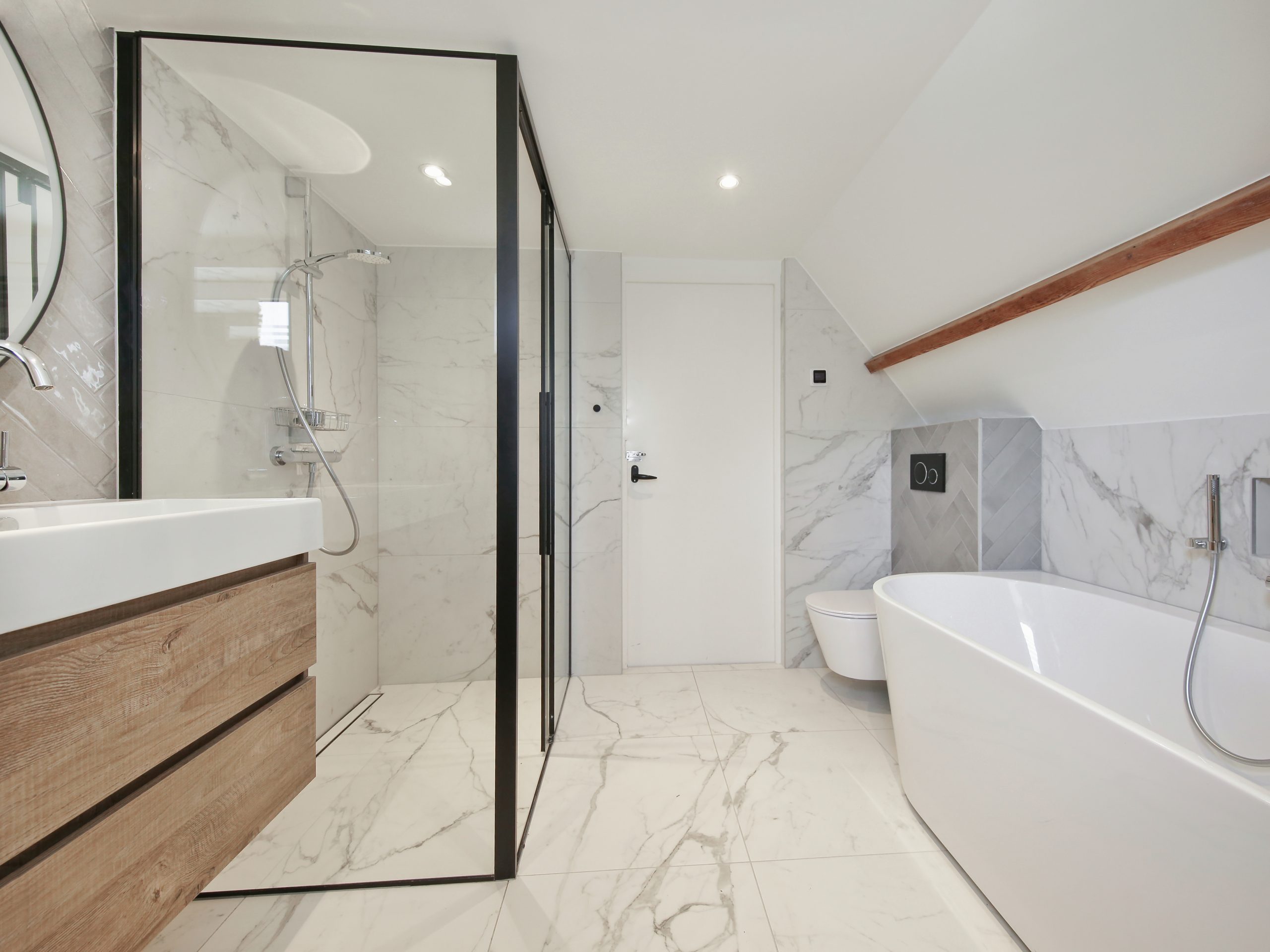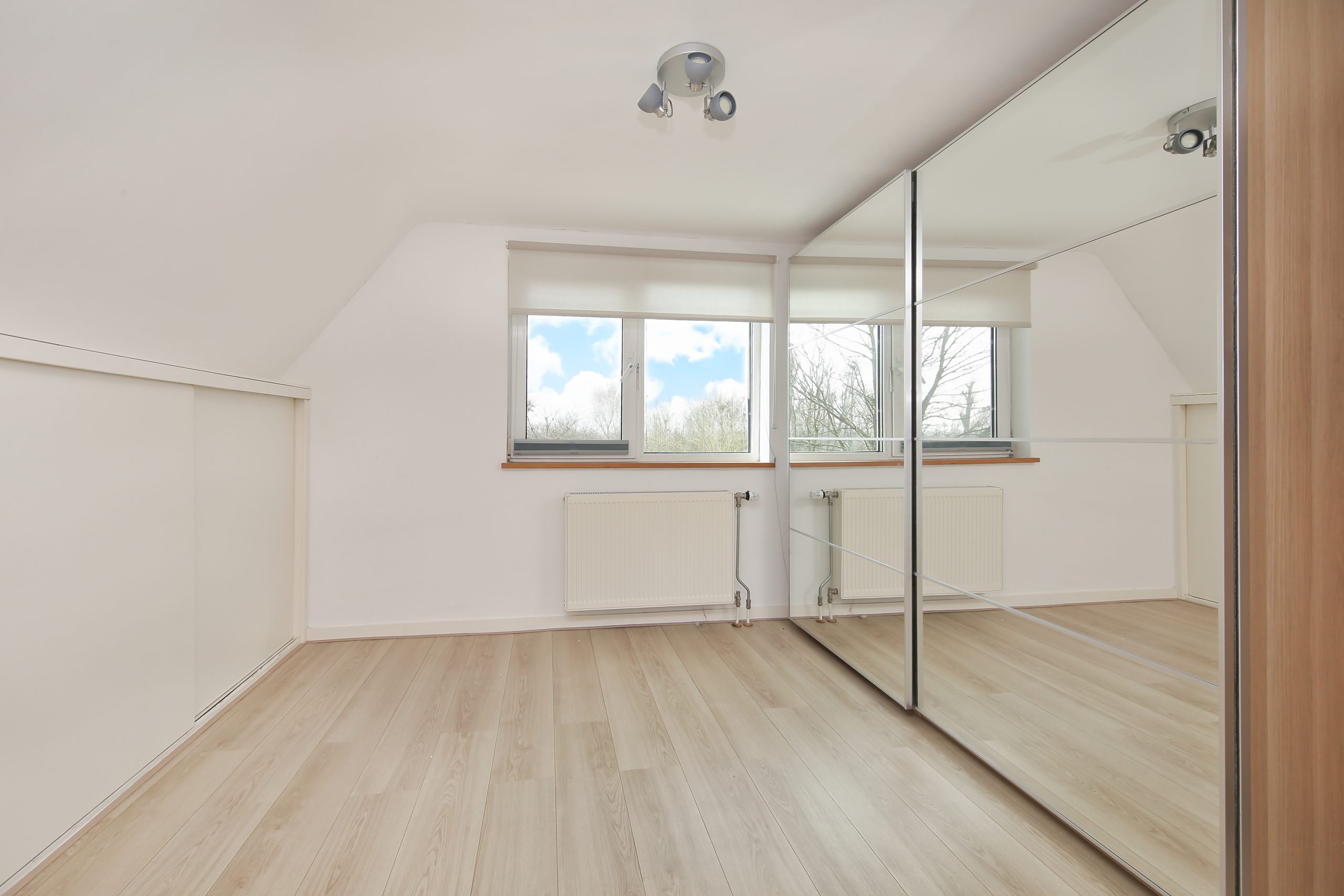 Overloop met deuren naar alle vertrekken. Badkamer, vernieuwd in 2023, van circa 7 m² met ligbad, inloopdouche, dubbele wastafel met meubel en toilet. Slaapkamer aan de voorzijde van circa 13 m² met airconditioning en openslaande deuren naar het op het oosten gelegen balkon. Twee slaapkamers aan de achterzijde van circa 12 m² en circa 5 m² met bergruimtes achter de knieschotten. In het midden van de woning is de vaste trap naar de 2e verdieping.