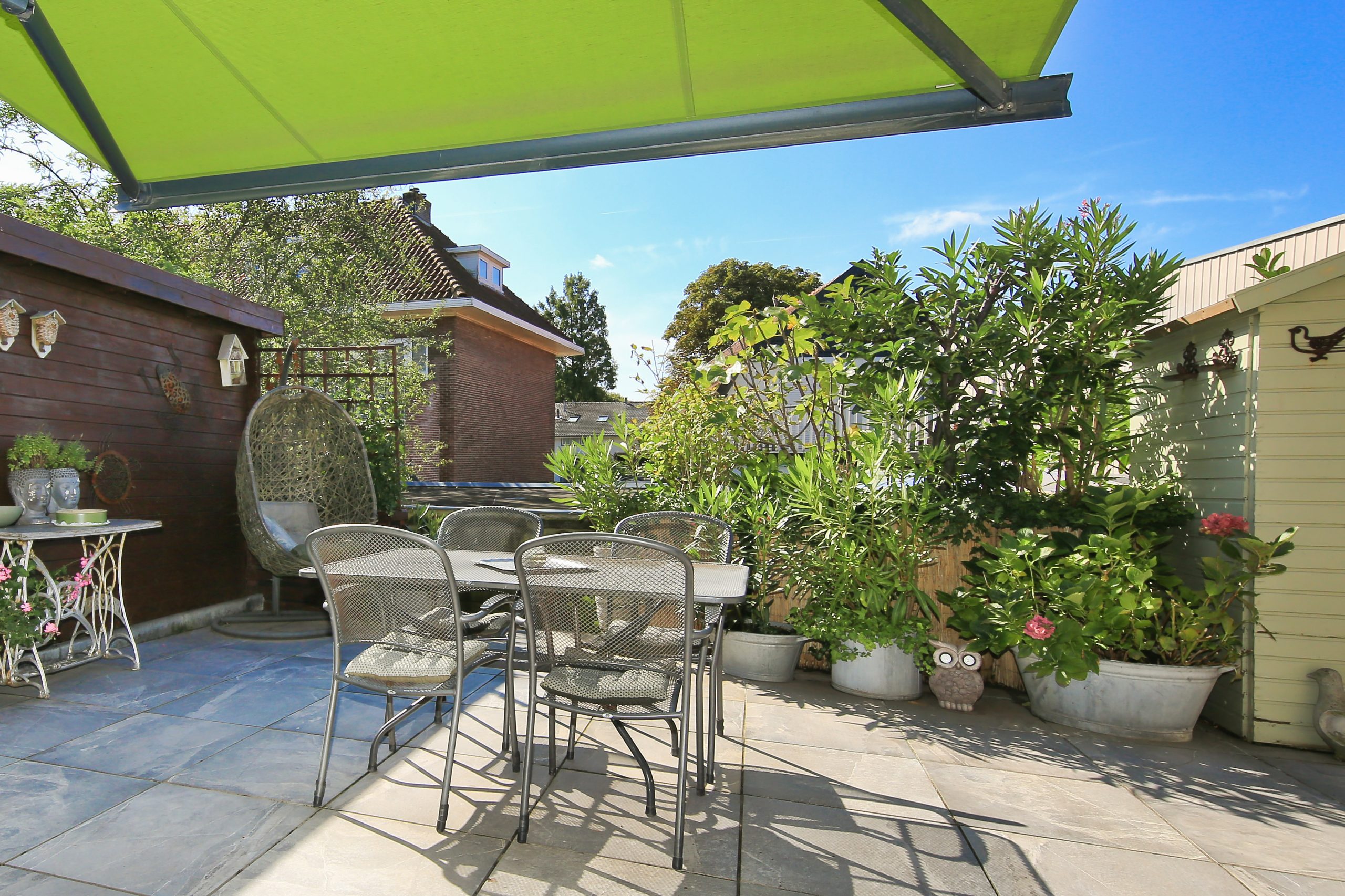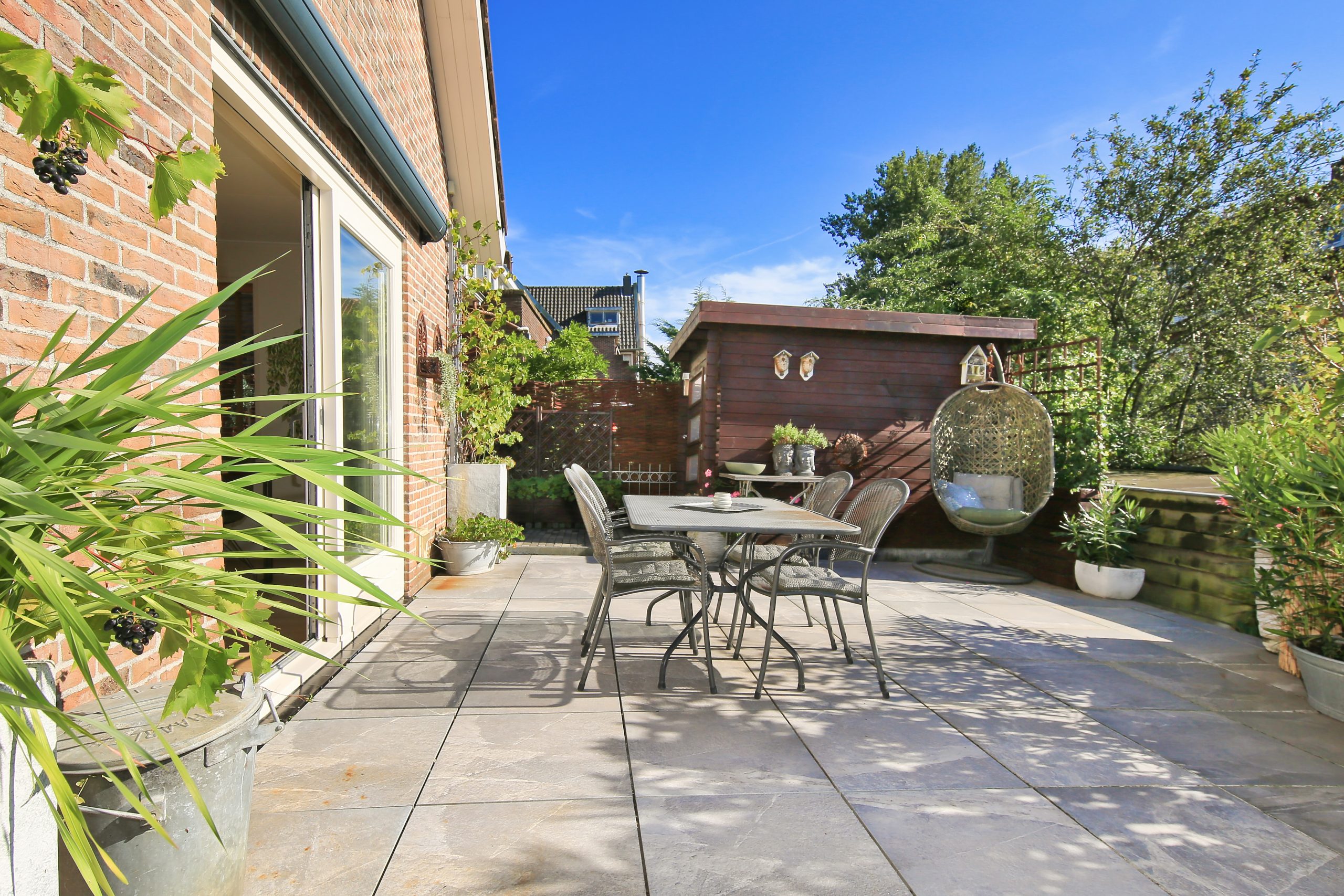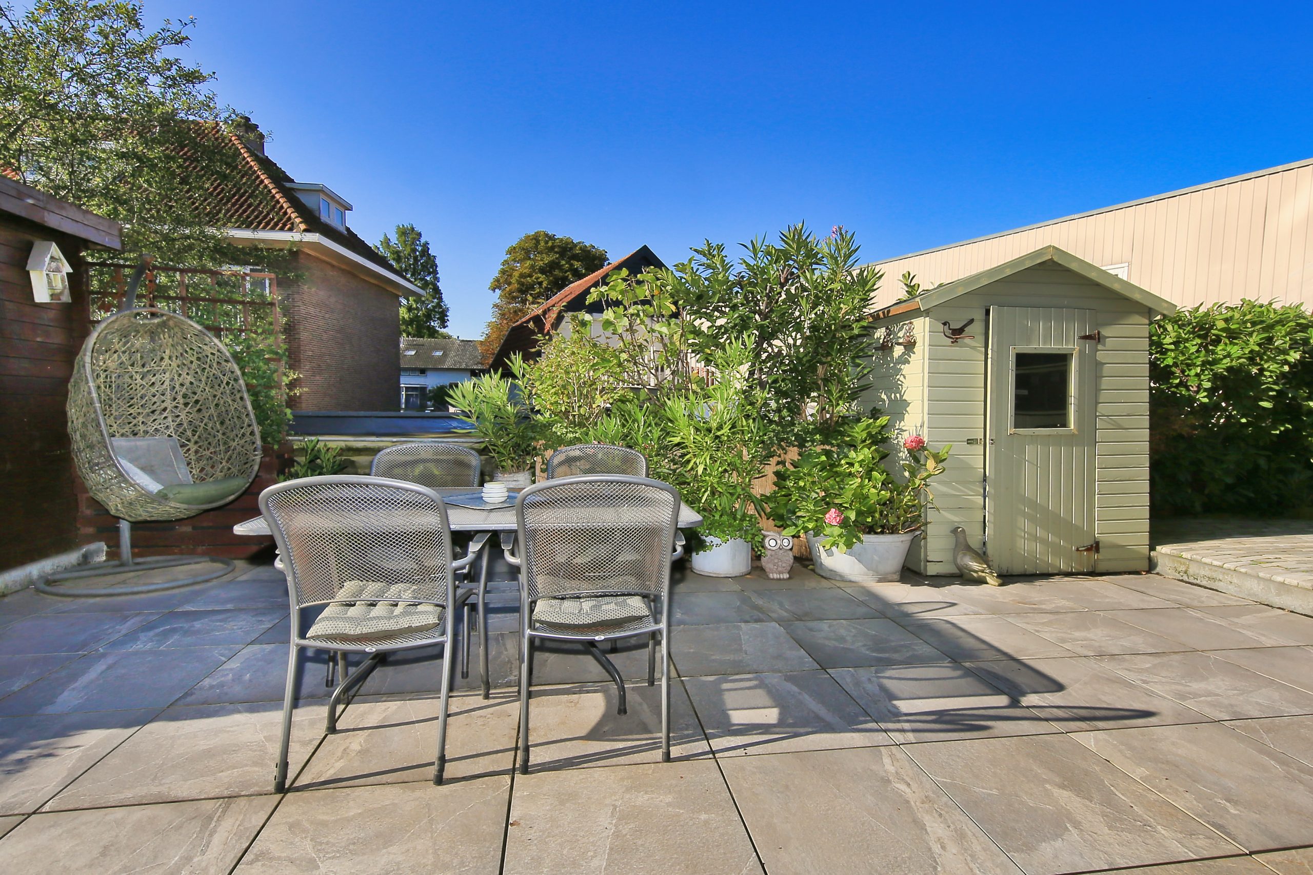 De fraai betegeld en zonnige zuidwest achtertuin is circa 13,4 meter breed en circa 3,6 meter diep en heeft een breed terras met knik arm zonnescherm, een berging van circa 5 m² en een berging van circa 2 m² en veel privacy.