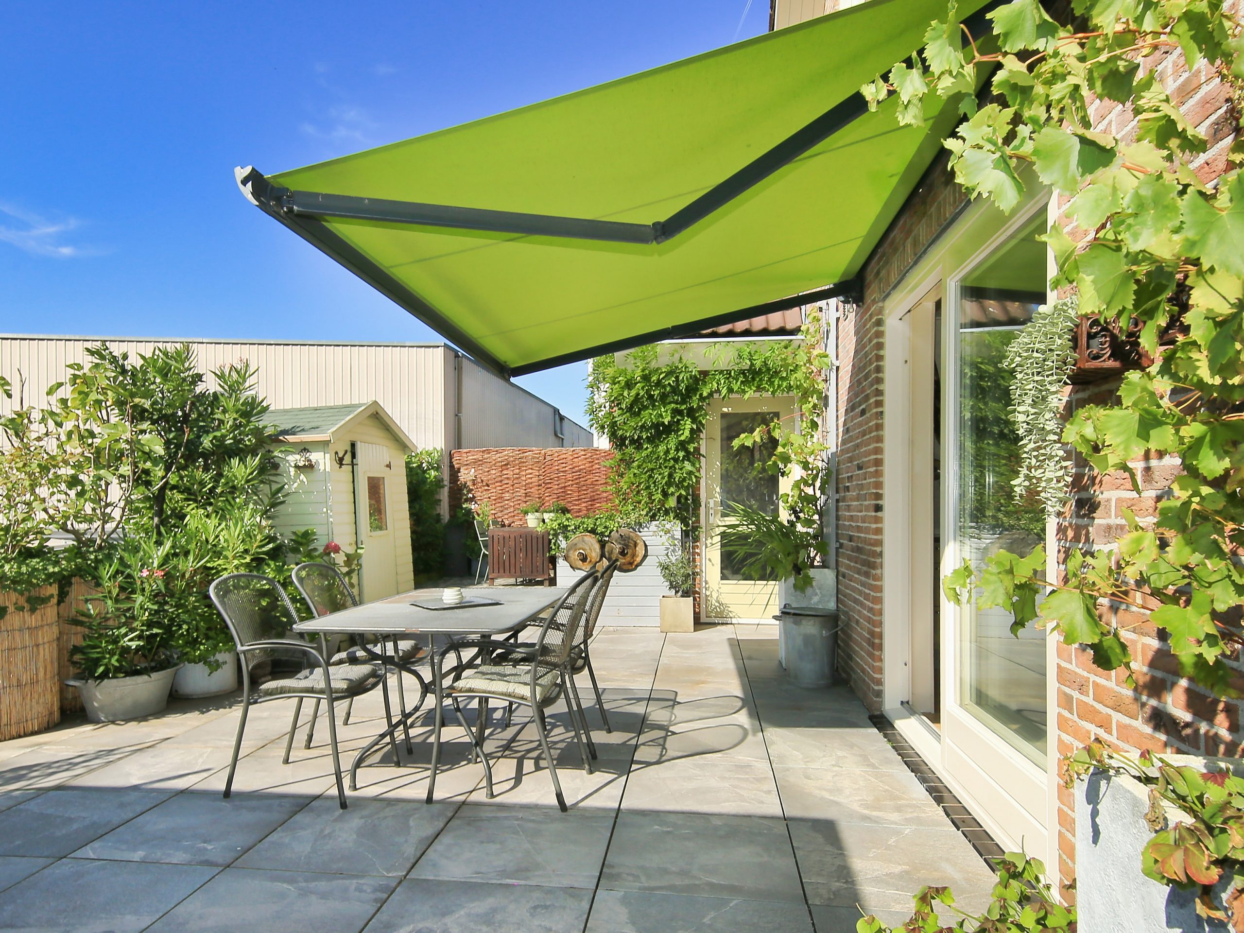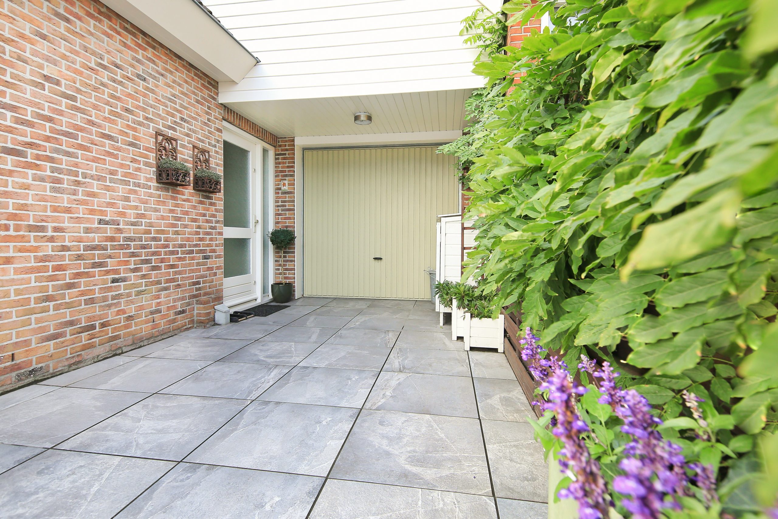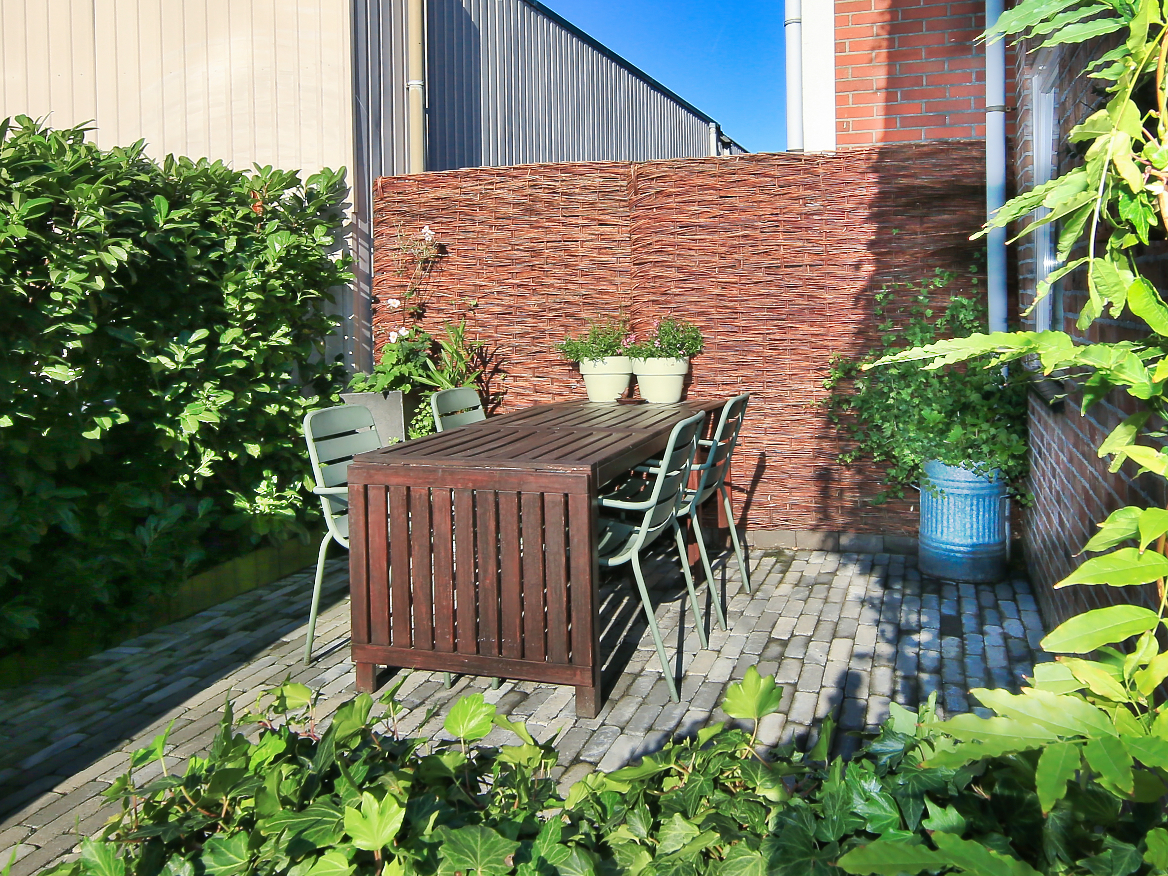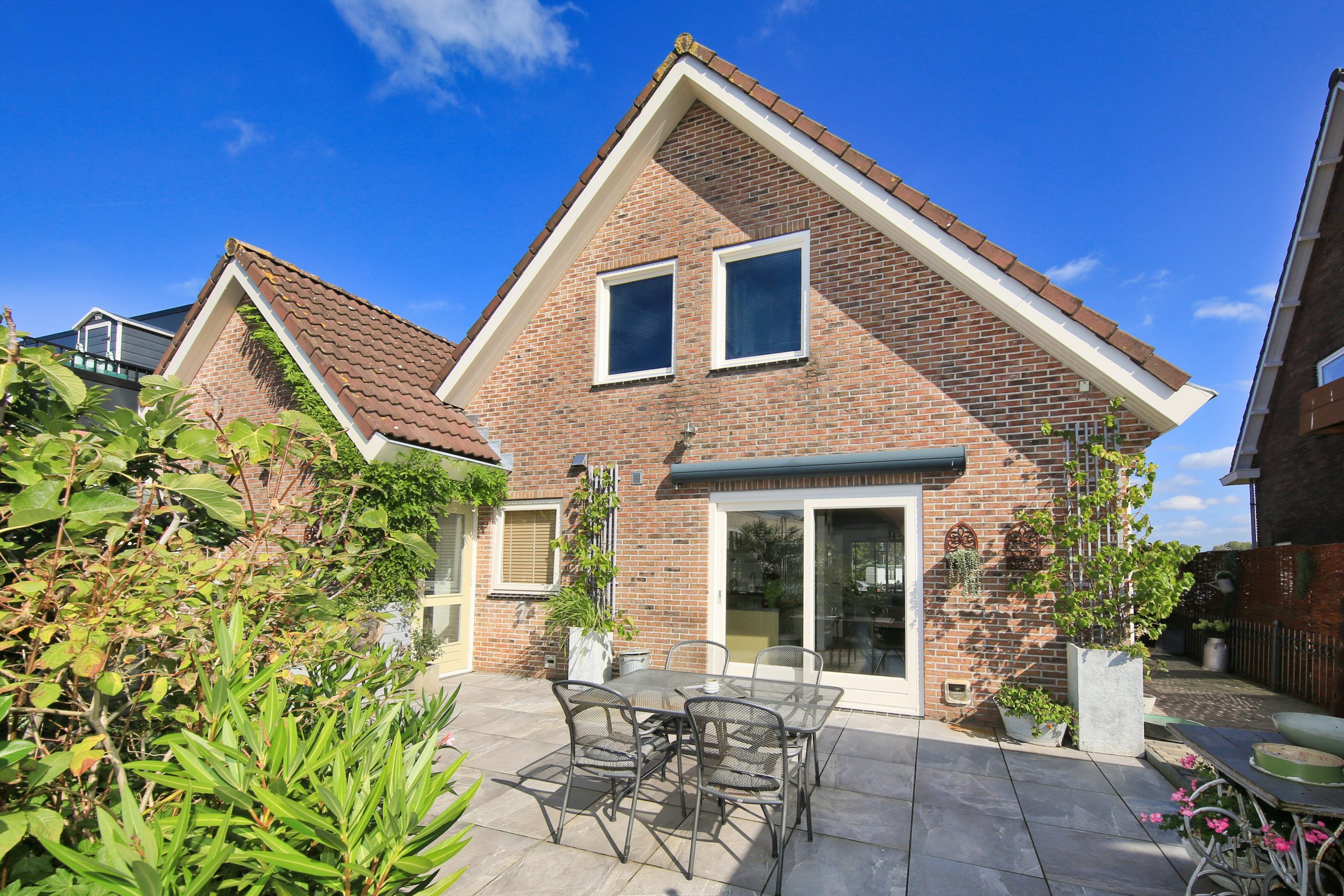 De fraai betegeld en zonnige zuidwest achtertuin is circa 13,4 meter breed en circa 3,6 meter diep en heeft een breed terras met knik arm zonnescherm, een berging van circa 5 m² en een berging van circa 2 m² en veel privacy.
