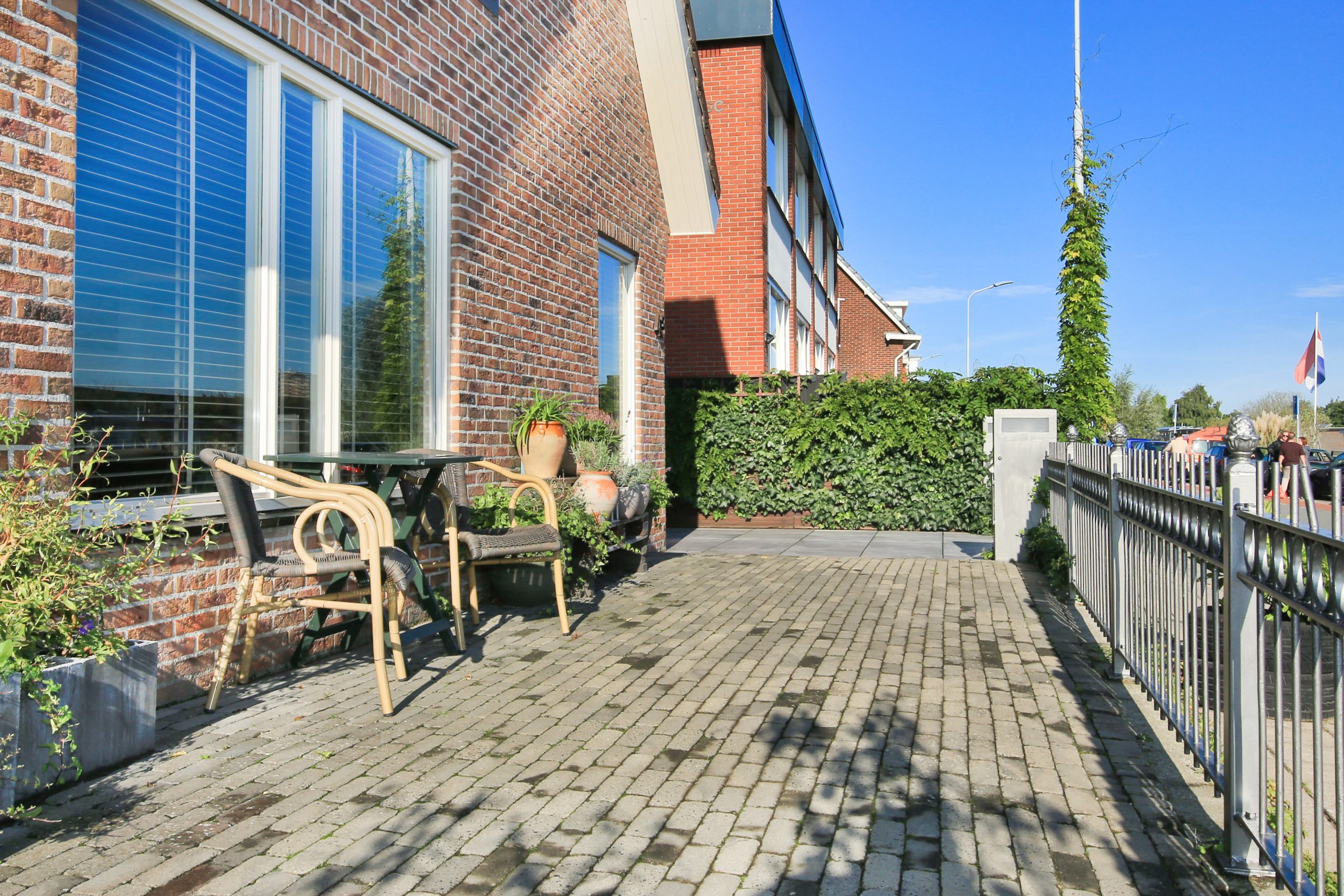 De totale diepte van de zijtuin is circa 18,3 meter, dit deel van de tuin ligt op het oosten en is voorzien van sierbestrating en een toegangshek (achterom).
