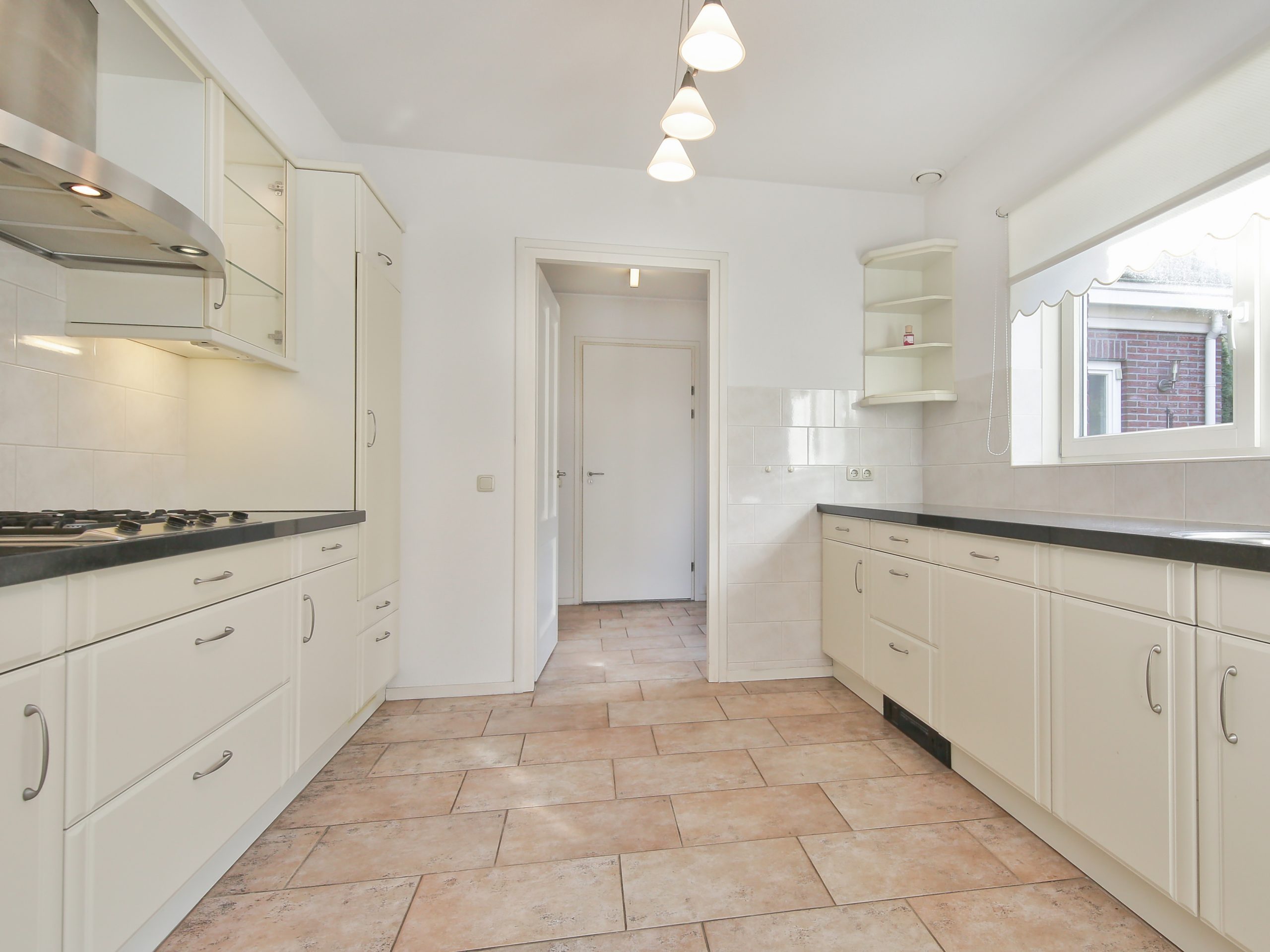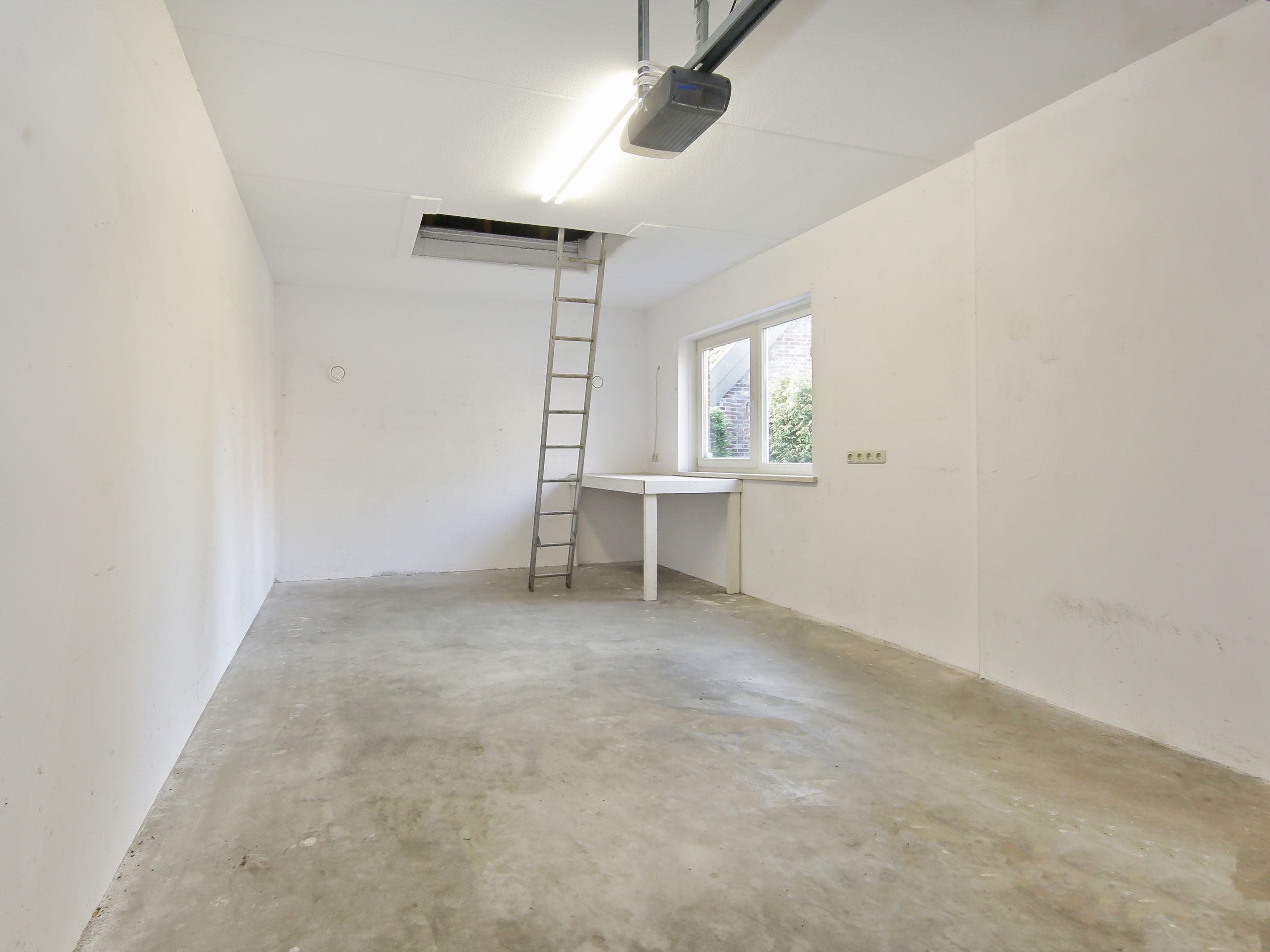 De bijkeuken biedt tevens toegang tot de ruime garage van circa 25 m², voorzien van een vliering en een raam met zicht op de achtertuin.
