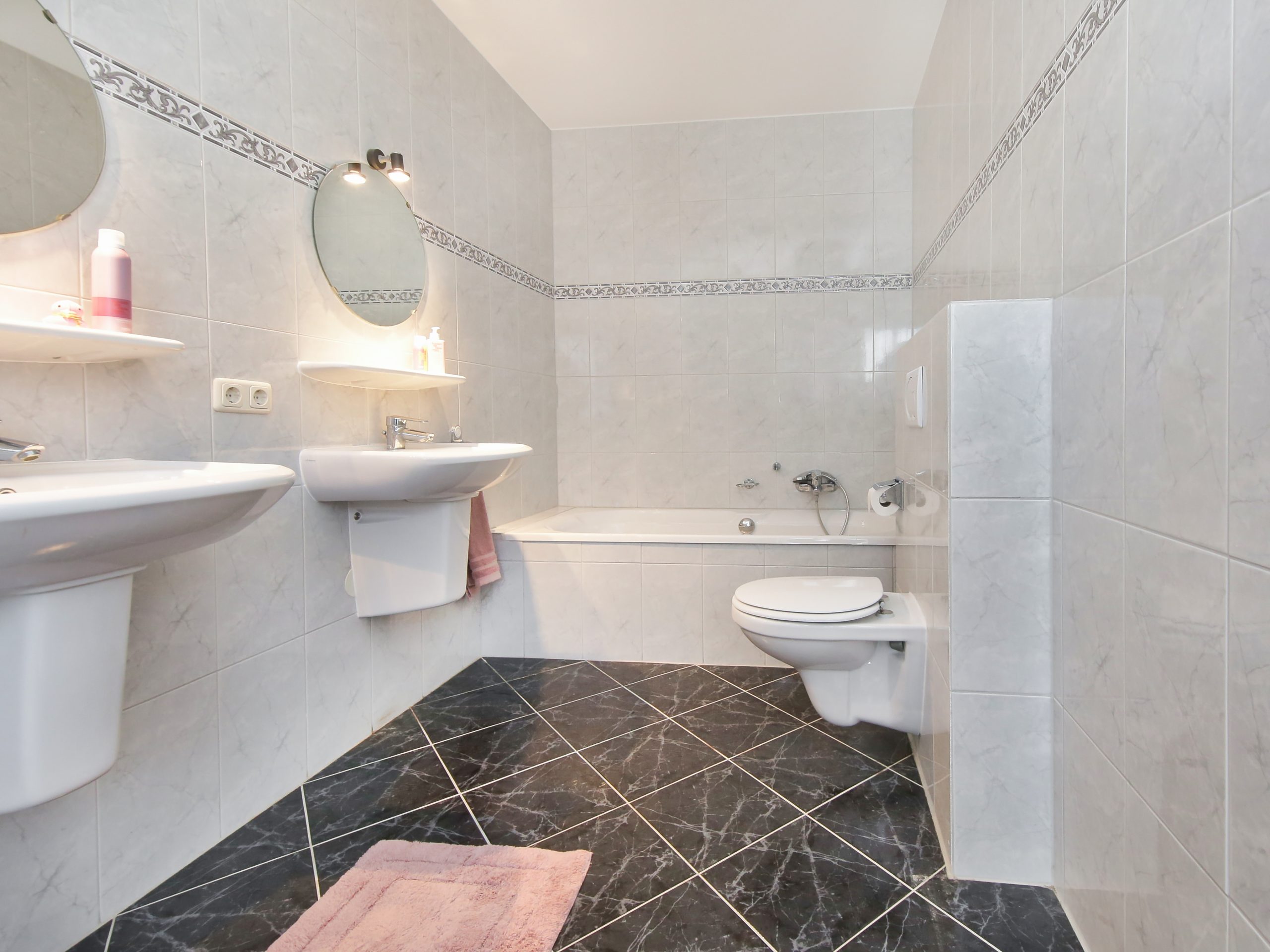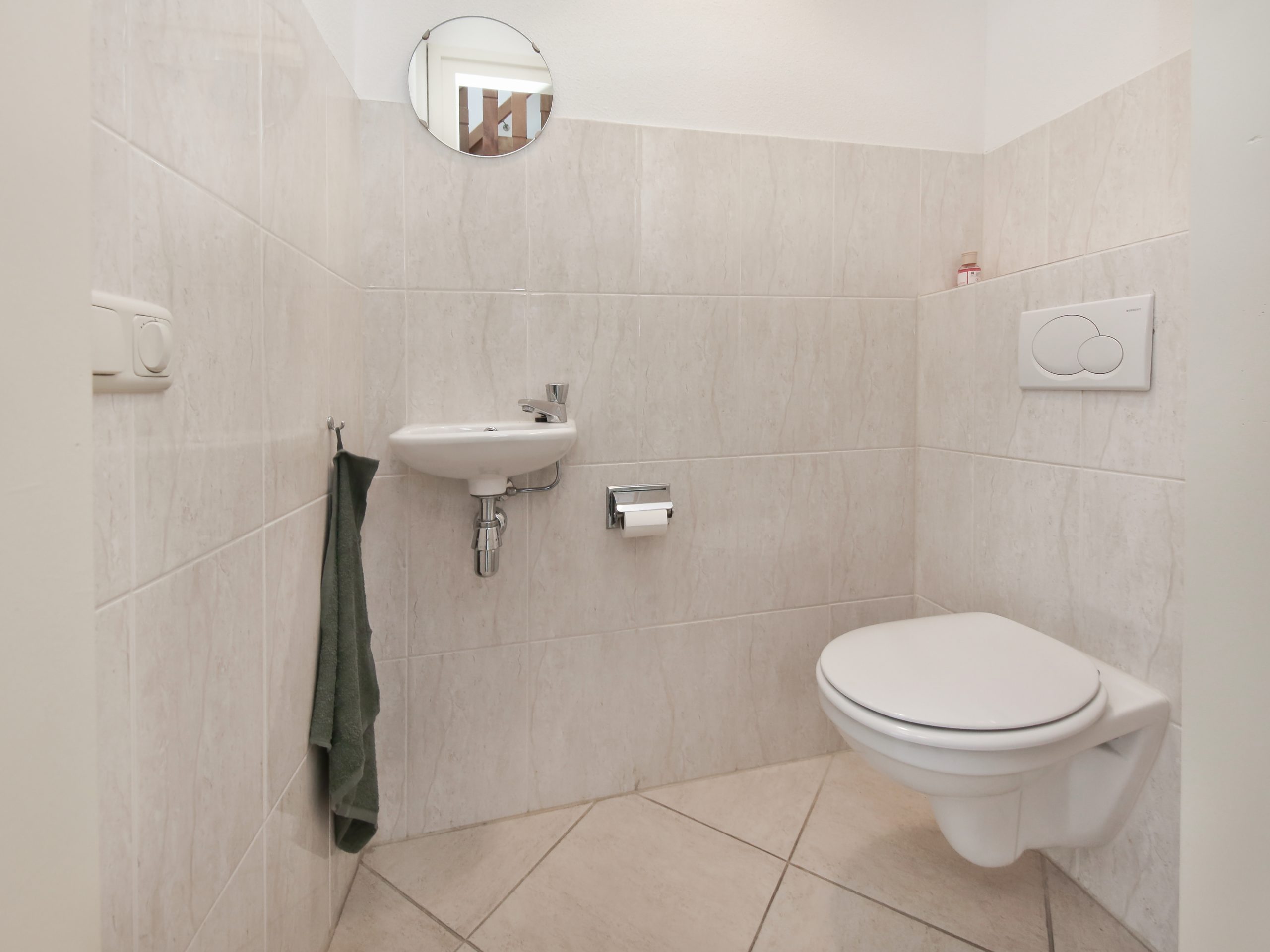 The hall with guest toilet also provides access to the sleeping wing with a 17 m² bedroom and a 7.5 m² bathroom with bathtub, shower, two washbasins and a second toilet.