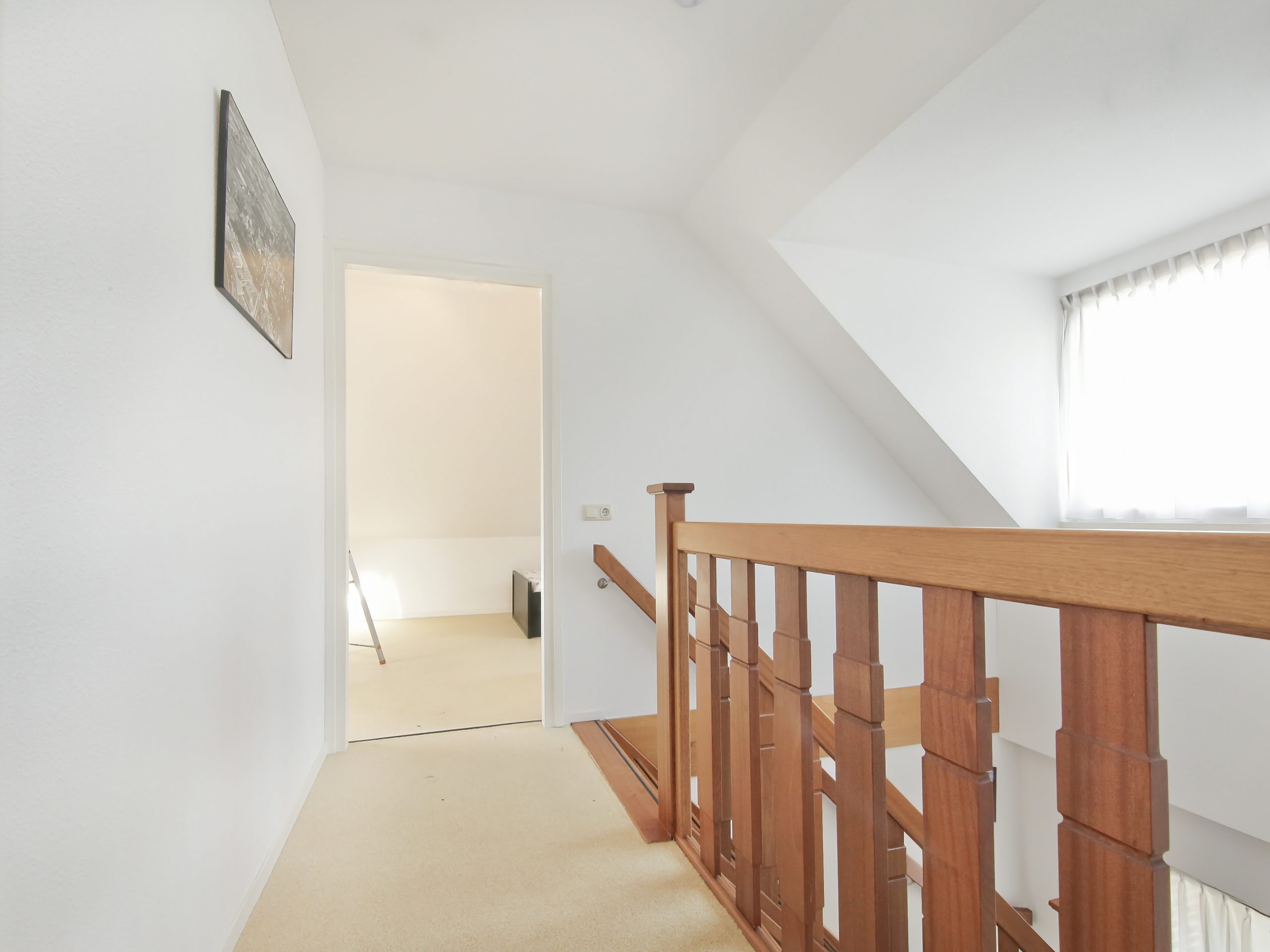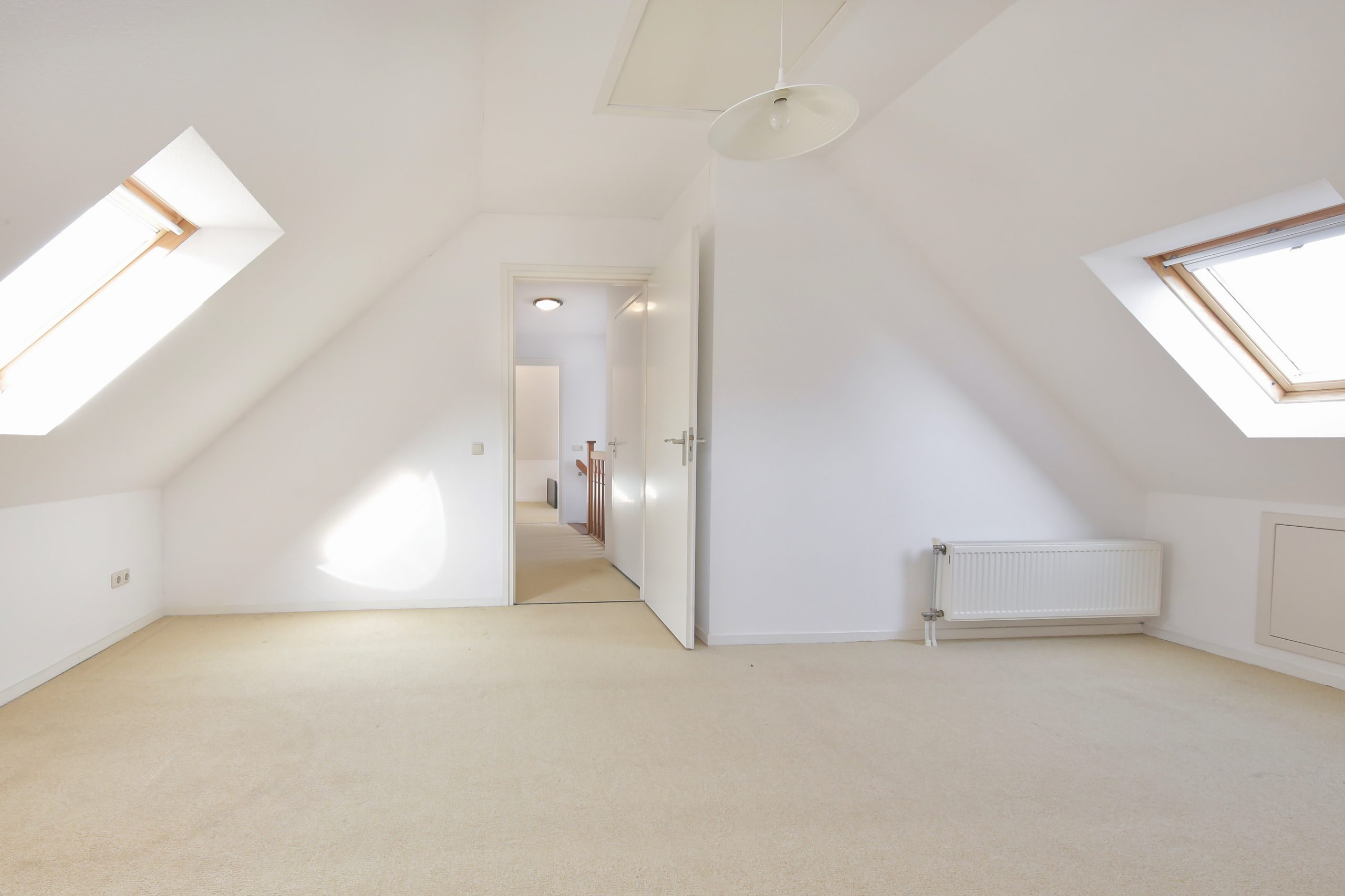 The landing with mezzanine provides access to two bedrooms of approximately 10 m² and 14 m², both with large roof windows. In addition, there is a second bathroom with shower, washbasin and toilet, a storage room and a large loft. This floor offers possibilities for additional rooms or workspace.