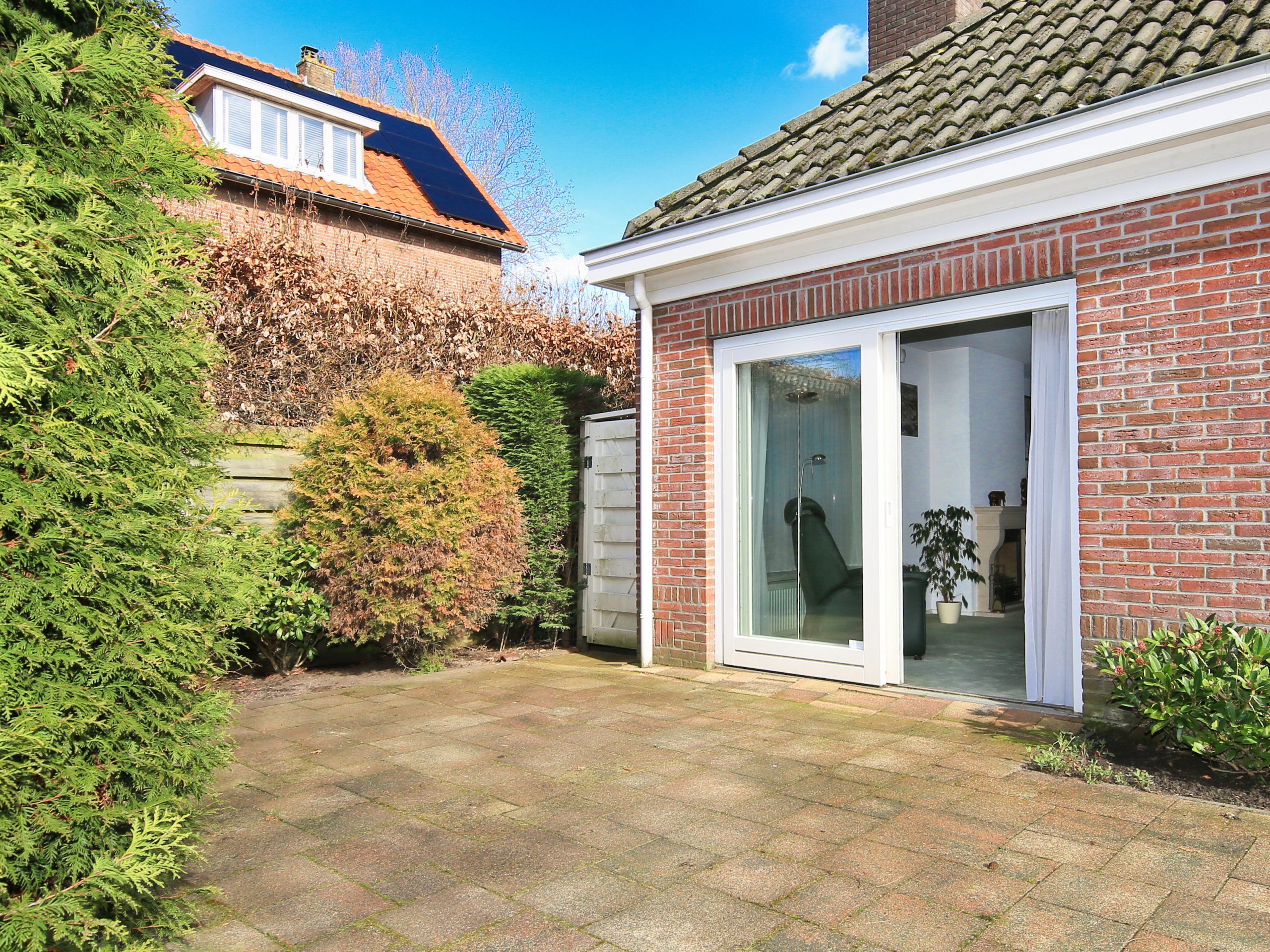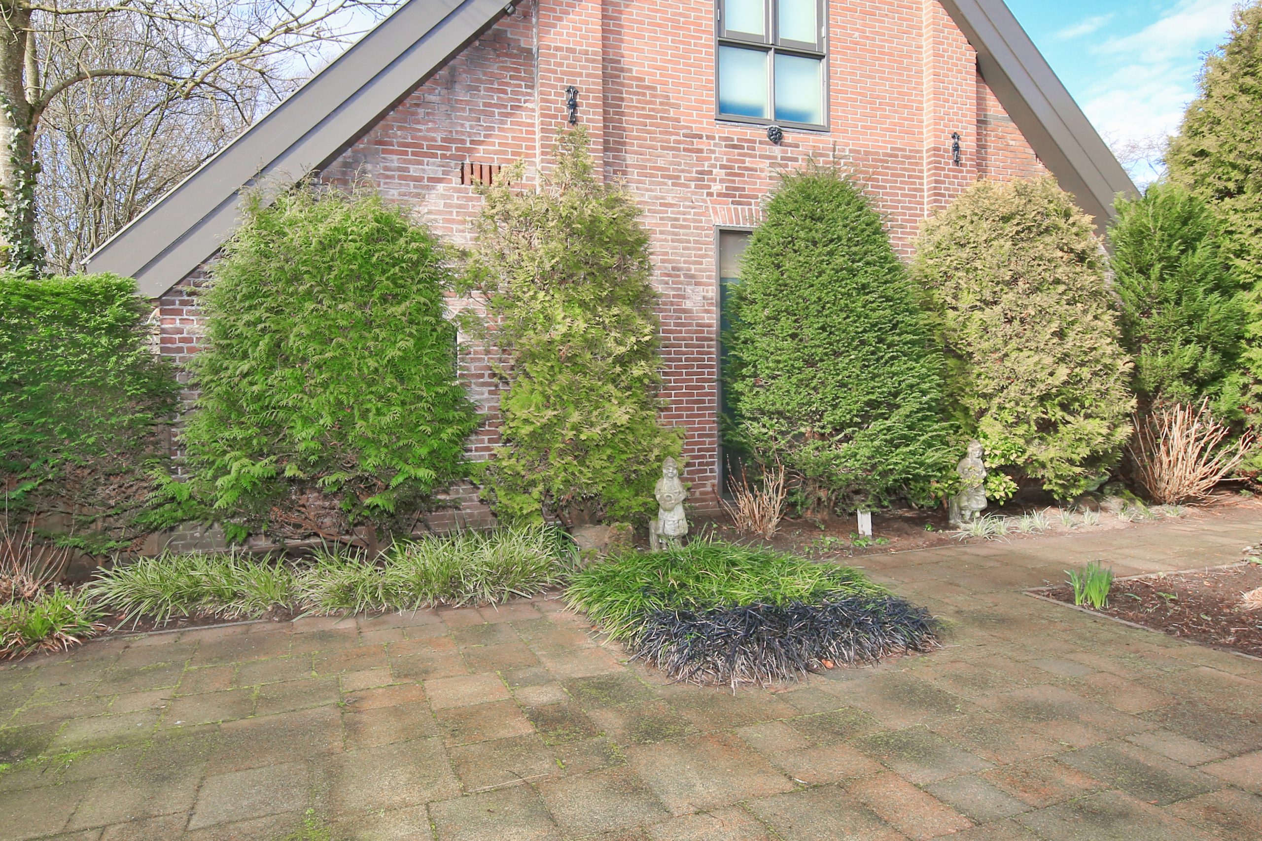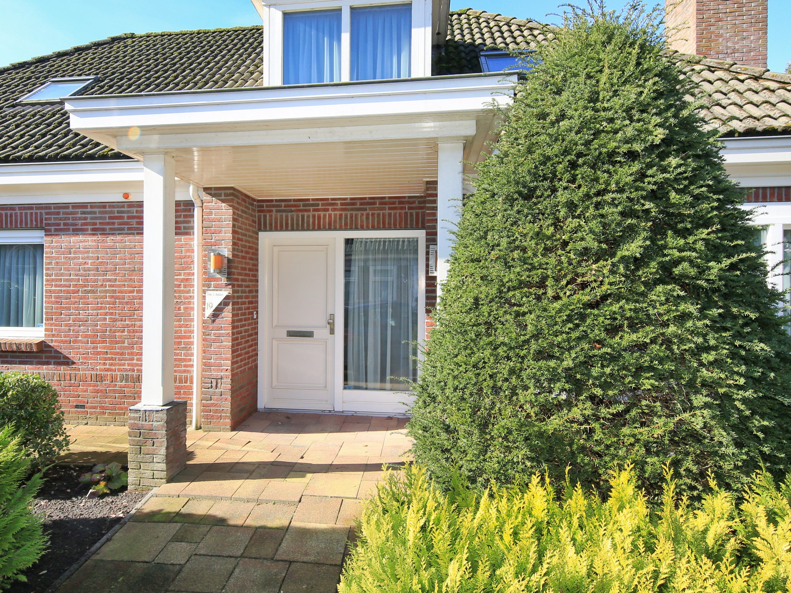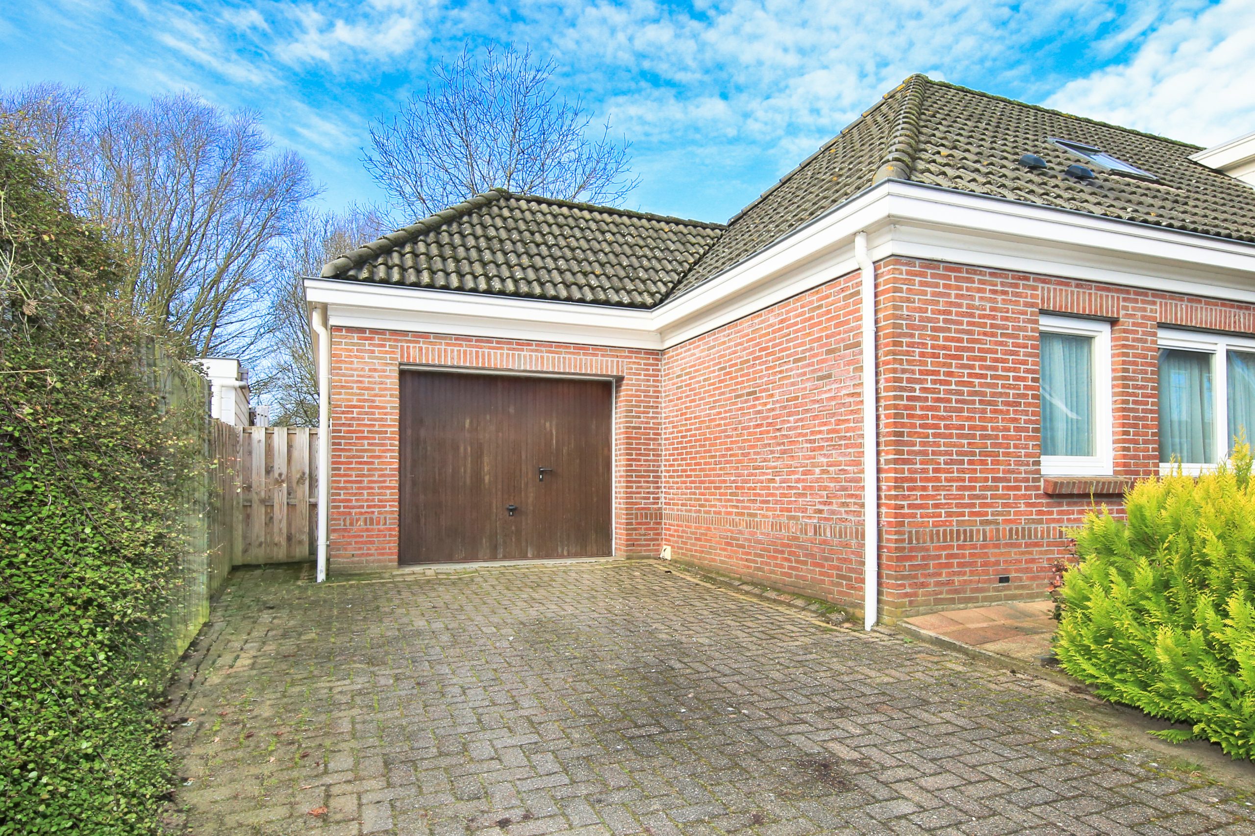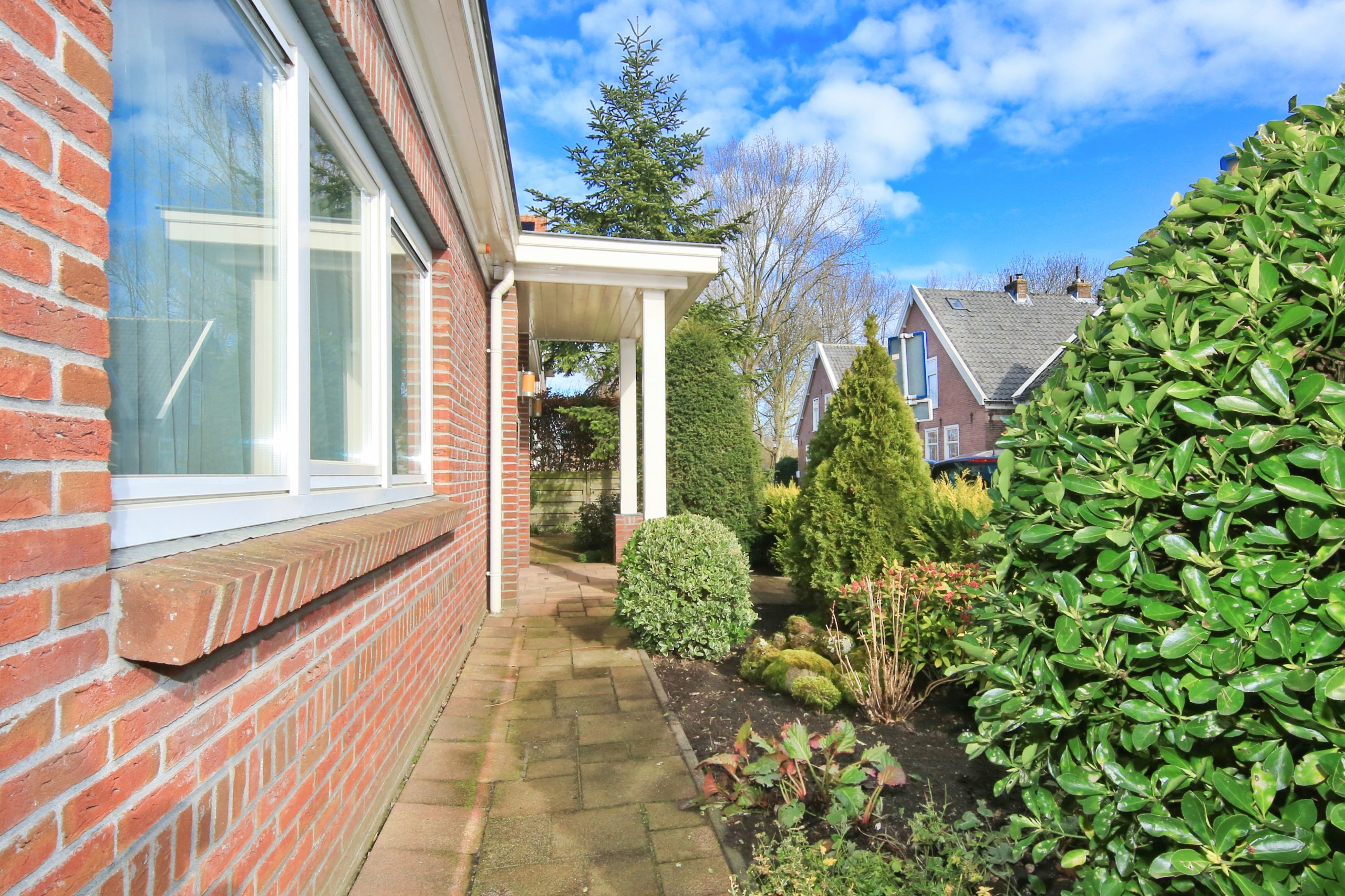 The front garden is landscaped with greenery and features a tiled path leading to the house. At the front door there is a canopy. Along the front side of the house runs a strip of paving leading to the side garden and the driveway with garage. On both sides at the front there is a gate providing access to the rear garden.