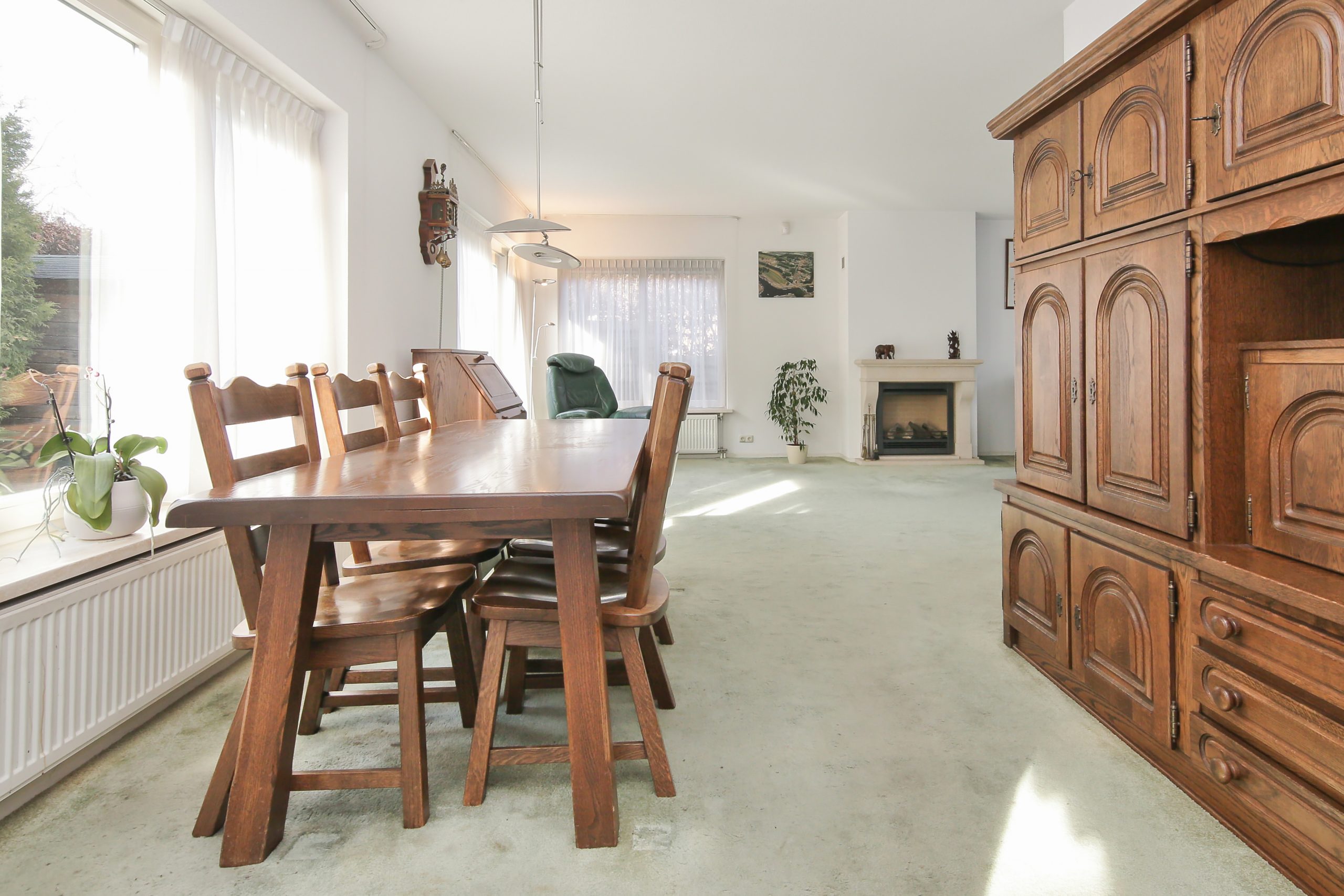 The L-shaped living room of approximately 41 m² features an attractive fireplace and sliding doors to the rear garden. The adjacent kitchen (approximately 11 m²) has two worktops and various built-in appliances. From the kitchen the utility room is accessible, with space for the central heating system and washing machine, additional storage space and a door to the garden.