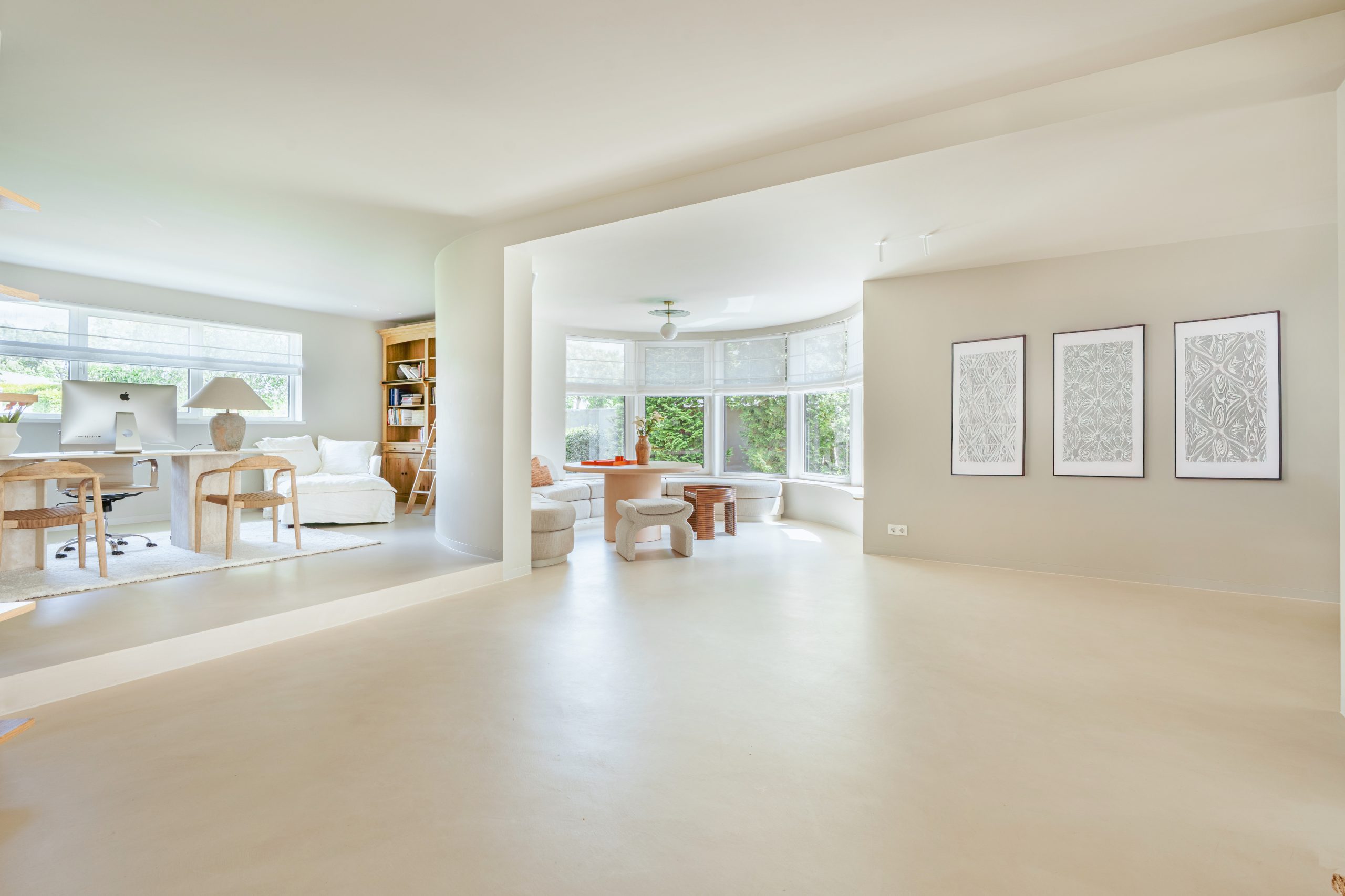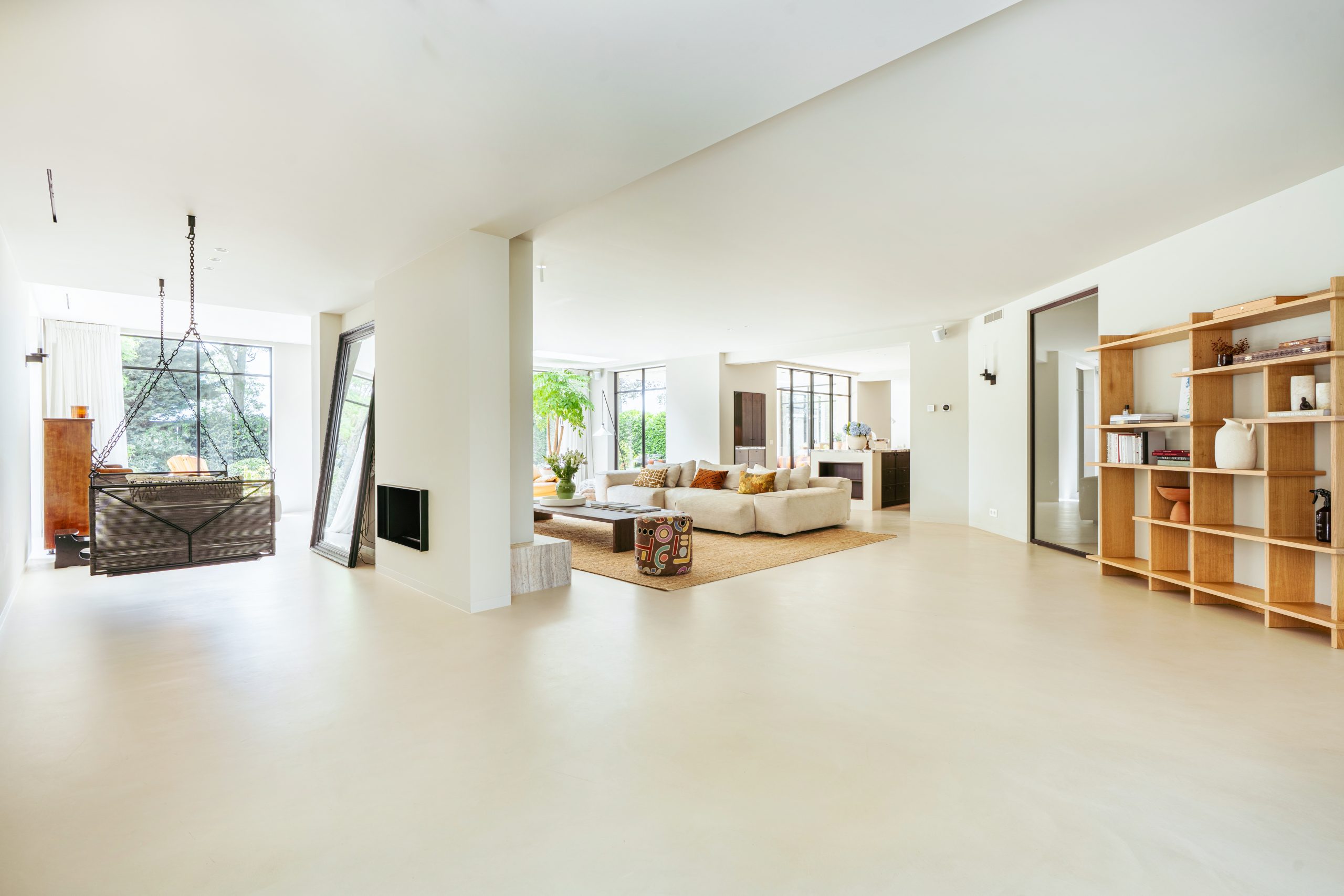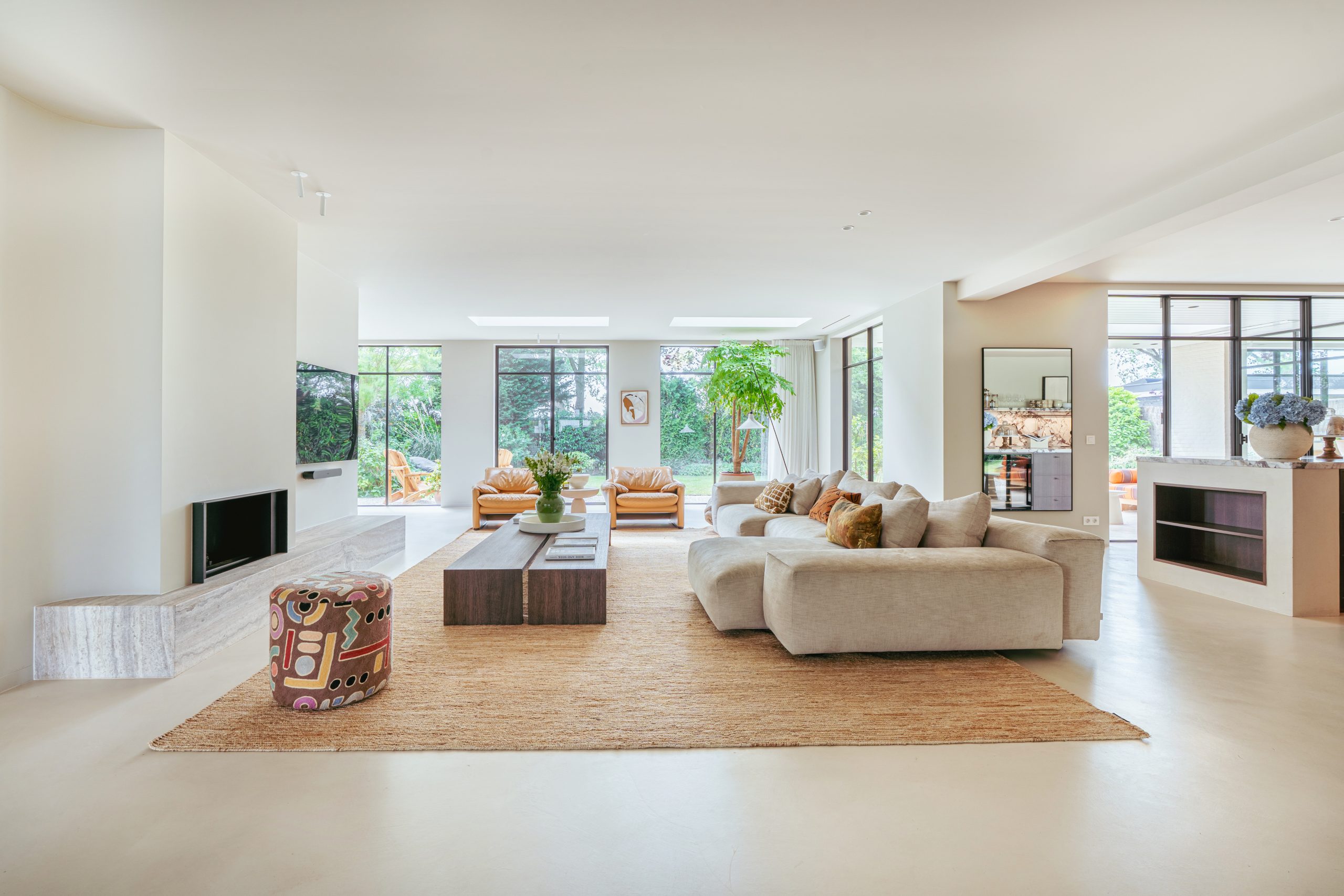 The generous living room, with floor-to-ceiling windows and a beautiful round bay window, is bathed in natural light, immediately creating a sense of space and tranquility. The atmospheric fireplace forms an elegant centerpiece in the open-plan living area, which flows seamlessly into the luxurious kitchen. This is equipped with high-quality built-in appliances and modern conveniences, including a spacious cooking island of about 5 meters. Book-matched marble continues into the sink, giving the kitchen a refined appearance. Adjoining the kitchen is the spacious dining room. Through French steel doors by the kitchen, you access the lovely covered terrace and the beautifully landscaped garden.