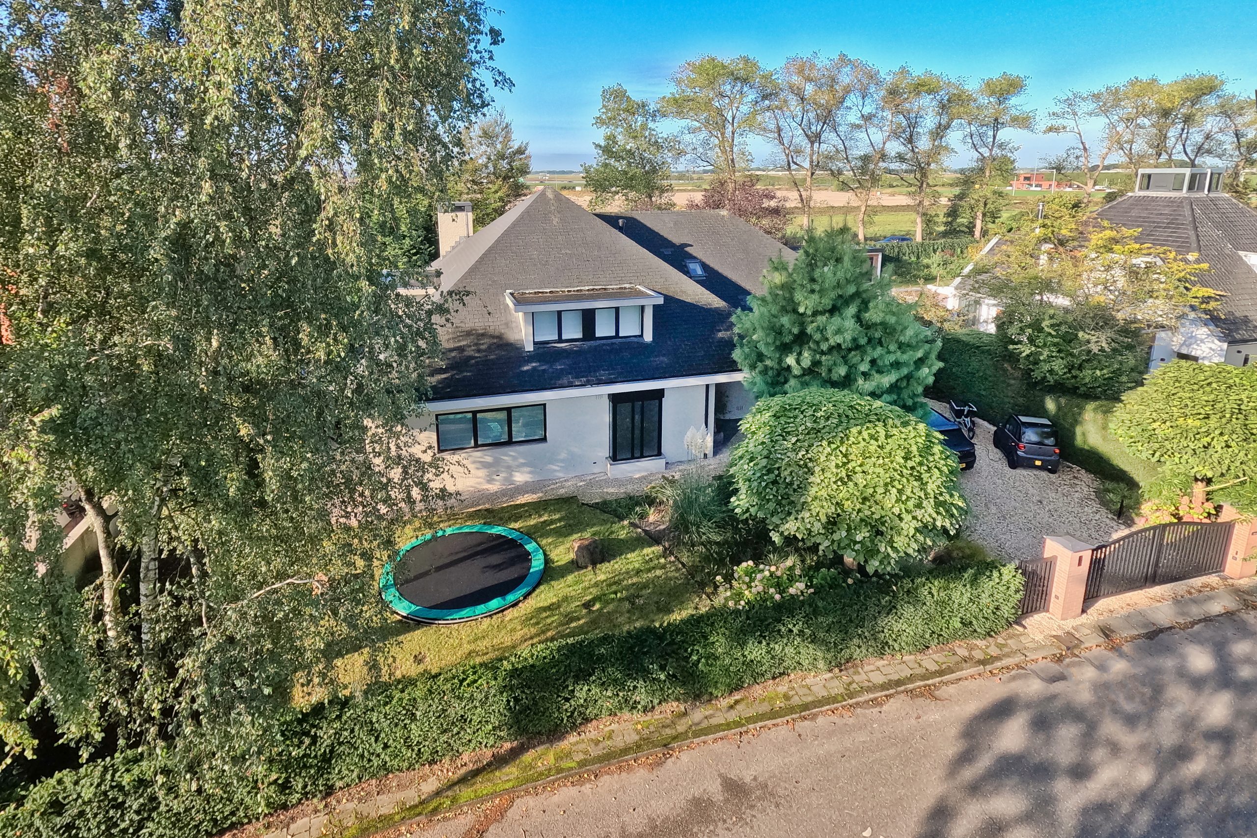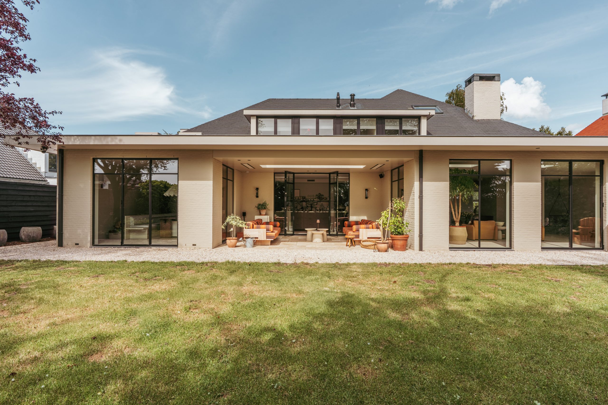 This exclusive home, rebuilt under the architectural direction of Anne Claus, includes, among other things, a 177 m² living area with a garden-facing living room with tall windows, skylights, and a partition wall with a double-sided fireplace, a stylish lounge corner in the subtle, round bay window in the side facade, and a spacious study at the front. The stunning kitchen, with a cooking island no less than five meters long, is fitted with every possible appliance and forms the natural transition from the living room to the garden-facing dining room. The covered terrace of 22 m², with skylight in the ceiling, feels like part of the living space, as it borders the kitchen and can be reached through French doors. The adjoining garden is very spacious at 617 m² and has been landscaped according to a plan. The entrance of the house is equally impressive, with a 20 m² hall, a stylish staircase, the curves and the difference in levels. This hall also gives access to the 14 m² storage room with laundry facilities and laundry chute, the enormous guest toilet, and the 28 m² garage, partly fitted out as a private gym.