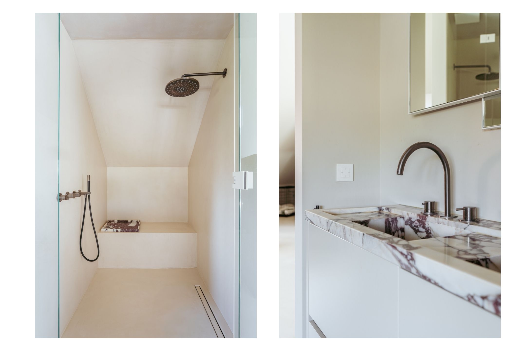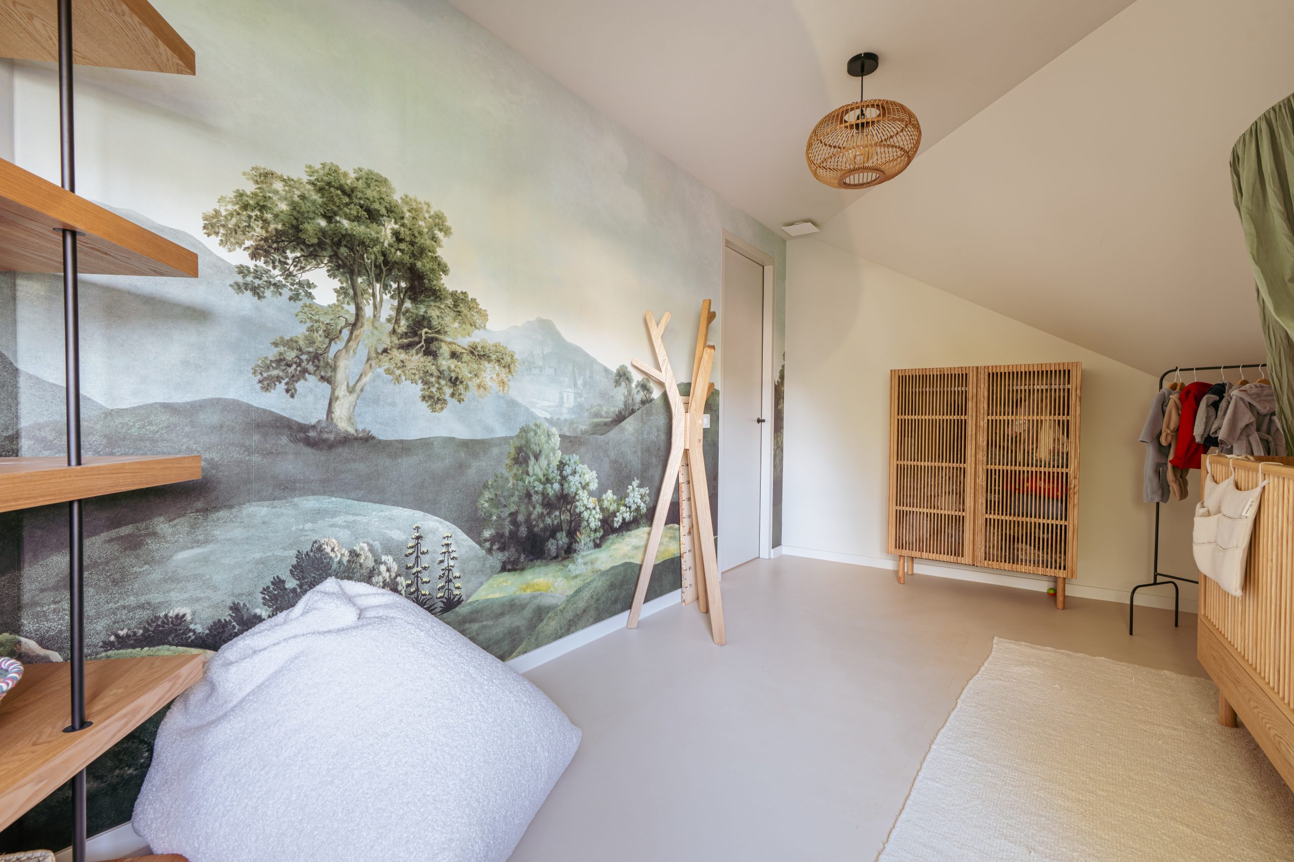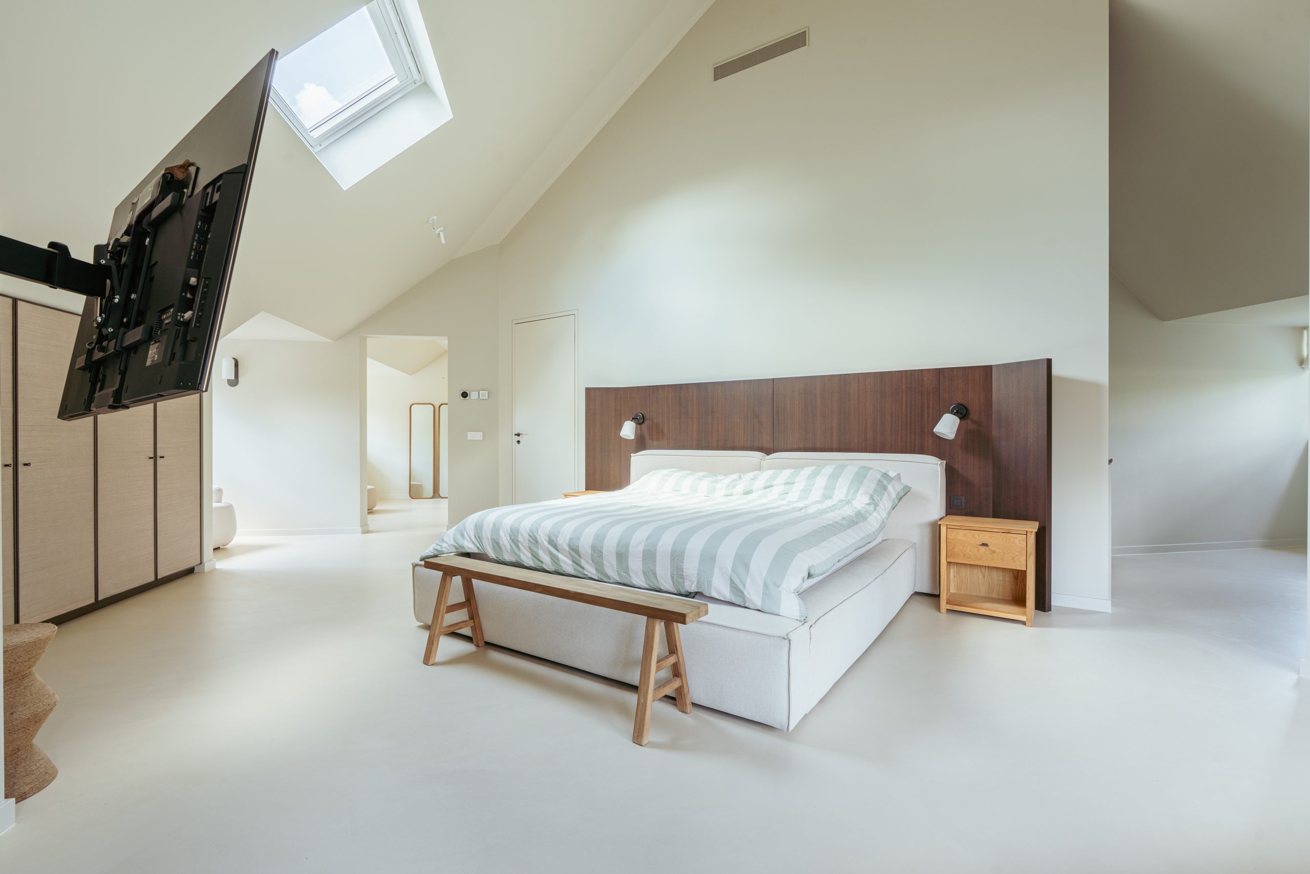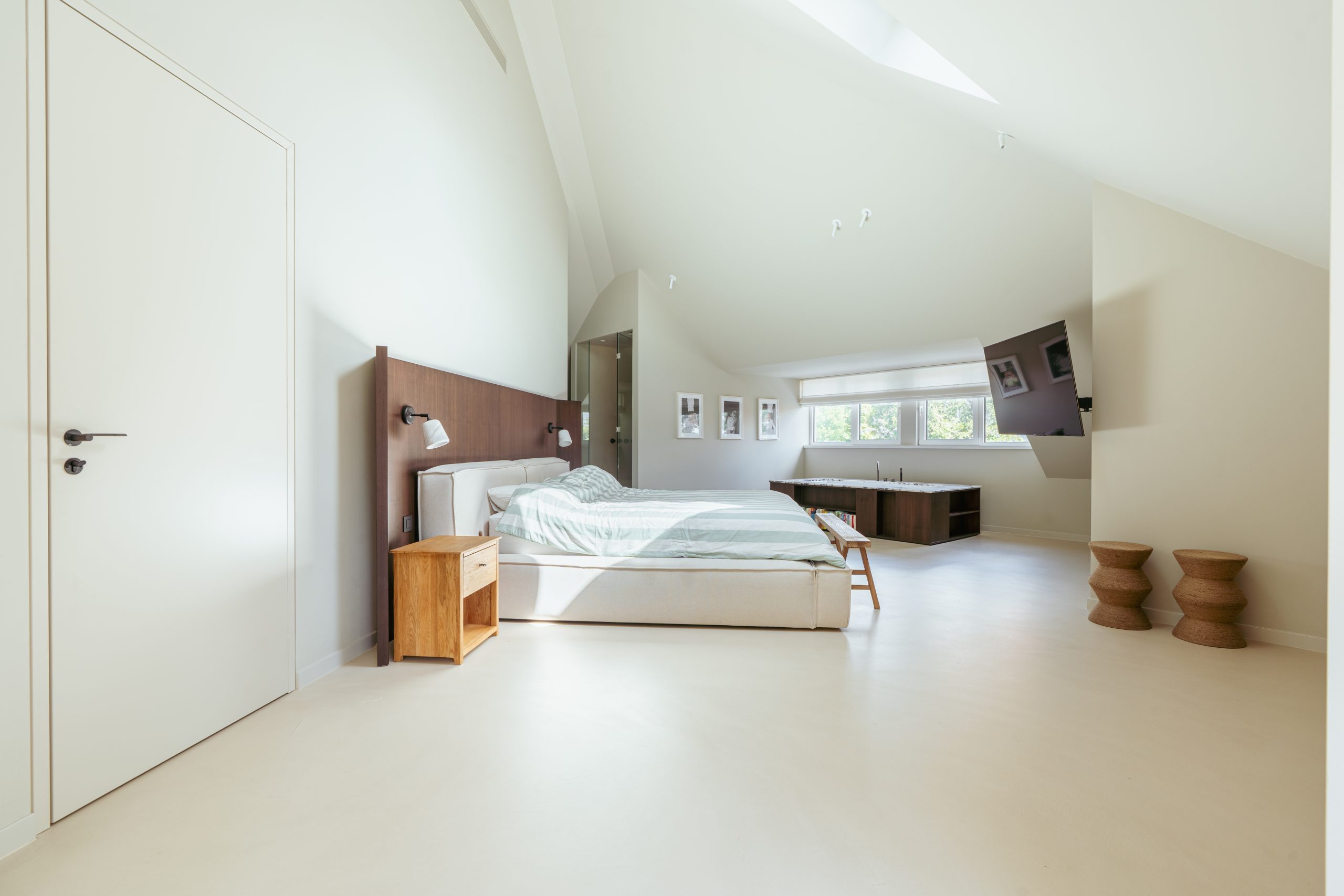 On the upper floor, beneath the roof, there are three very atmospheric and comfortable bedrooms, a closet room and two luxurious bathrooms. The master bedroom has a skylight, a six-door wardrobe wall, and a stylish freestanding bathtub forming the entrance to the extensive bathroom with a spacious walk-in shower, an elegant double washbasin unit, and a separate toilet. On the other side of the bedroom there is a large walk-in closet. The second bedroom is also generously sized and equally atmospheric thanks to the sloping roof. The third bedroom, with fine built-in wardrobes, is another delightful room. Between these last two bedrooms is a second bathroom with shower, washbasin unit, and toilet.