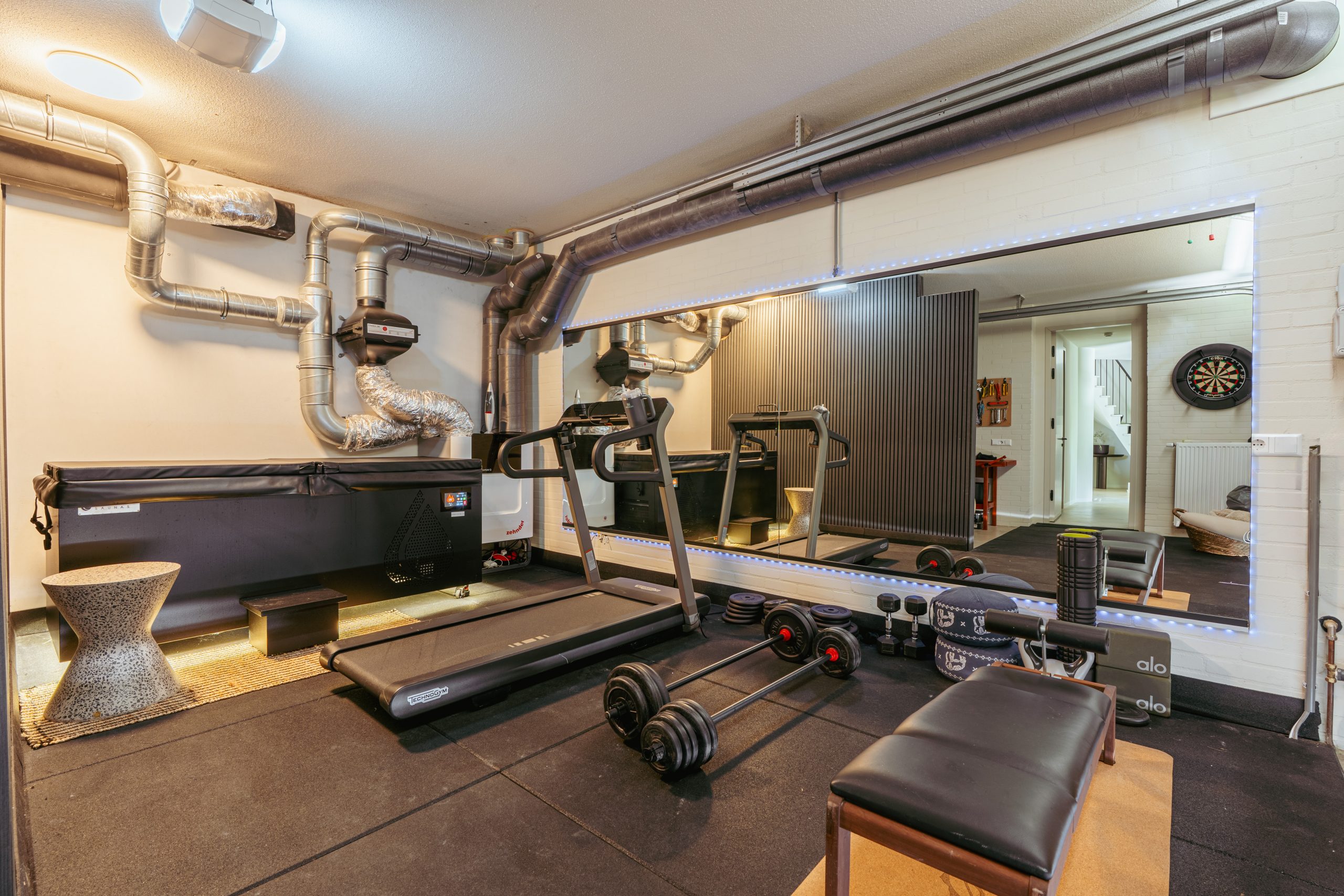 Through the beautifully landscaped front garden you reach the impressive hall, which provides access to all rooms on the ground floor. Directly on the right-hand side is the spacious indoor storage room with central heating installation, laundry chute, water softener, and the home automation system. Opposite is an additional built-in closet, and next to it the garage, currently used as a fitness room. On the left side of the hall is a spacious toilet with washbasin.