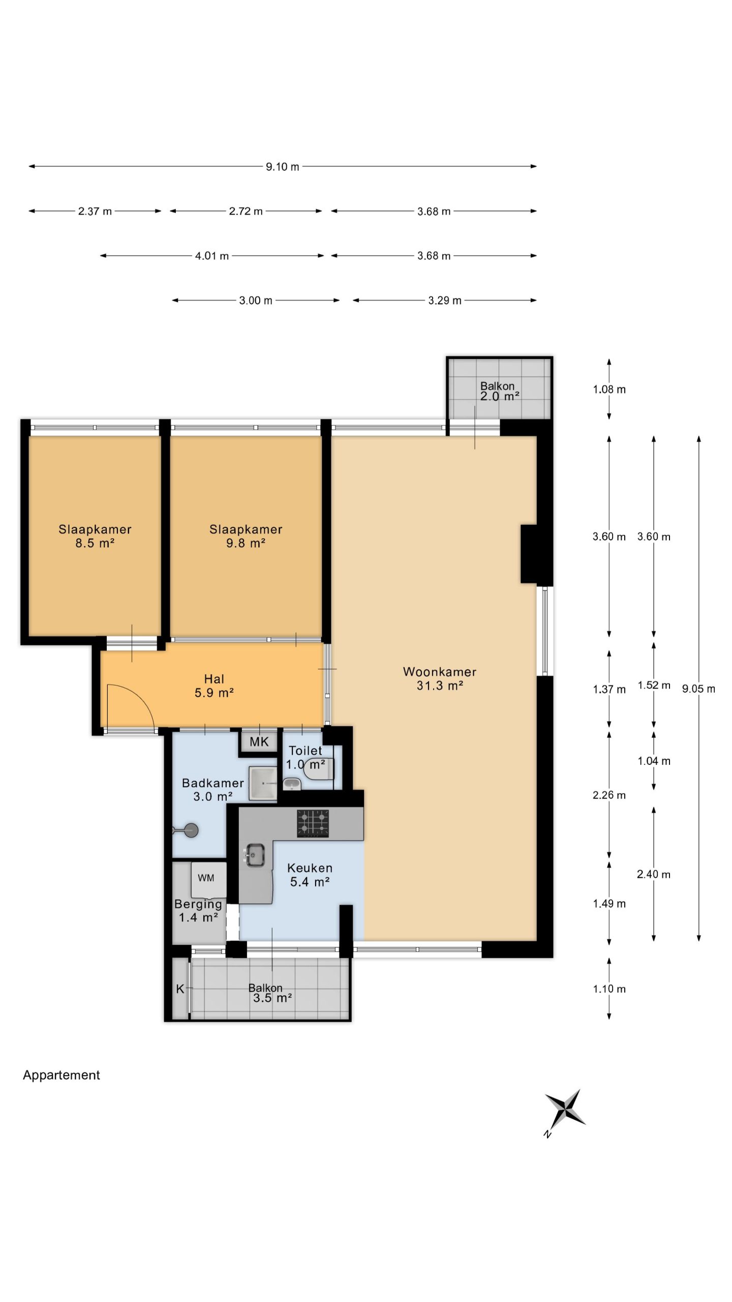 – Type 3-kamer hoekappartement