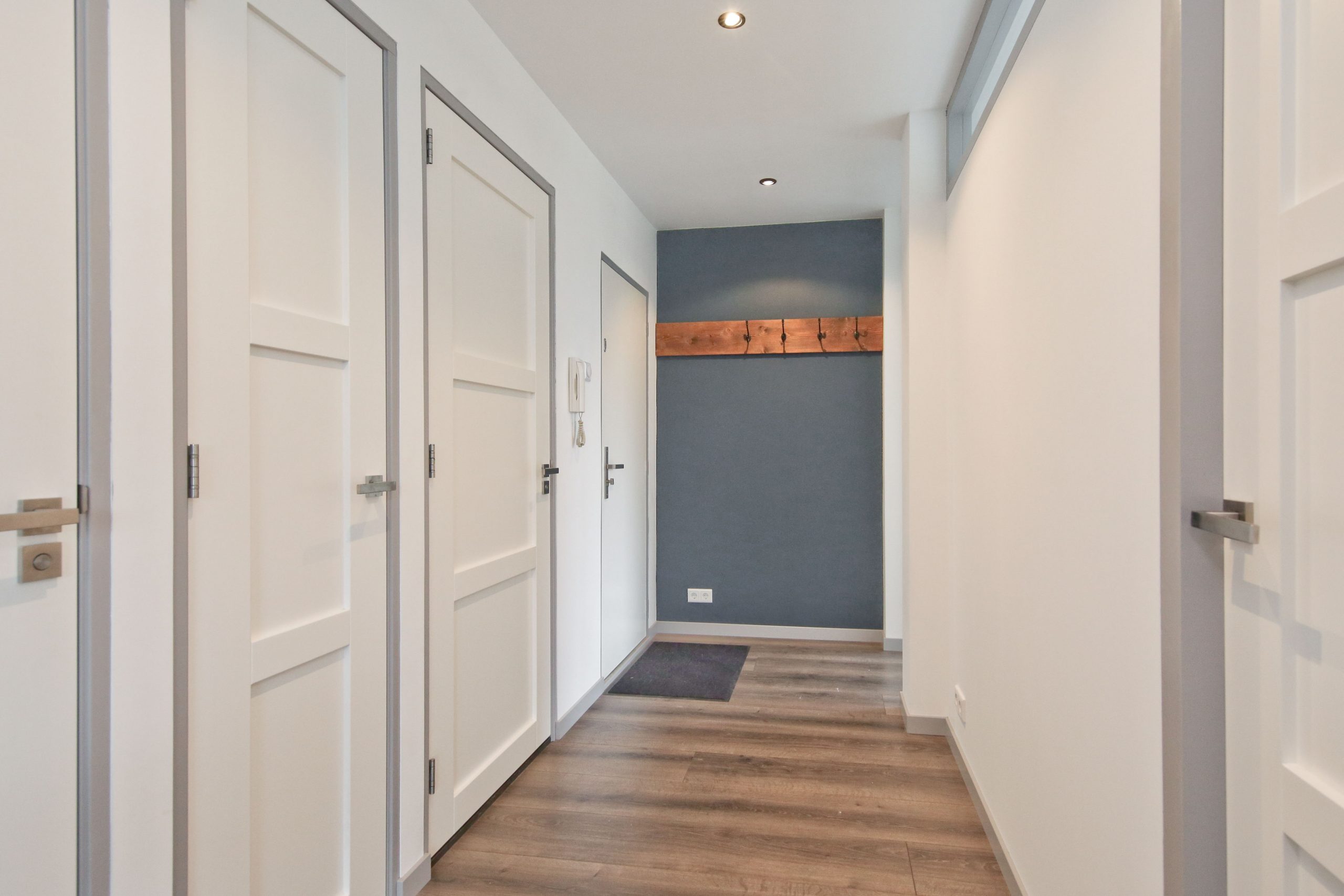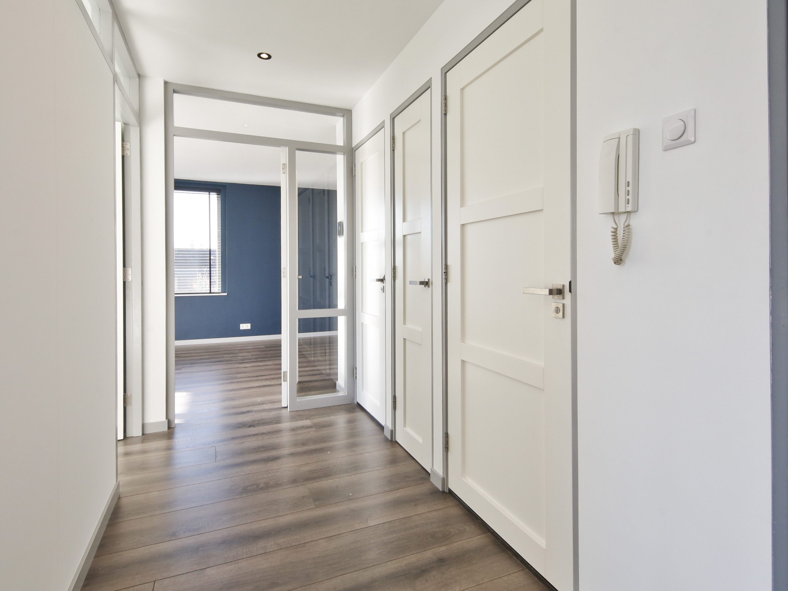 Gemeenschappelijke afgesloten glazen entree, centrale hal met bellenbord, brievenbussen en het trappenhuis.