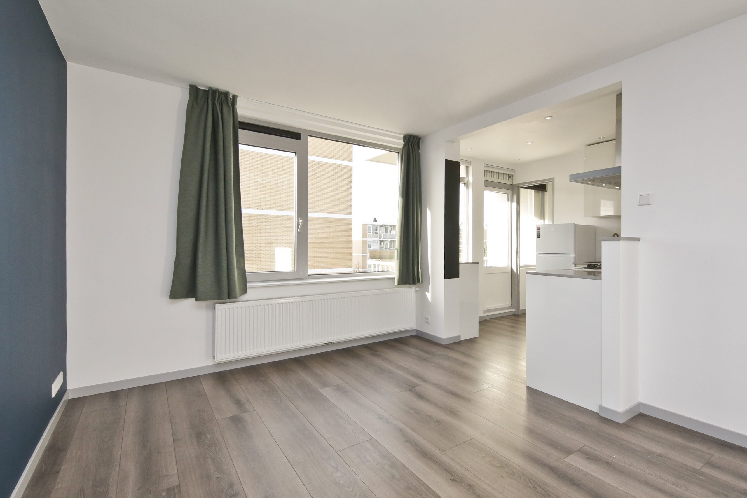 Dit frisse en ruime appartement van circa 71 m² heeft een living van 37 m² met een doorzonwoonkamer (voorheen twee kamers) met aan drie zijde ramen, een balkon, een half open keuken voorzien van inbouwapparatuur en een deur naar het tweede balkon. Aansluitend is daar een bijkeuken met de aansluiting voor de wasmachine.