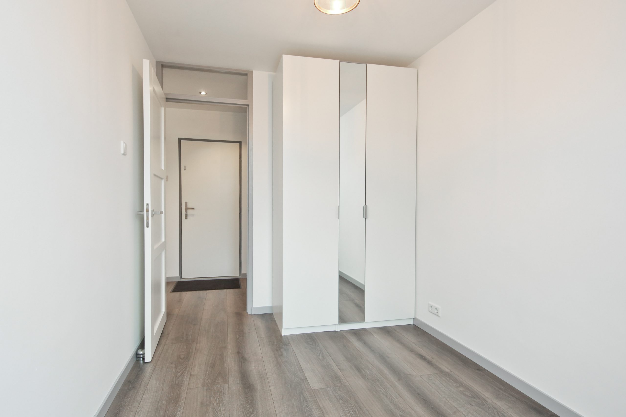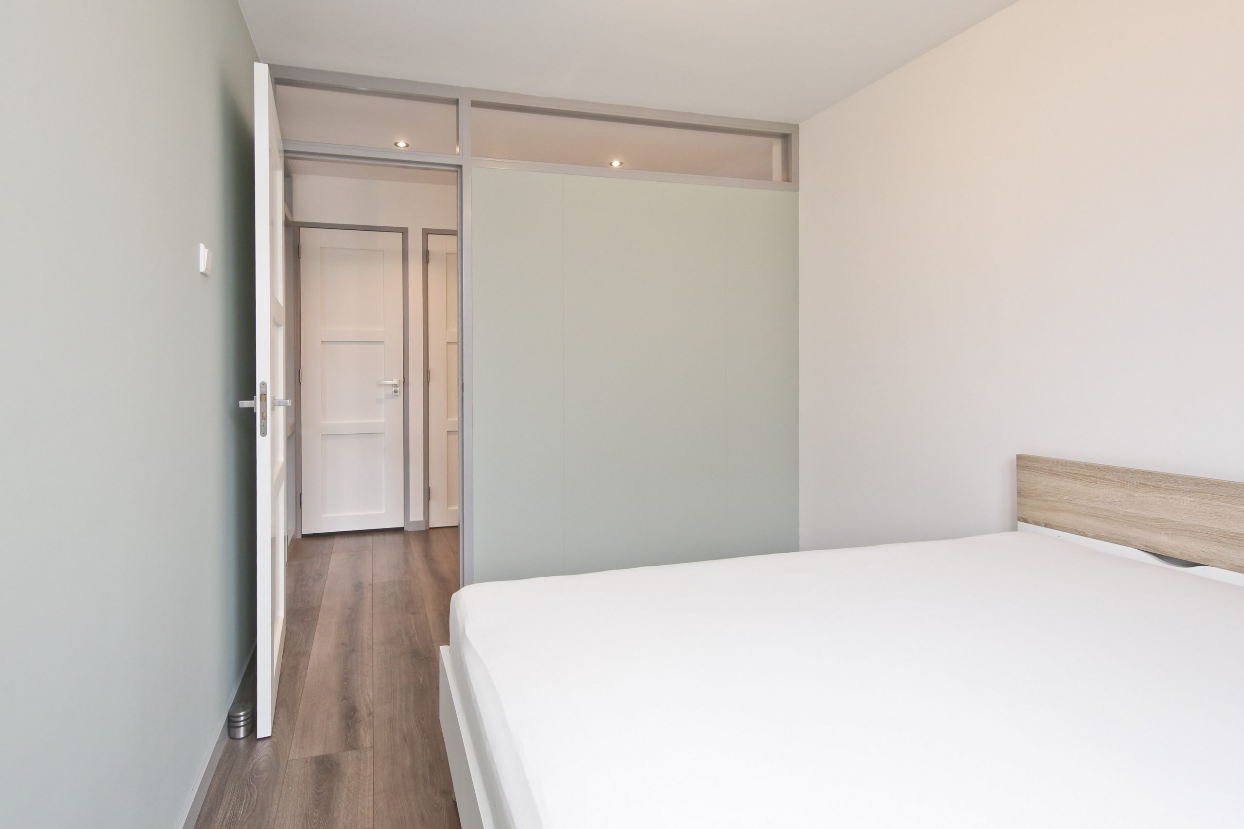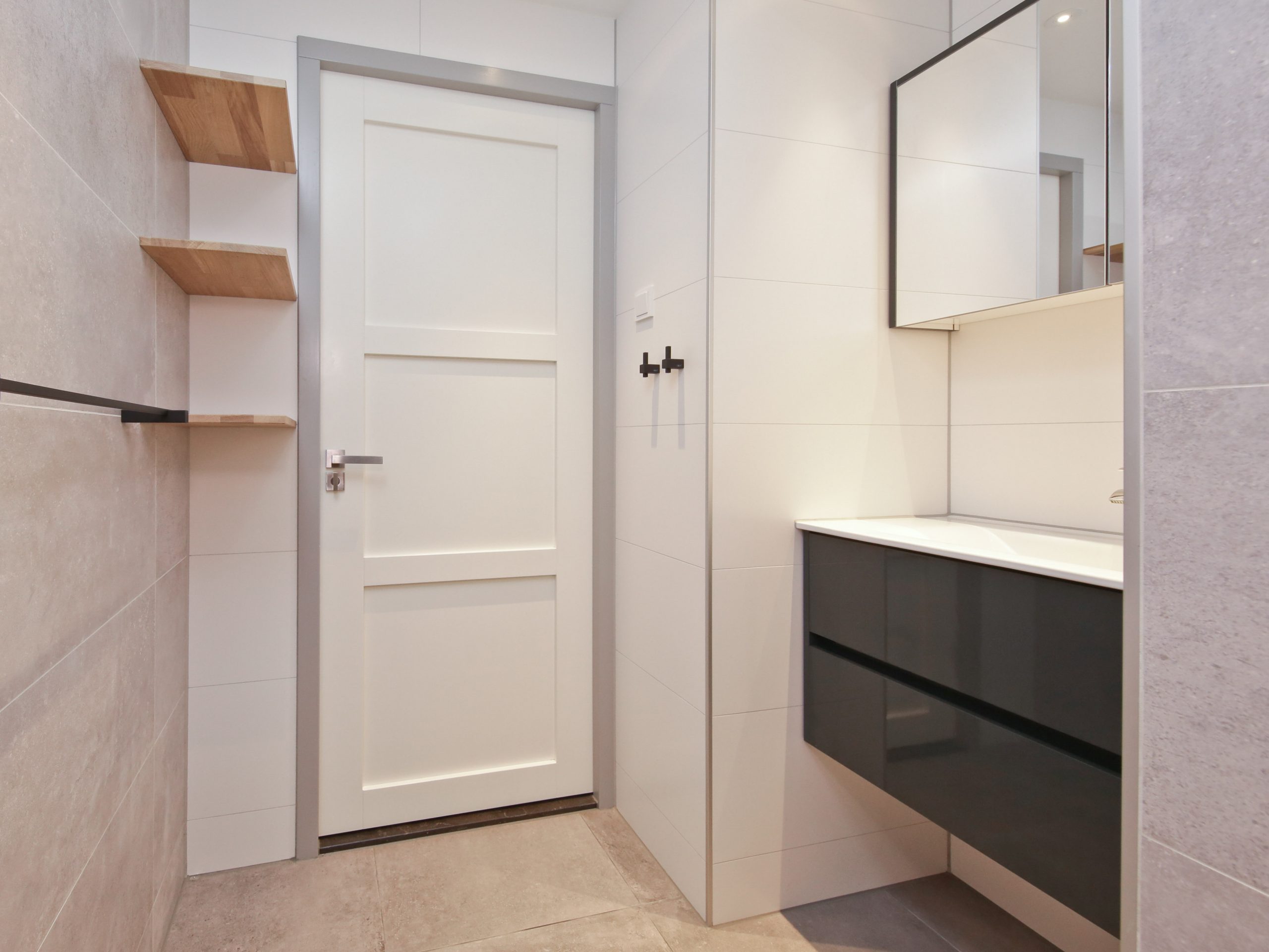 In de hal zijn de twee slaapkamers van 10 m² en 8,5 m² en een badkamer met inloopdouche en wastafel.