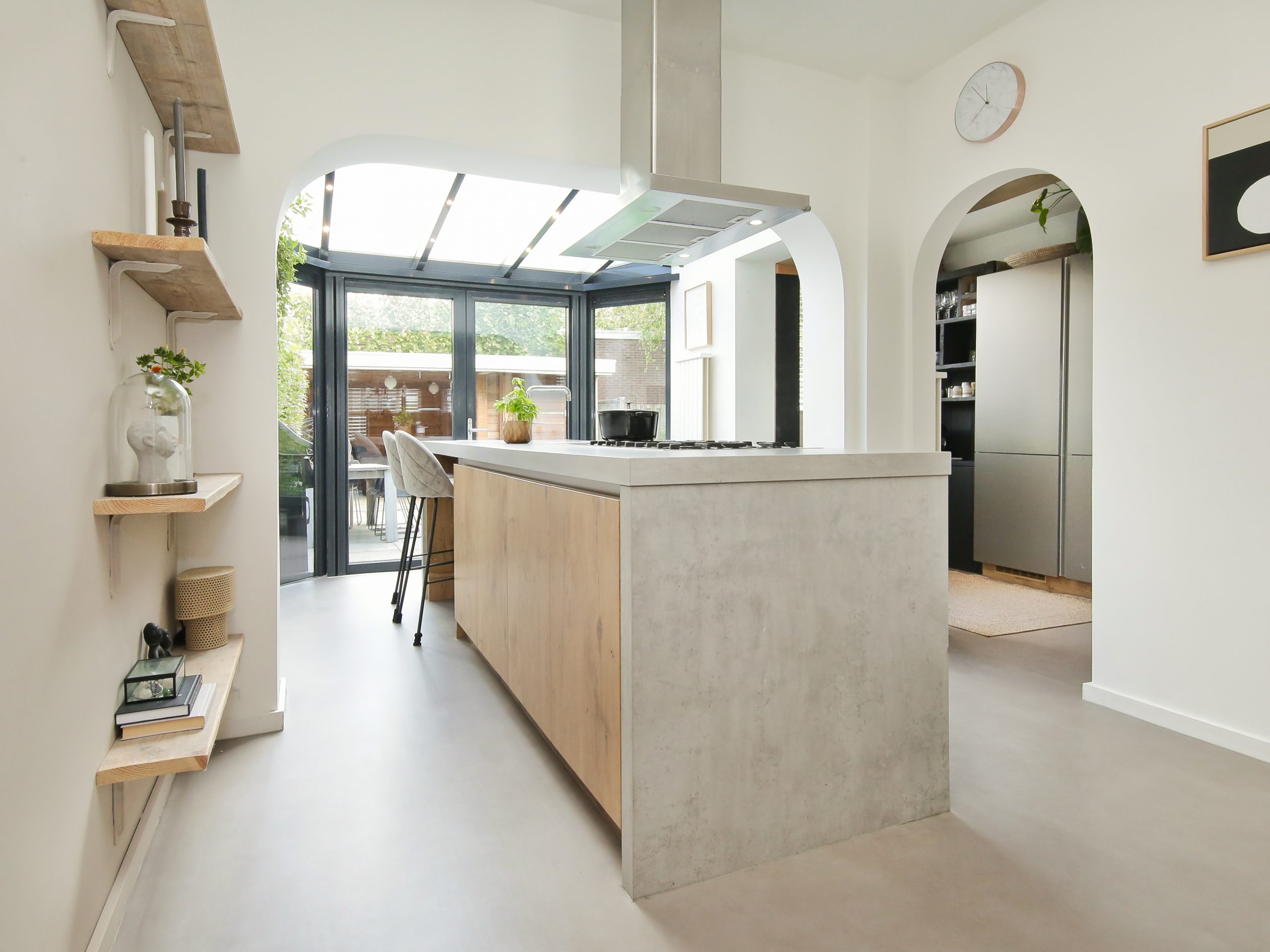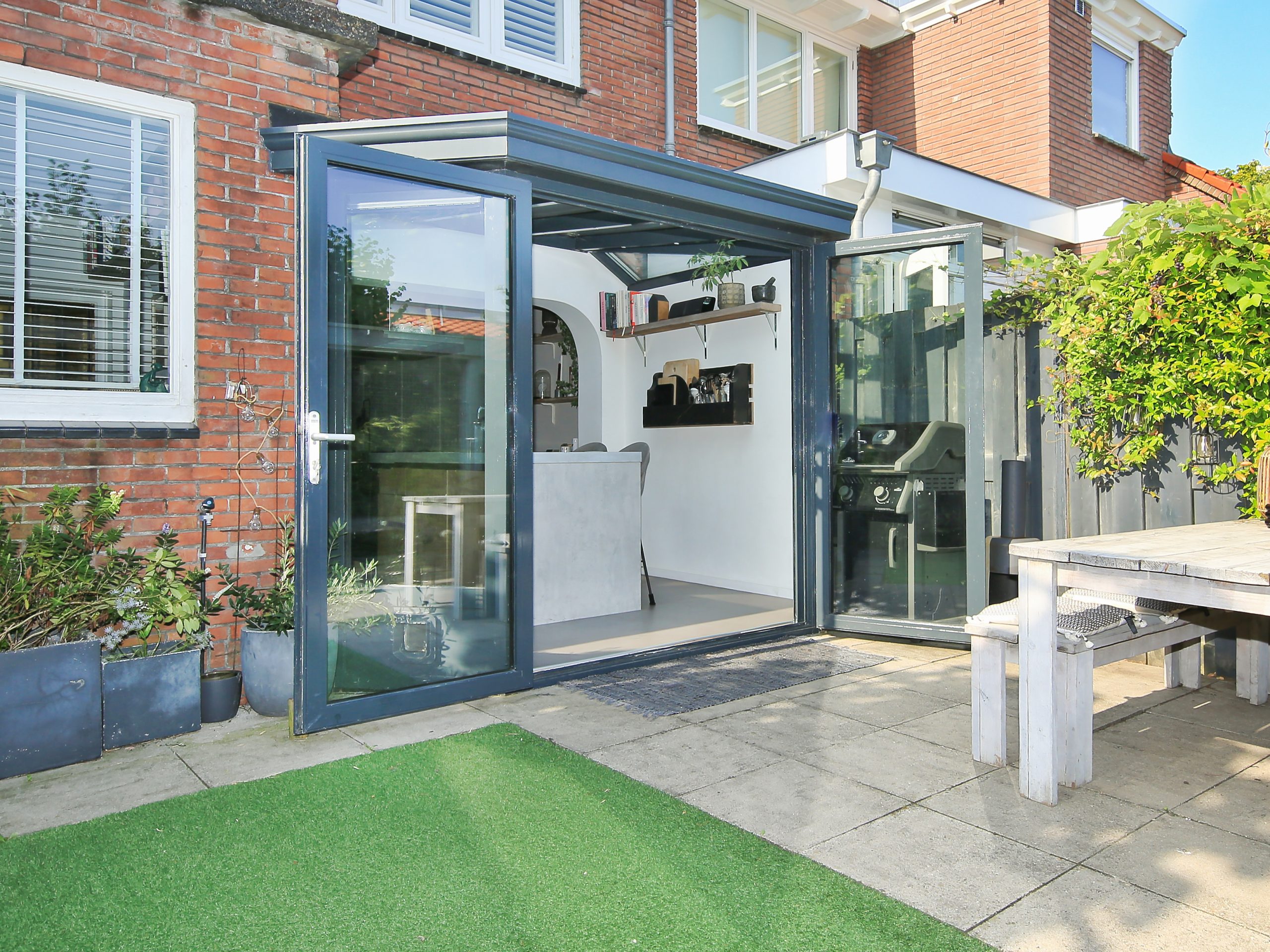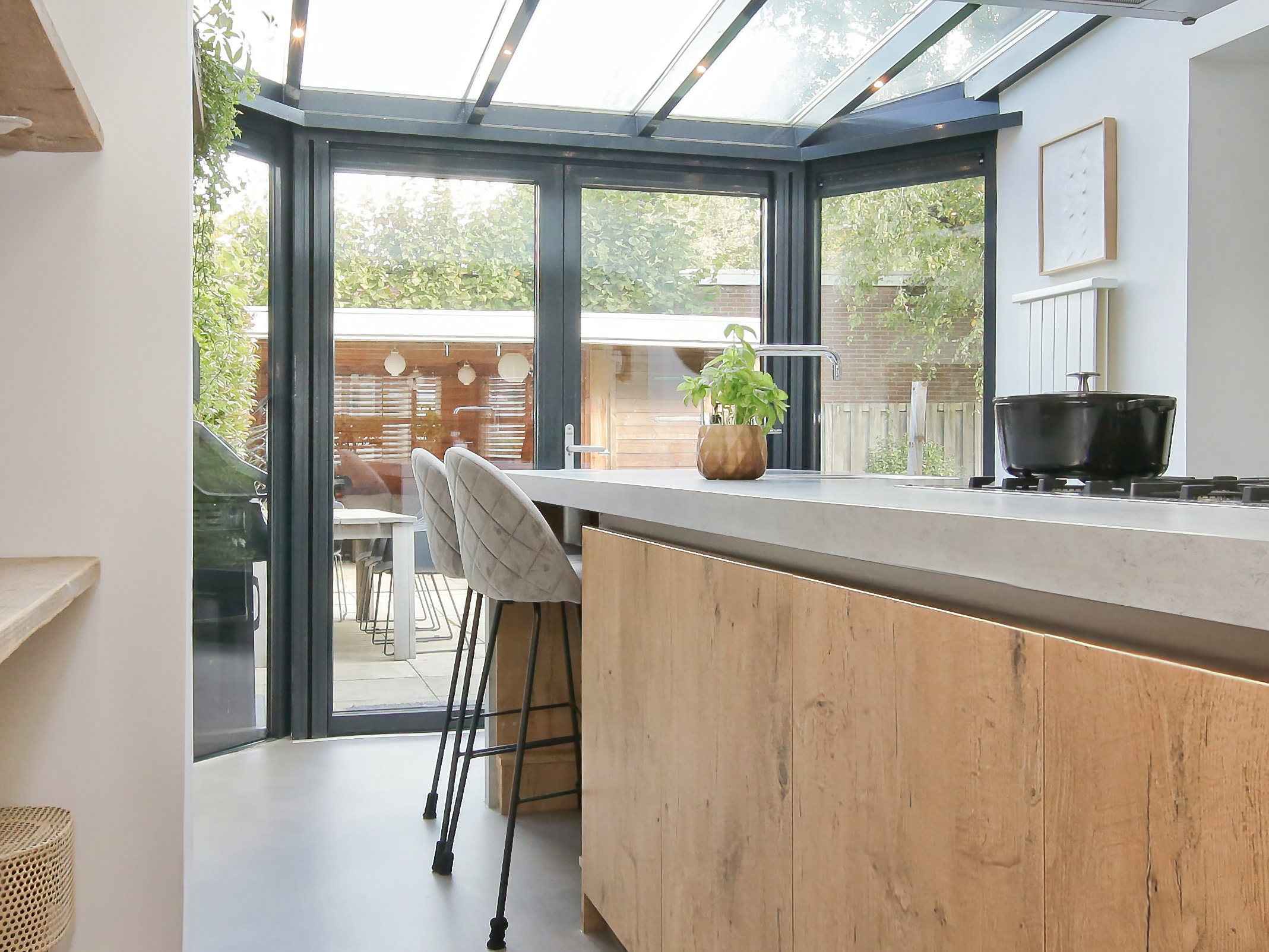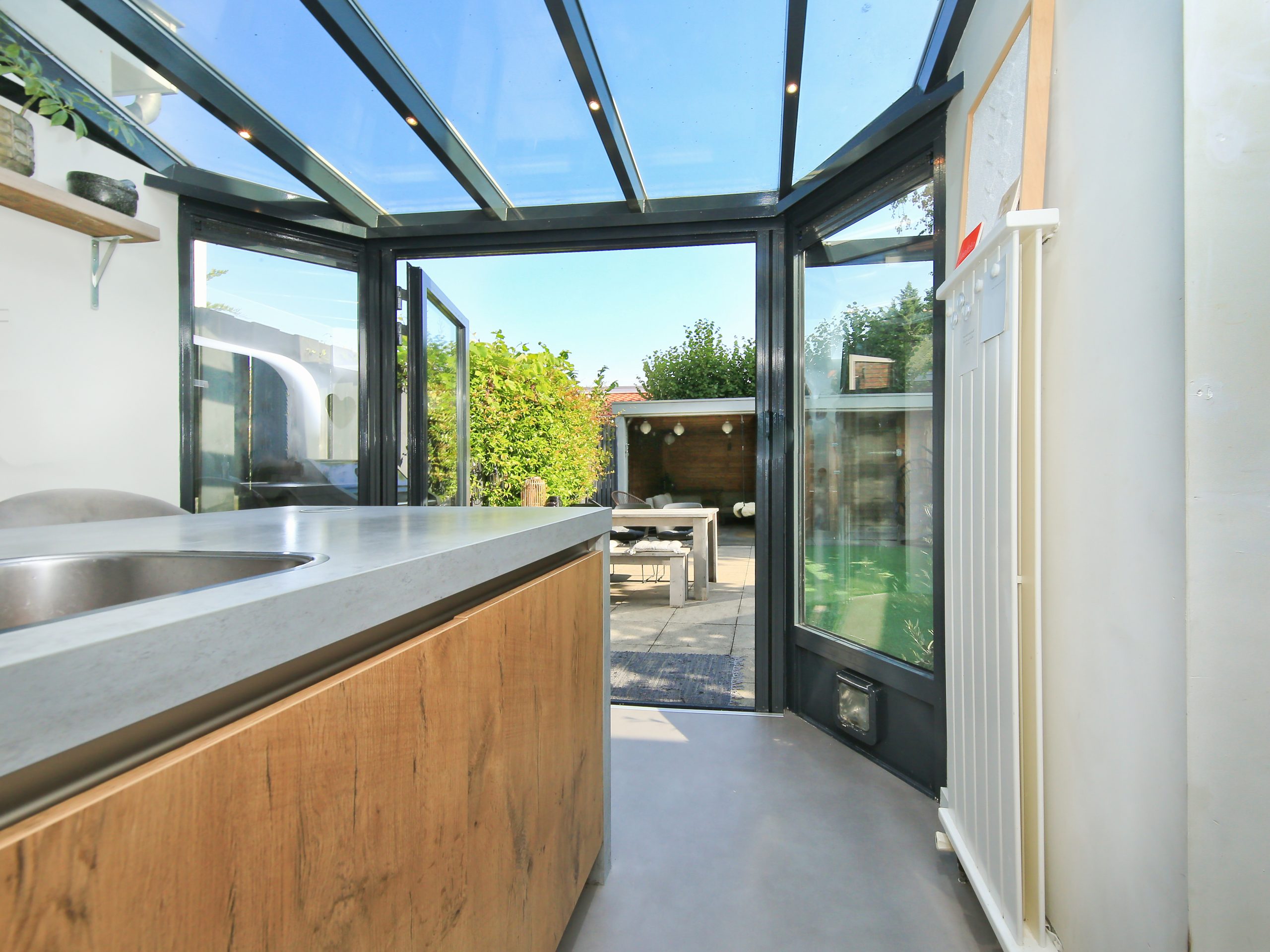 Via de verzorgde voortuin met fietsenoverkapping komt u binnen. Entree met meterkast, hal van circa 5 m² met trap naar de 1e verdieping met trapkast, garderobe en gastentoilet met fontein. Lichte woonkamer van ruim 25 m² met in de moderne aanbouw en serre aan de achterzijde, een design leefkeuken van ruim 17 m² met veel daglicht, een kook- en spoeleiland met bargedeelte, diverse inbouwapparatuur en een open bijkeuken met extra bergruimte. Vanuit de serre zijn er openslaande deuren naar de op het noordoosten gelegen achtertuin.