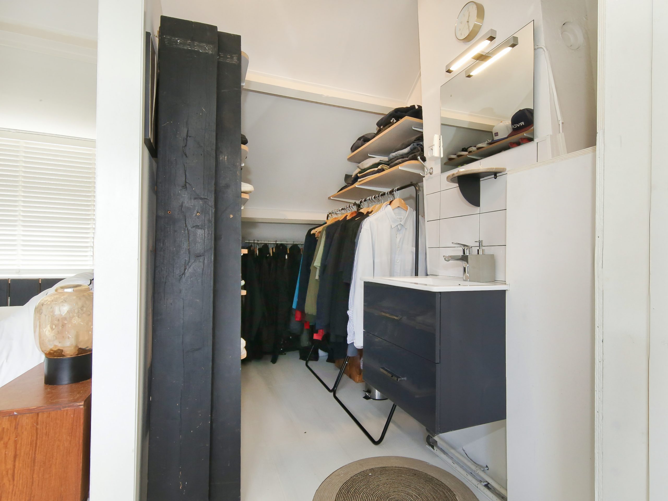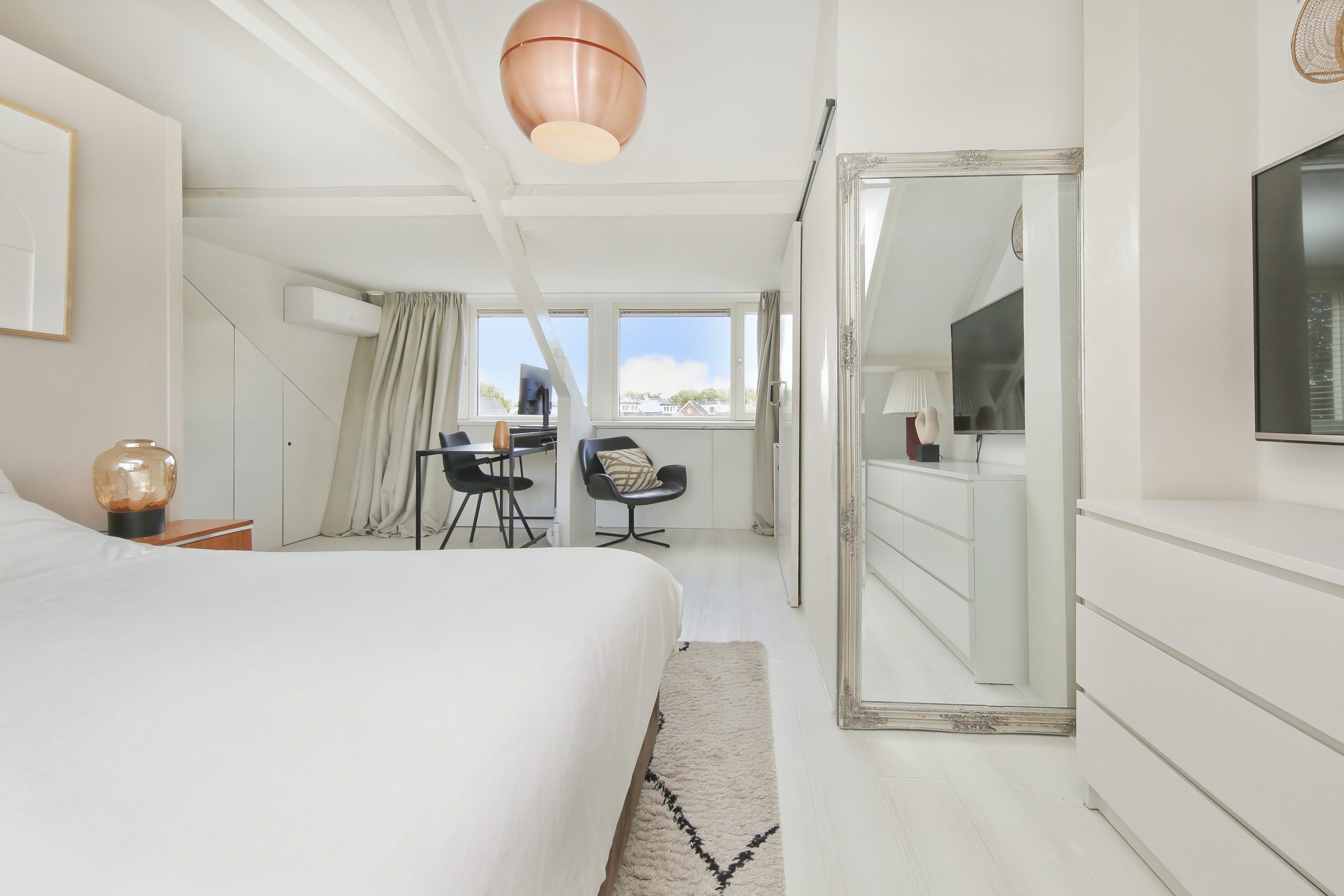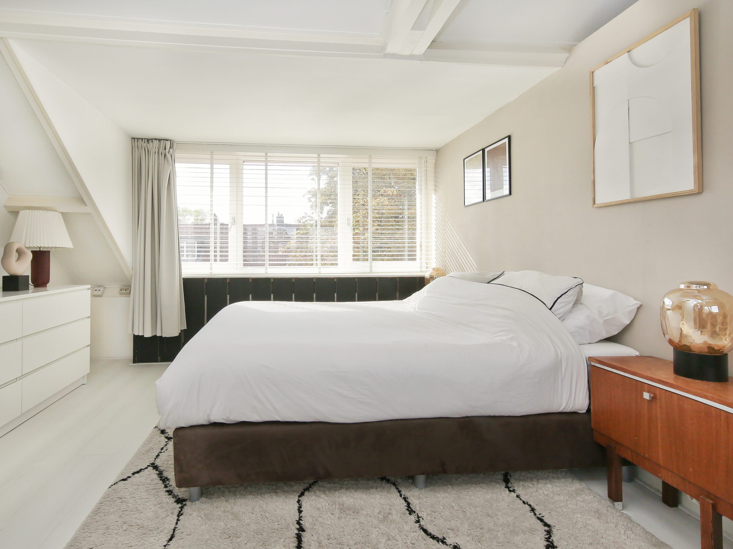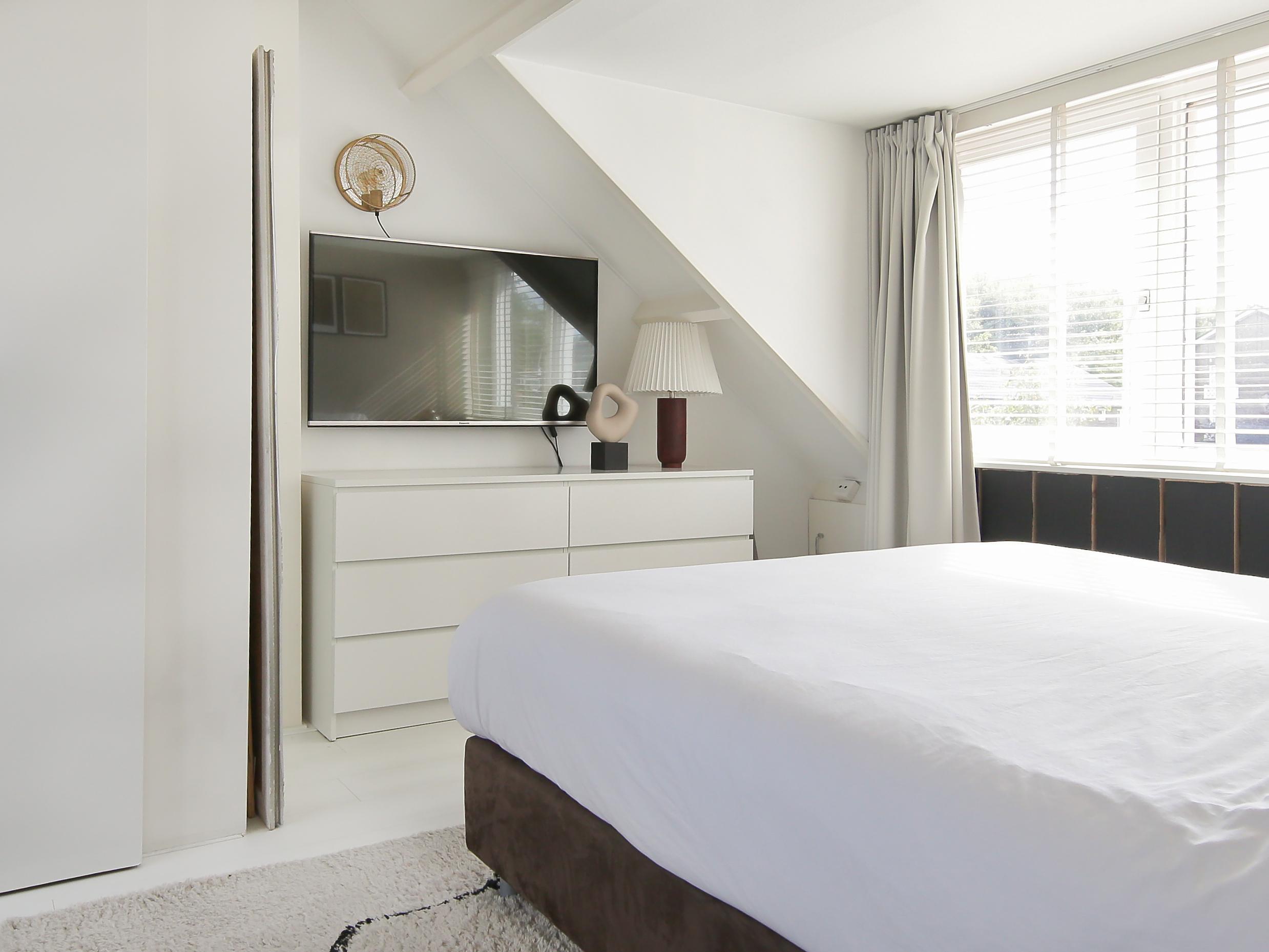Via de overloop bereikbare verrassend ruime masterbedroom van ruim 24 m² met twee dakkapellen, inloopkast, airconditioning, wastafel, vaste kast, bergruimte achter de knieschotten en een kast met cv-opstelling. Ook is hier nog ruimte voor een nette werkplek voor thuiswerken of als rustige retreat.