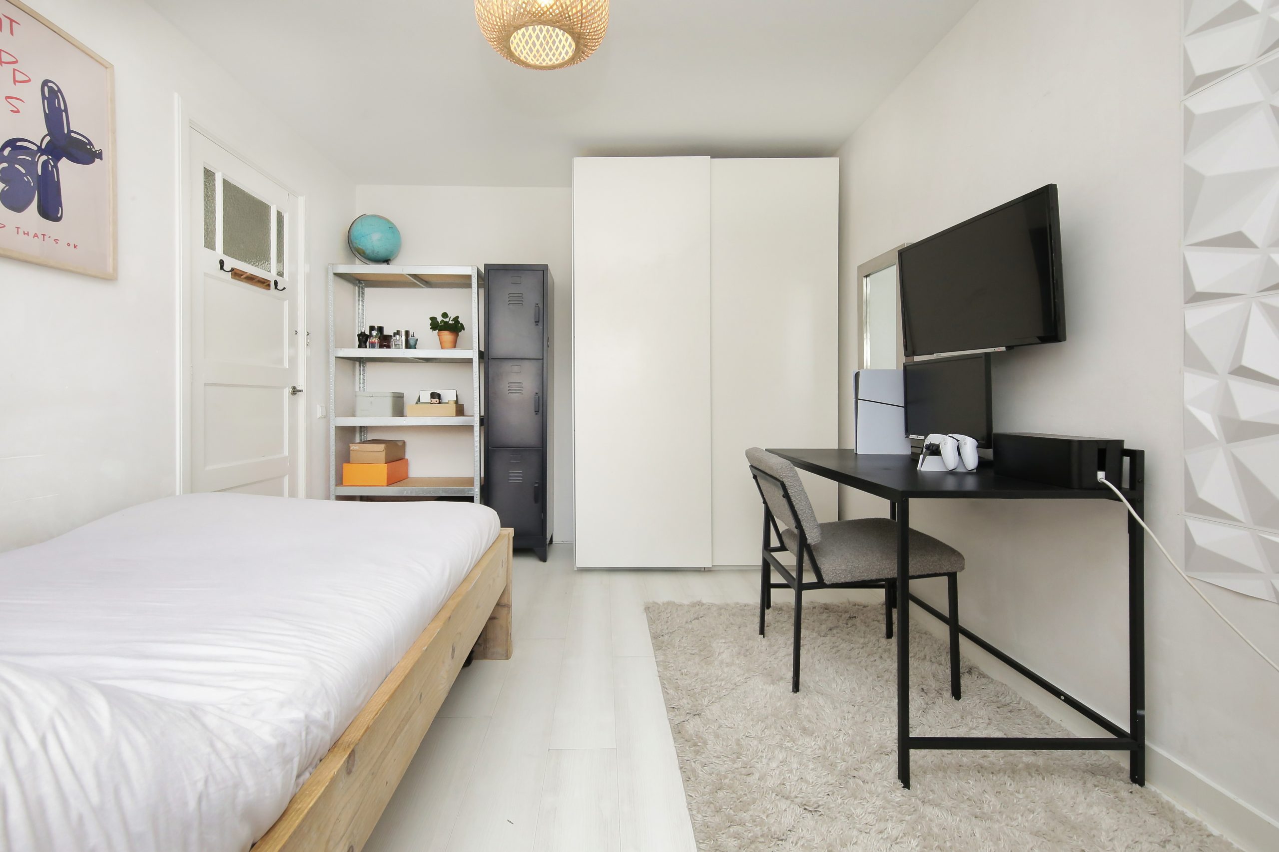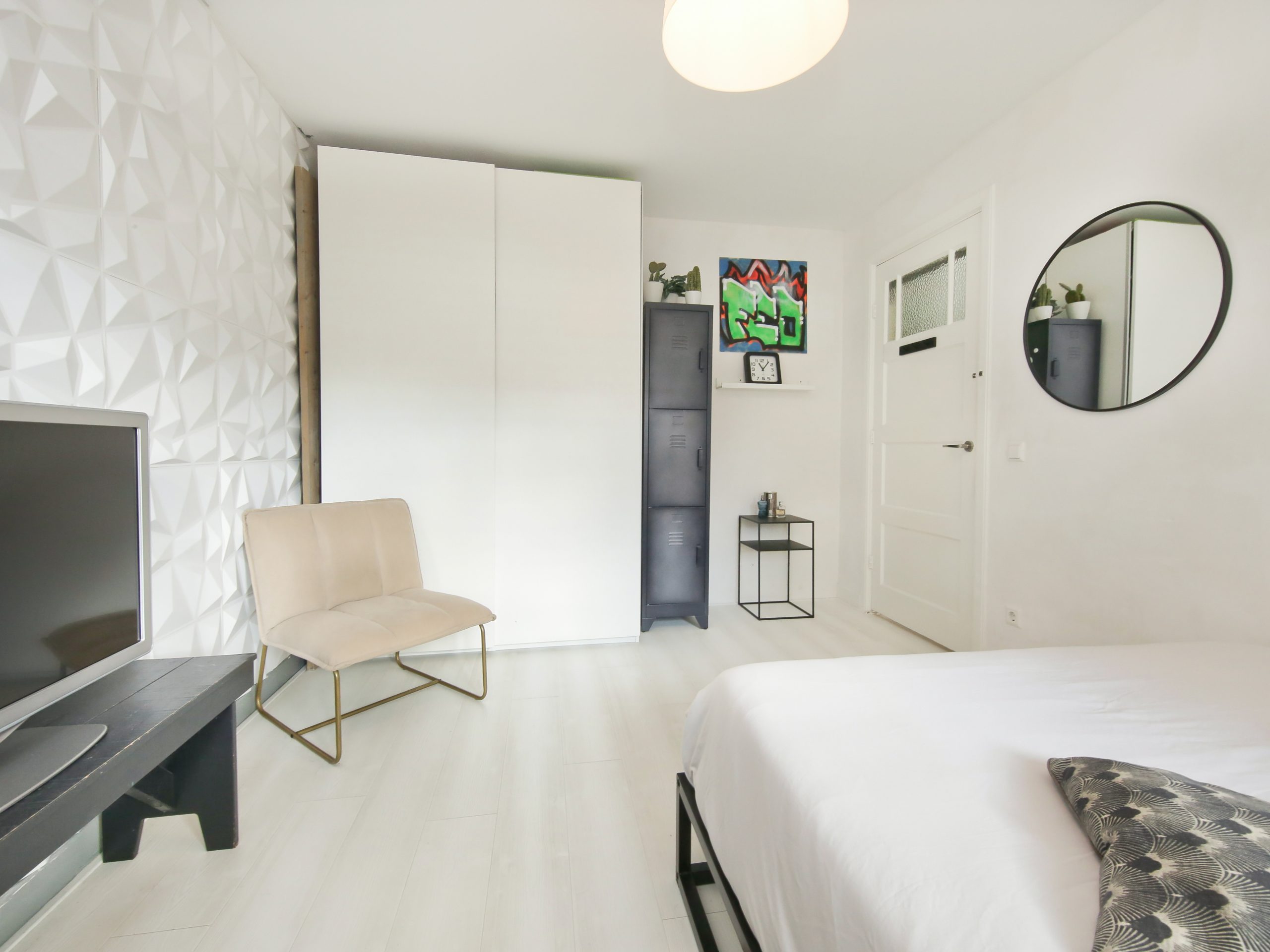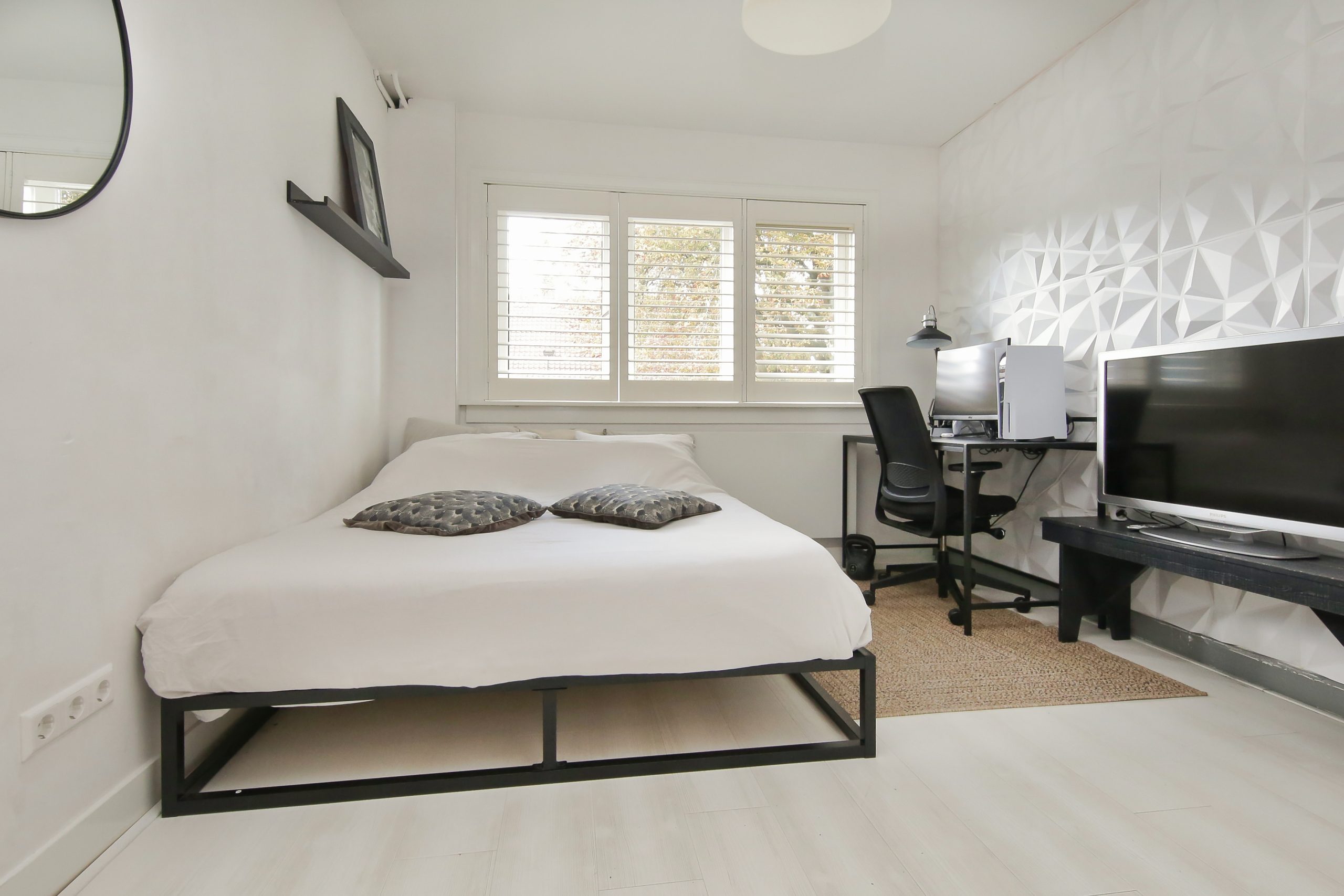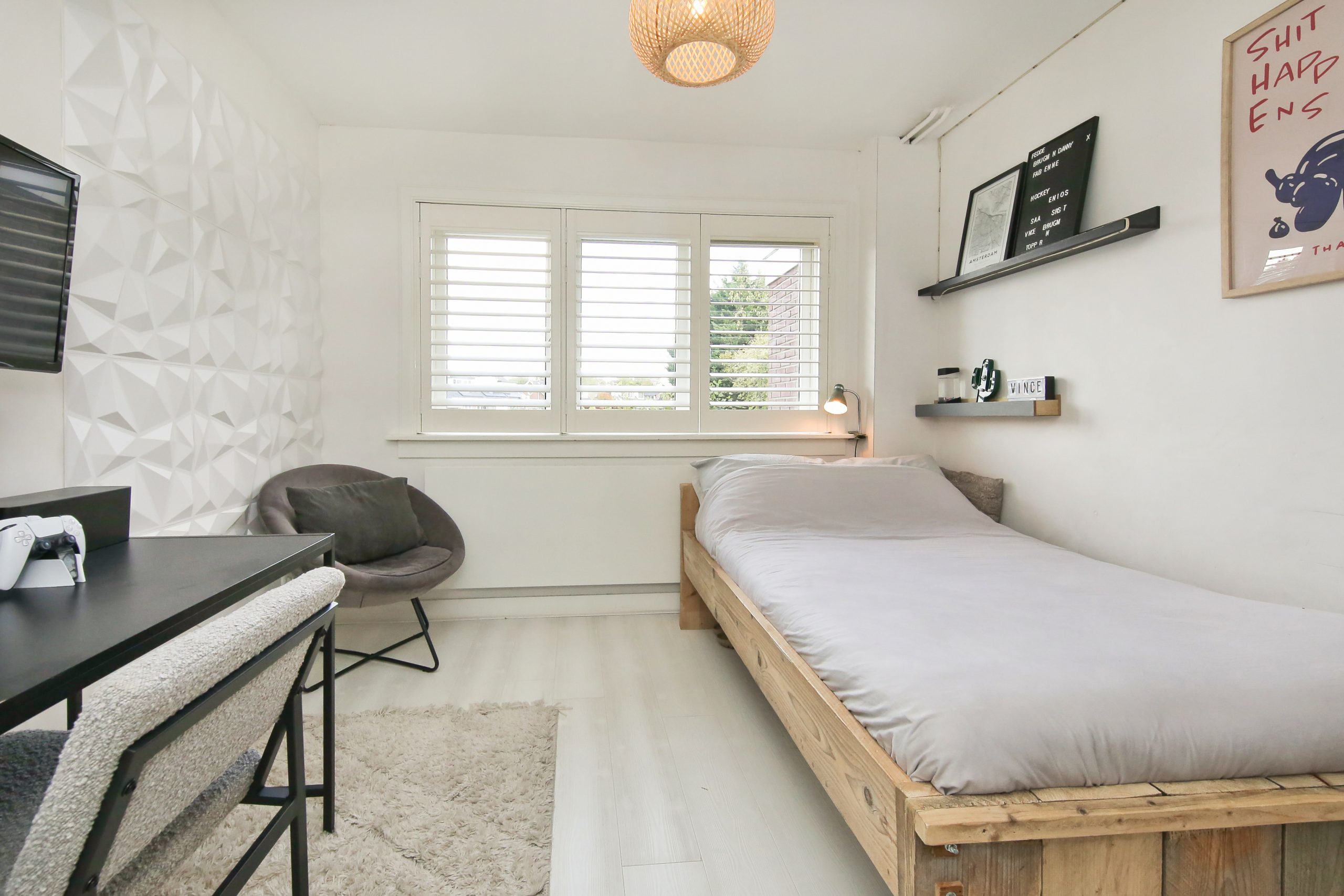 Via de overloop bereikbare verrassend ruime masterbedroom van ruim 24 m² met twee dakkapellen, inloopkast, airconditioning, wastafel, vaste kast, bergruimte achter de knieschotten en een kast met cv-opstelling. Ook is hier nog ruimte voor een nette werkplek voor thuiswerken of als rustige retreat.