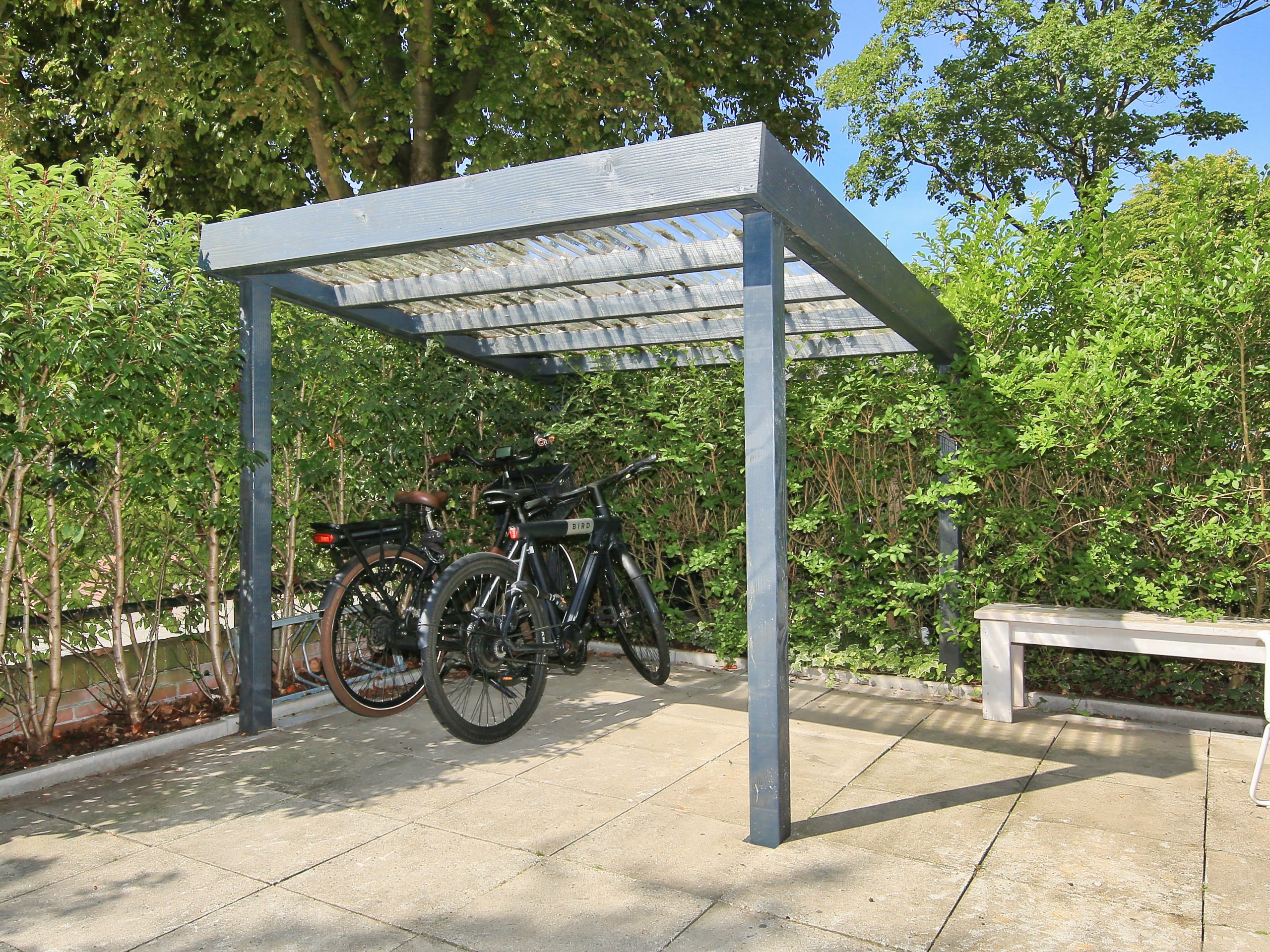 De voortuin is gelegen op het zuidwesten, circa 5,5 meter diep en circa 5,1 meter breed en voorzien van tegels met een perk met vaste planten en een overkapping voor de fietsen.