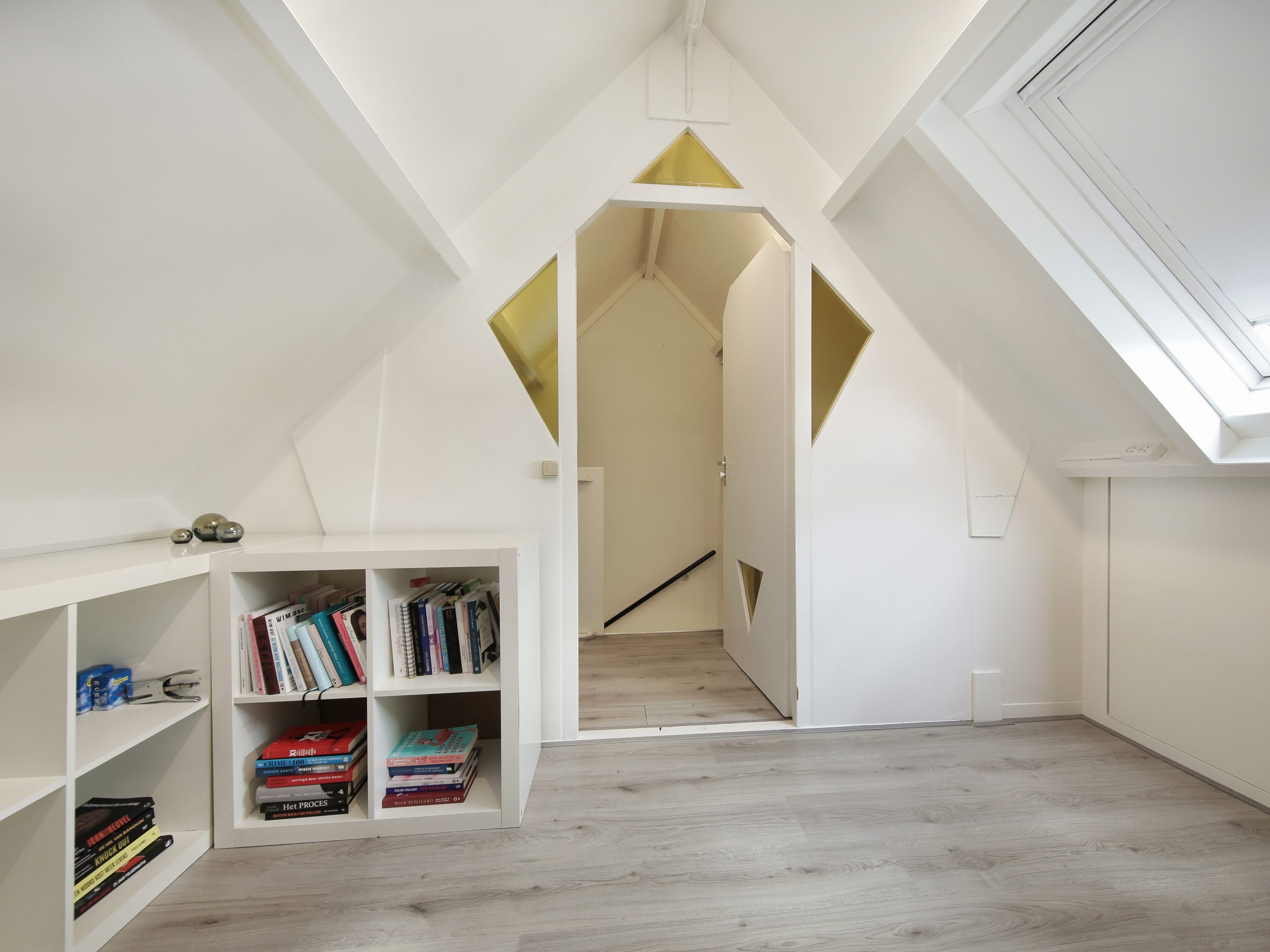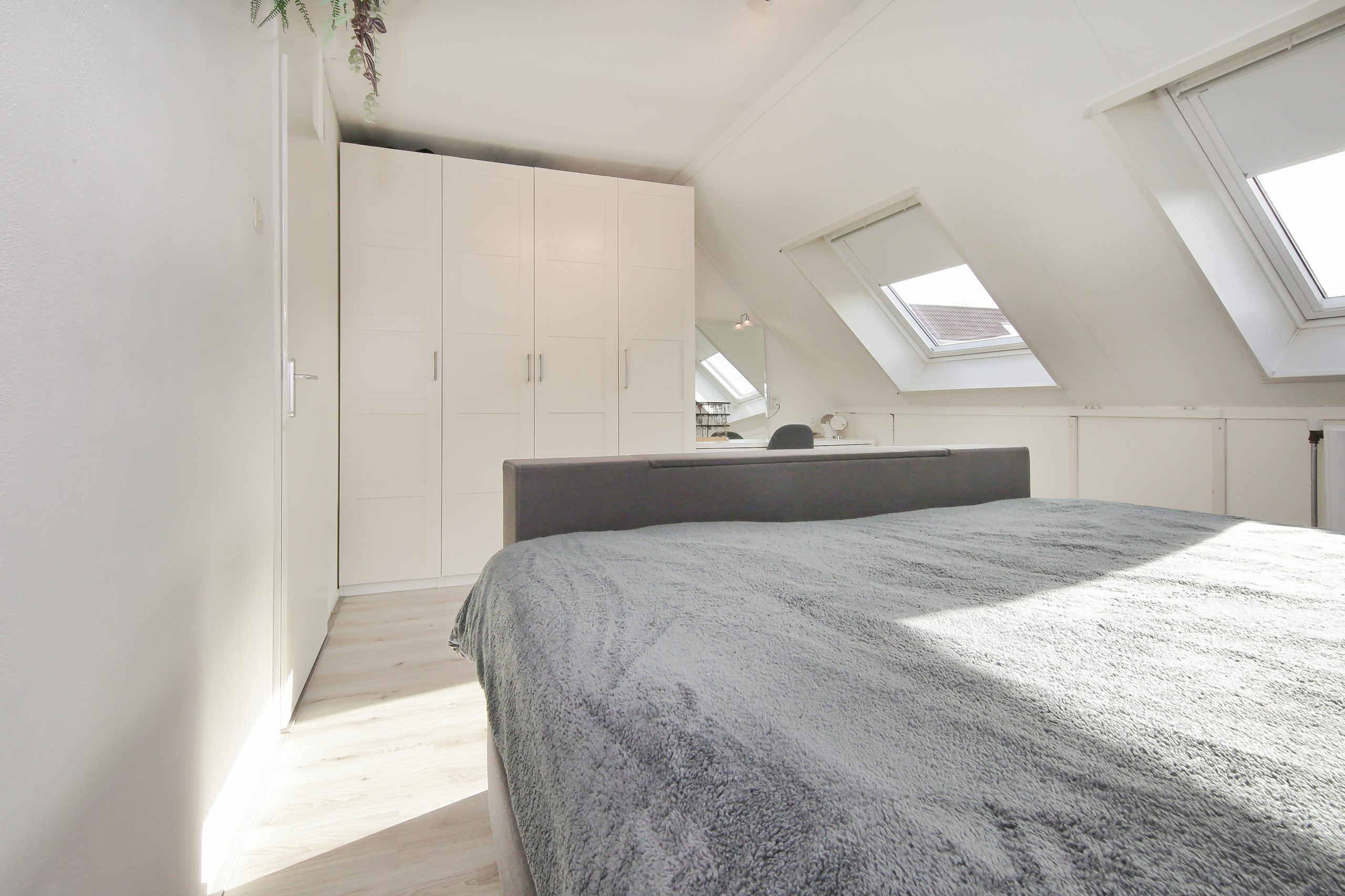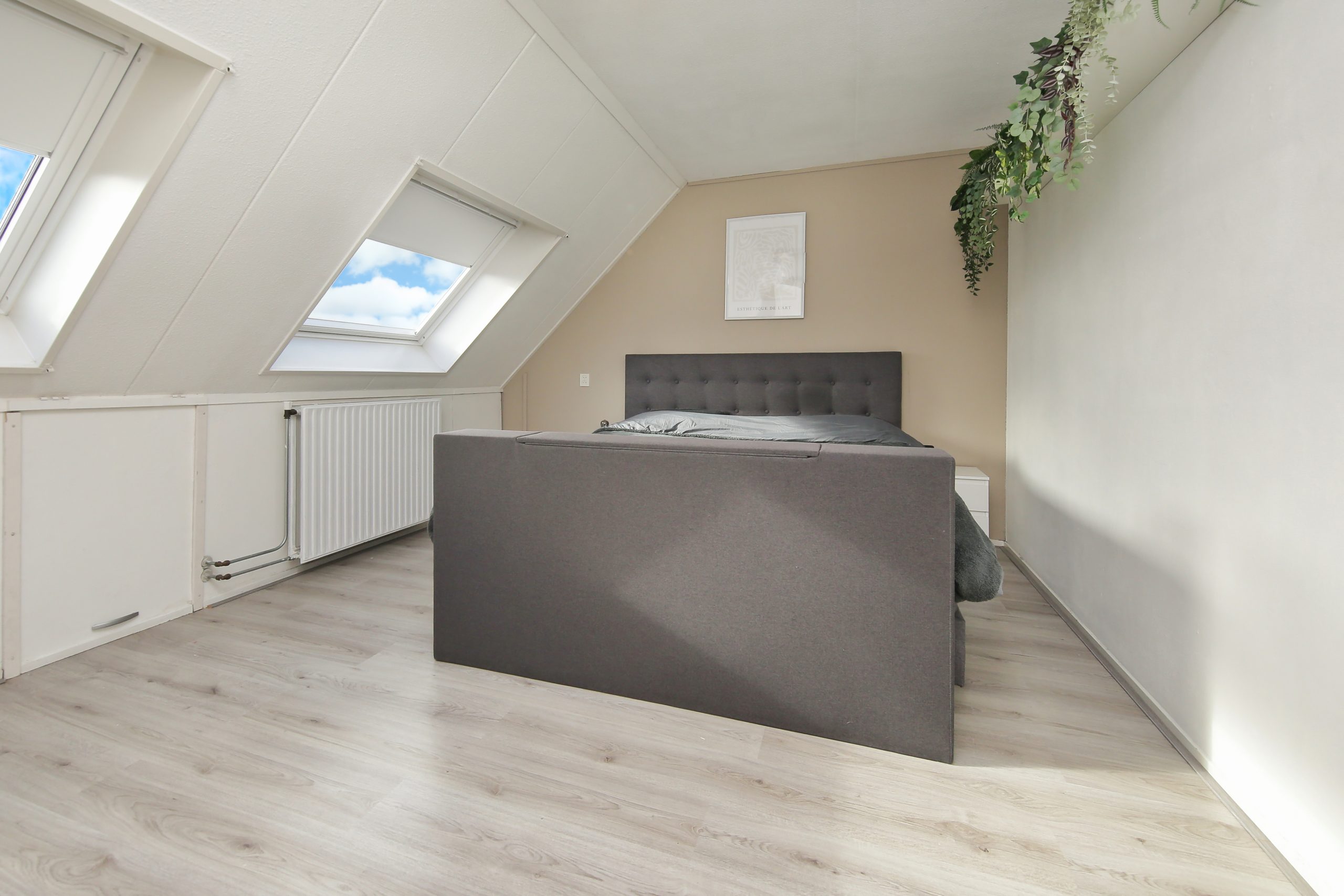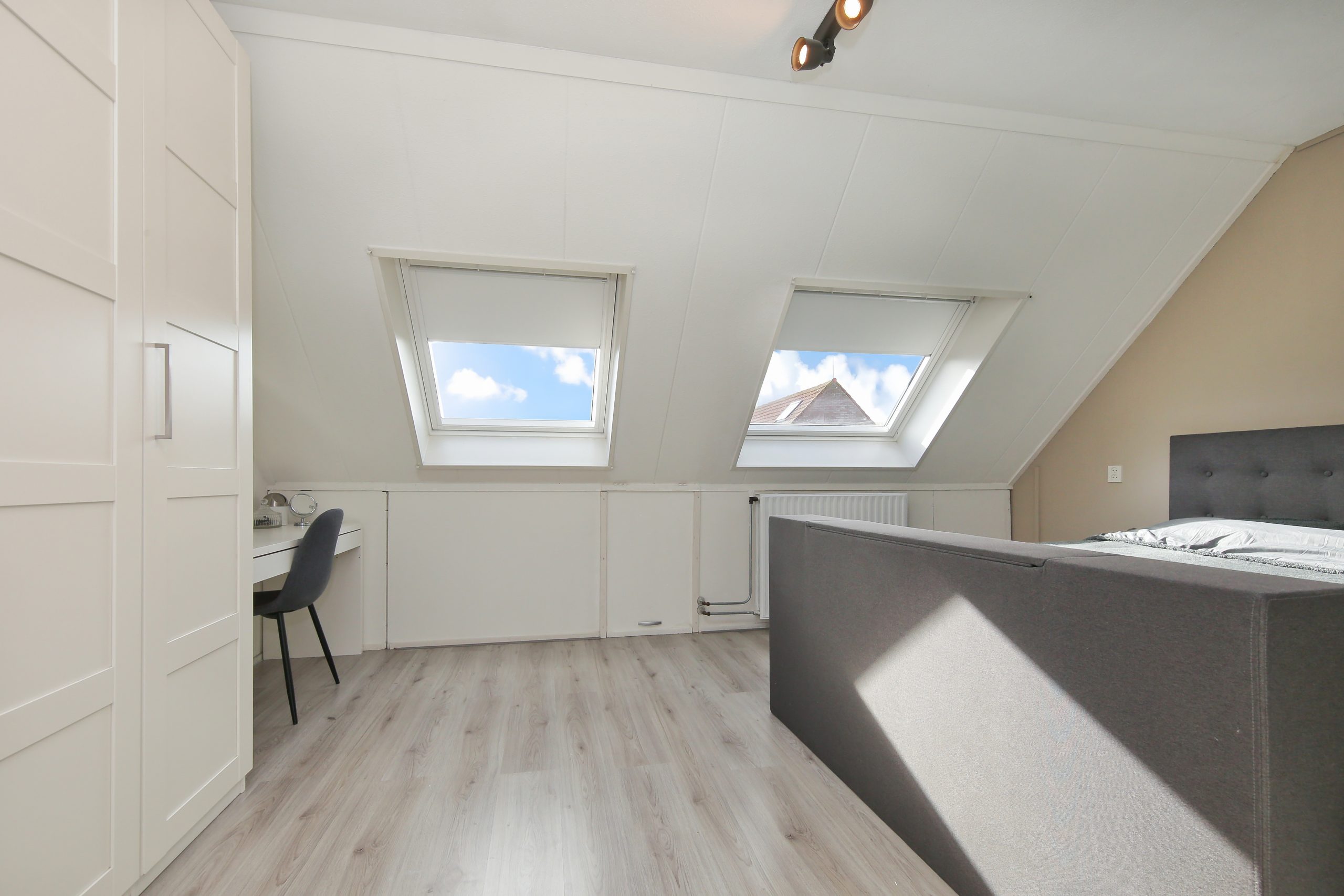 Overloop met deuren naar alle vertrekken. De ruime hoofdslaapkamer (circa 14 m²) ligt aan de achterzijde en heeft twee grote dakramen die veel licht binnenlaten. Daarnaast is er volop bergruimte achter de knieschotten. De tweede slaapkamer van bijna 12 m² is gelegen aan de voorzijde voorzien van een dakraam en inbouwkasten, de badkamer van 4 m² heeft een inloopdouche, wastafelmeubel en zwevend toilet.