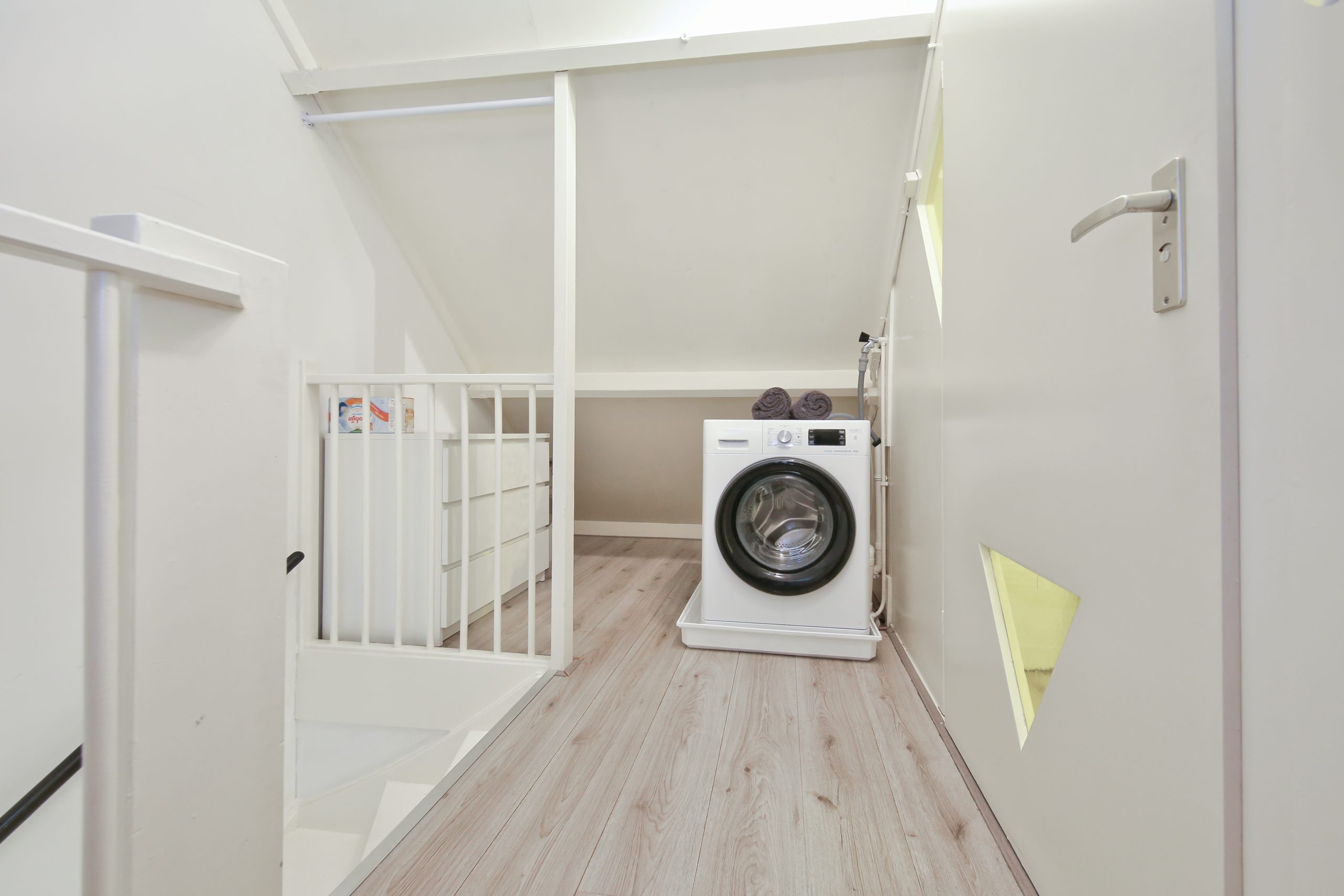 Ruime overloop met opstelling wasmachine en droger, de mechanische ventilatie unit en de derde slaapkamer van bijna 7 m² met dakraam.