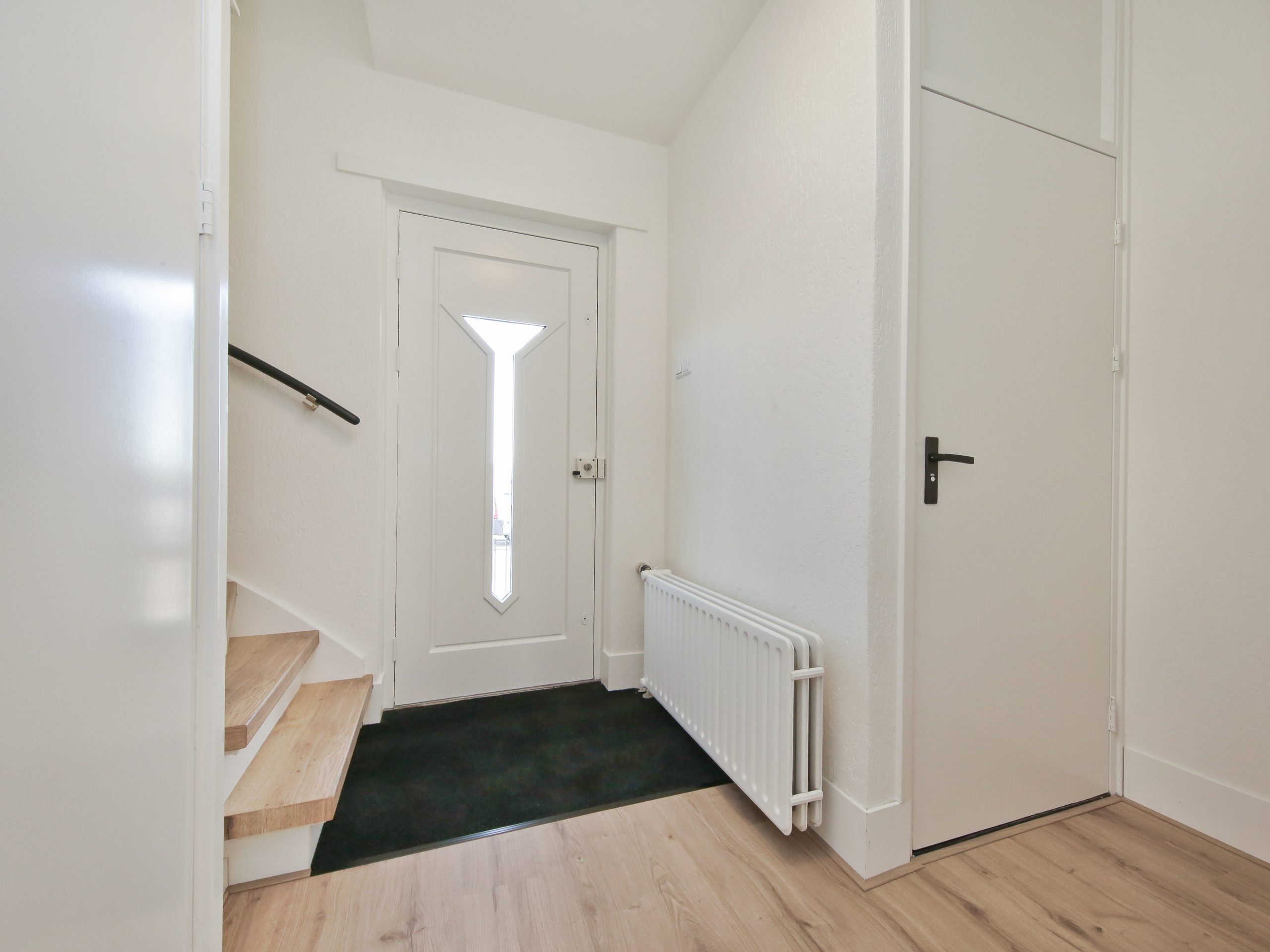 Entree, hal met meterkast, trap naar de 1e verdieping met trapkast en een toilet met fontein.